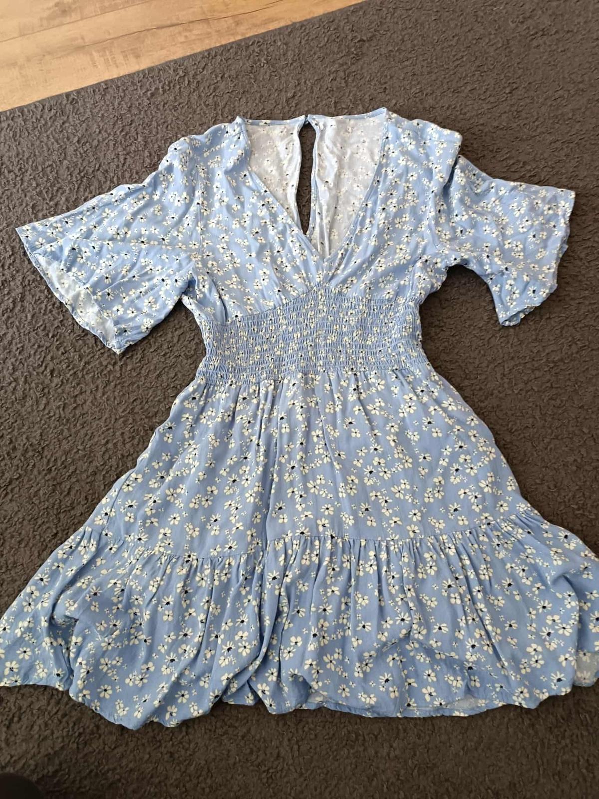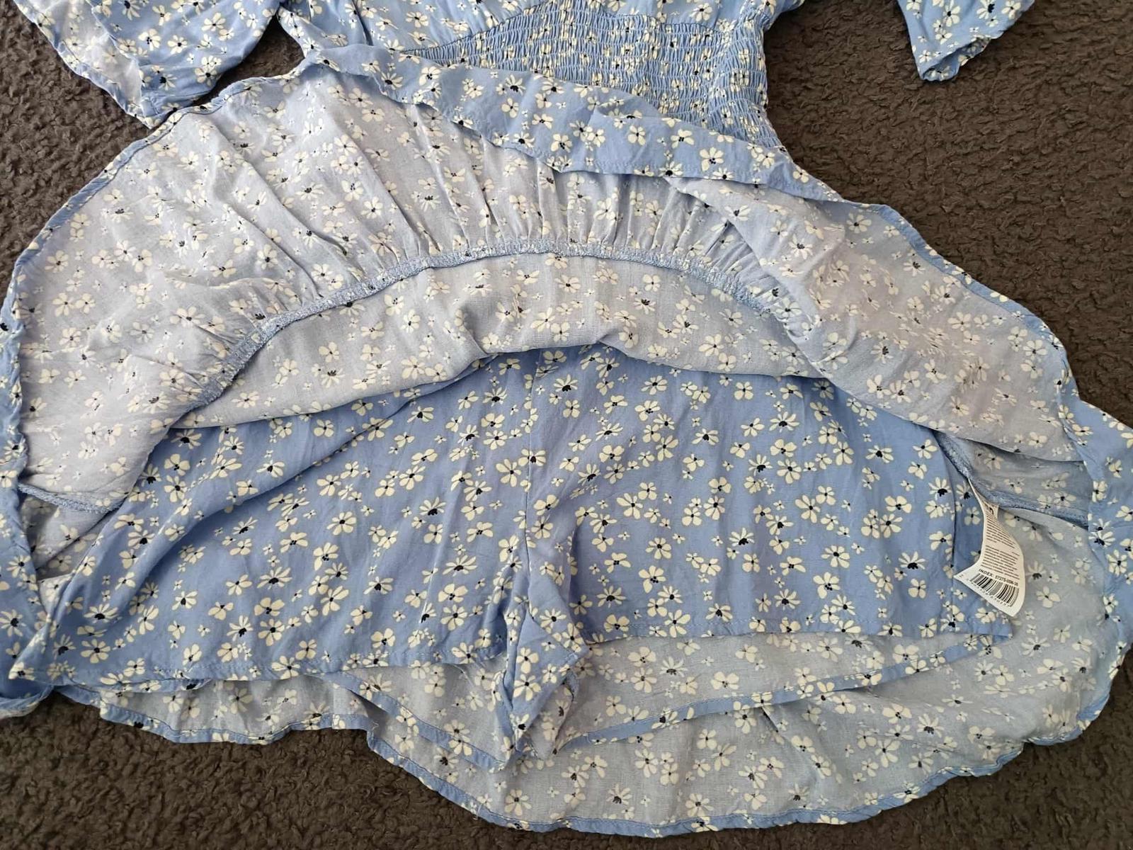 Výstrih do V, široké krátke rukávy, volánikový spodok, nohavicový štýl, 100% viskoza, značka CROPP, veľkosť 36, v páse je gumička prispôsobia sa.