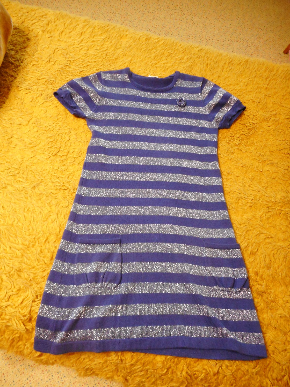 predám používané, nepoškodené pekné dievčenské šaty s krátkym rukávom s hrejivej pružnej pleteniny na prechodné obdobie, veľkosť odhadom 134cm, peknej modrej farby, ktorá sa v pásoch strieda so striebornou farbou, v spodnej časti šiat sú dve malé vrecká, na hrudníčku pekná ozdoba malej kvetinky, šatočky sa dajú využiť aj ako tunika, nakoľko sú rovného strihu , možnosť obliecť niečo aj pod ne, obliekanie cez hlavu, celková dĺžka šiat je 73cm šírka pod pazuchami je 35cm