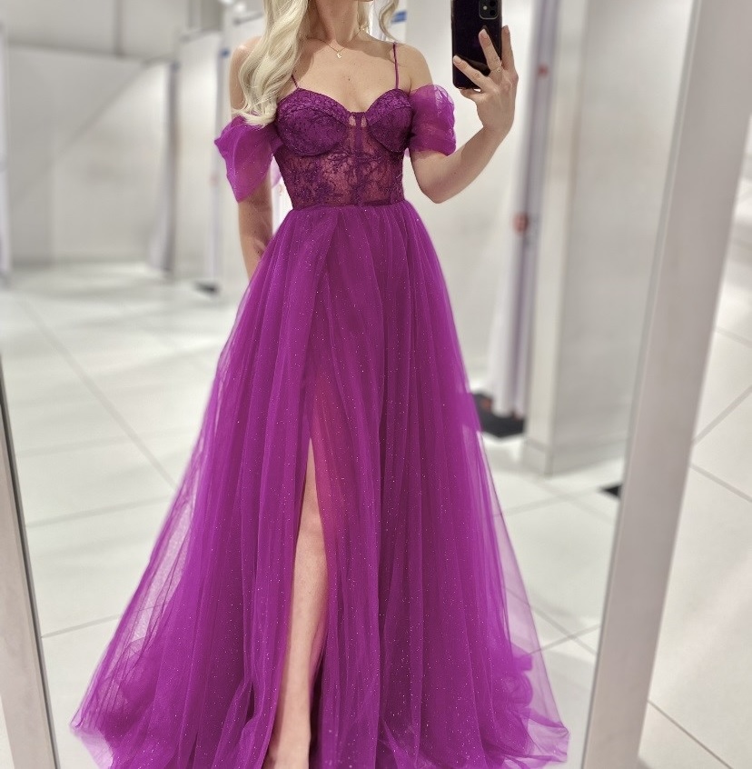 Ponúkam na predaj. Krásne dlhé večerné šaty bohato zdobené výšivkou a dekoráciami v podobe trblietavých kryštálov. Krásne zvýrazňujú ženské tvary. Šaty krásne odhaľujú chrbát - španielska čipka. Snov maxi dlhé šaty majú samostatné ramená a zdobené vrchné diely. Dodáva to krásny efekt a kryštály sú na bezpečnej strane. Zúžená v páse vyrobené výrazné pásy. Každá stránka má svoju vlastnú štruktúru, v závislosti od vašich požiadaviek. Šaty majú vpredu všité košíčky, takže nemusíte nosiť podprsenku. Šaty sú vynikajú voľbou na svadbu, ples, Silvestra a iné elegantné špeciálne udalosti. Šaty boli raz použité, vyčistené, bez chýb. Dokonalej farbe magenta.