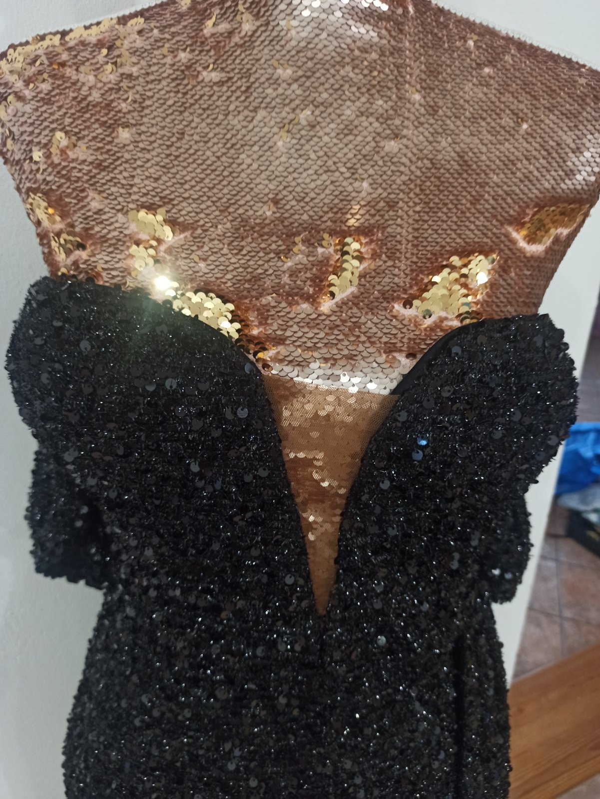 Top stav, krasne pevne šaty, latka hrubsia pevna ale ma elastan cize aj poddajna kde treba, vpredu 2 vrecka, vzdaku na zips, okolo krku vykladane krasne čierne kamienky balene v stužke, su kusok na...