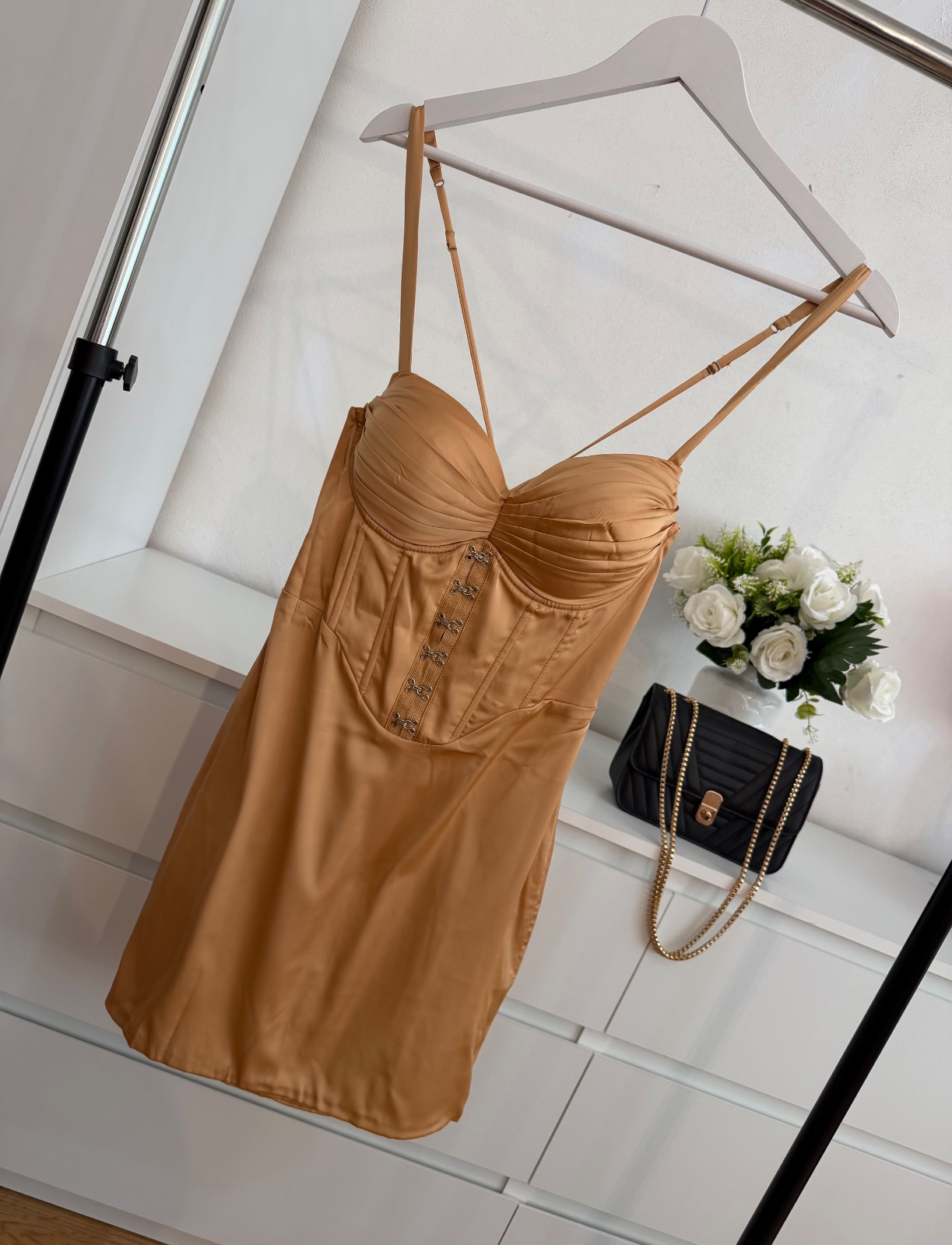 Šaty majú prepracovaný korzetový živôtik, ktorý krásne tvaruje postavu a zvýrazní ženské krivky. Jemne nariasený dekolt, detailné zapínanie vpredu a tenké nastaviteľné ramienka s prekrížením na chrbte vytvárajú veľmi ženský a sofistikovaný look.