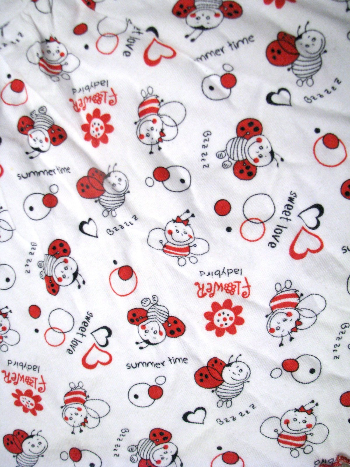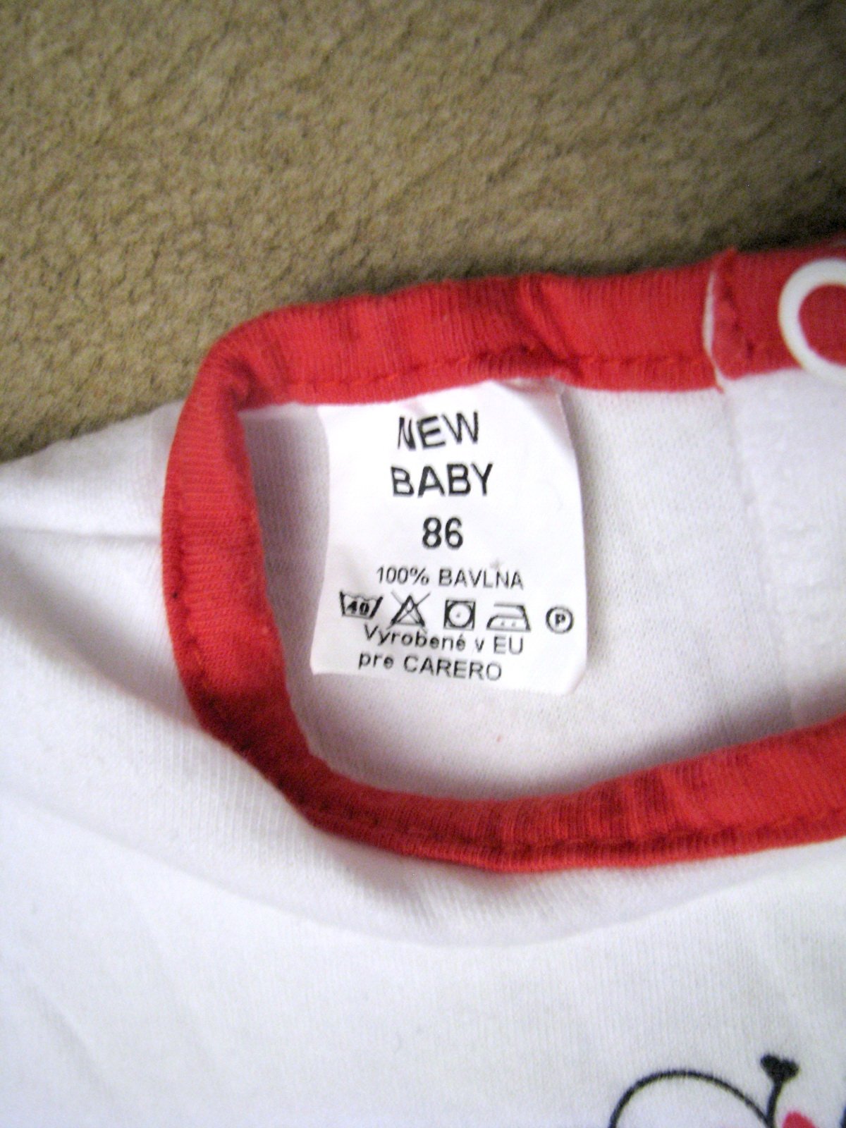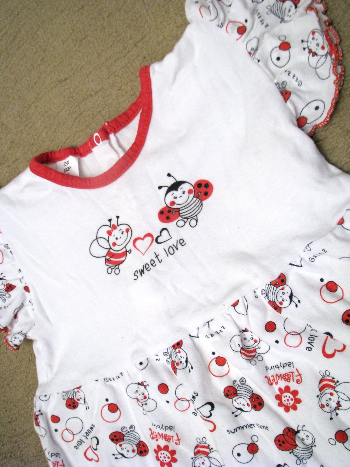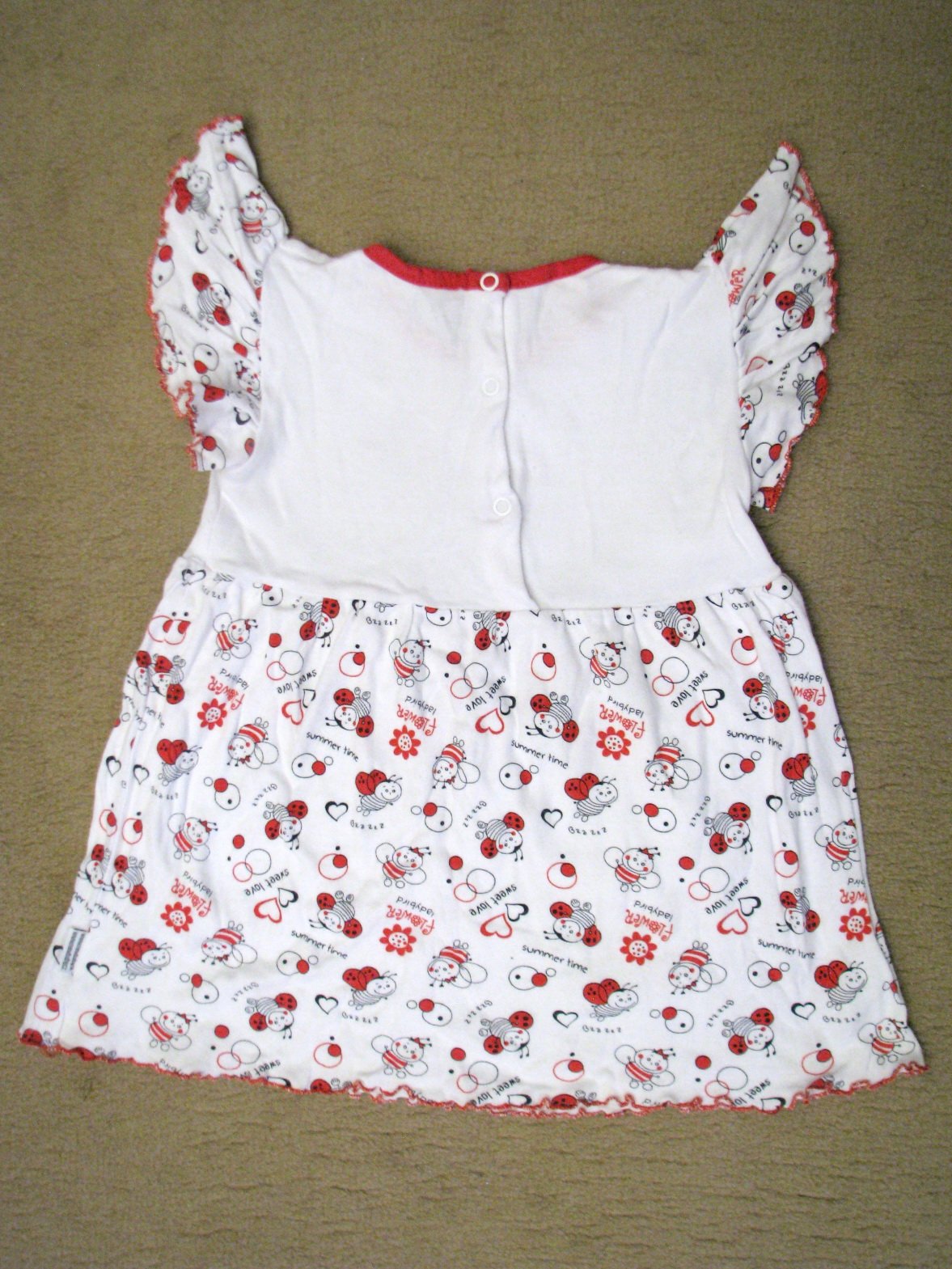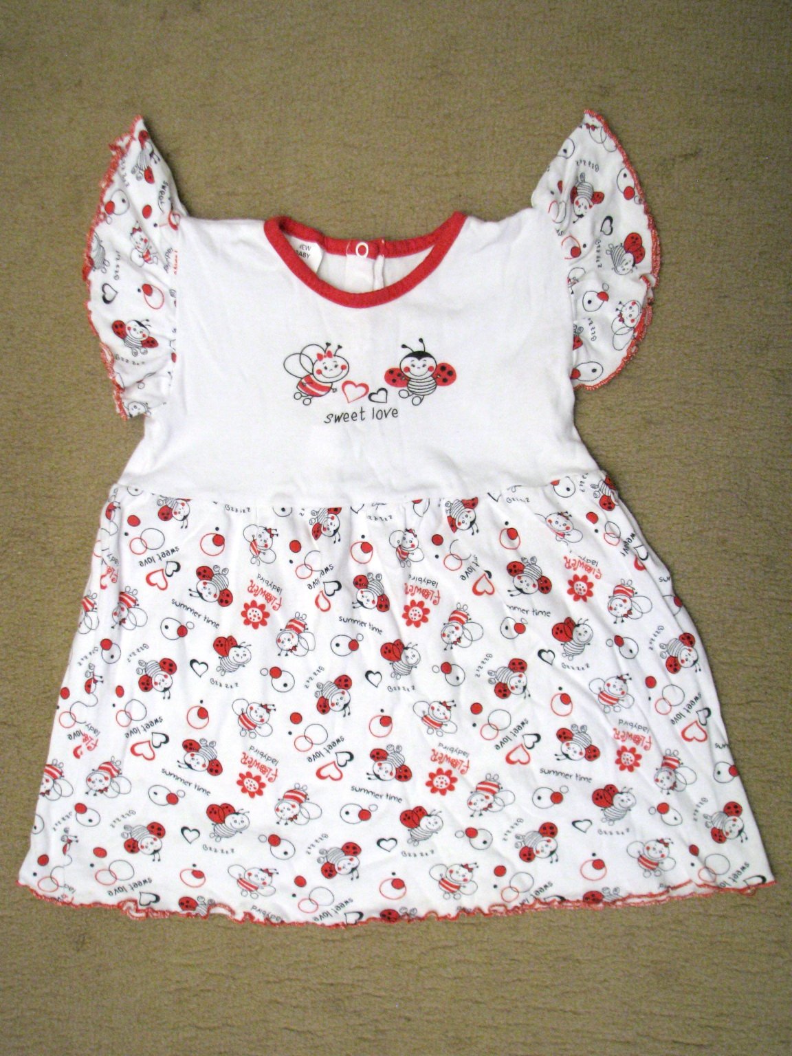 Letné bavlnené červeno - biele šaty pre bábätko so vzorom včeličiek. Vpredu na sukňovej časti je malý asi 2 mm žltý fliačik, skoro ho nevidno. Iné poškodenia nemajú, sú pekne zachovalé. Veľkosť 86, v prípade záujmu premeriam.