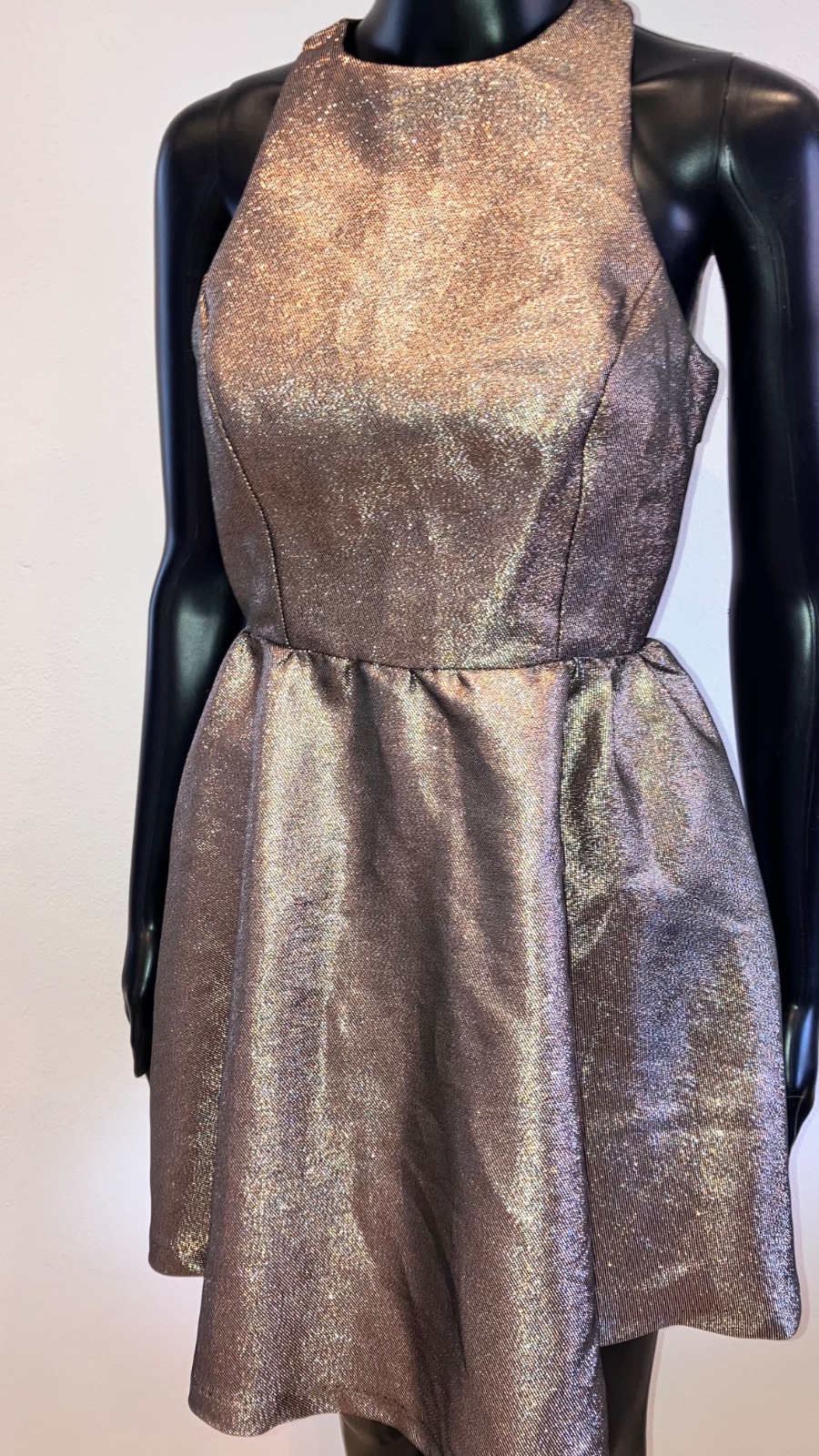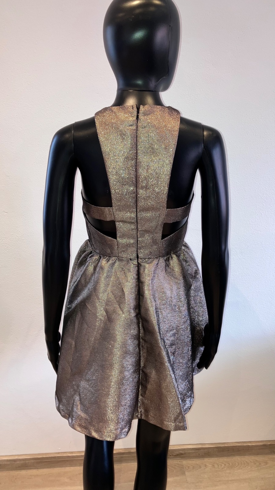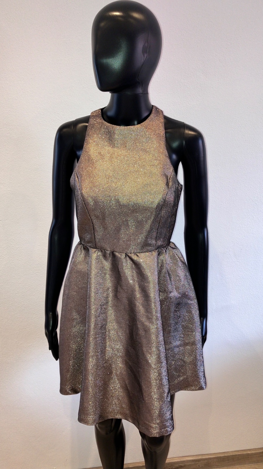 Dámske, dievčenské šaty v zlatej farbe s krásnym chrbtom a zvonovou sukňou, bez rukávov.