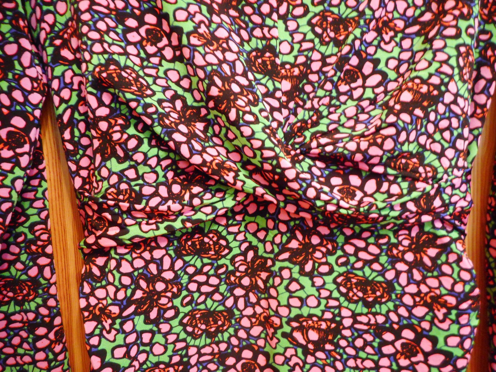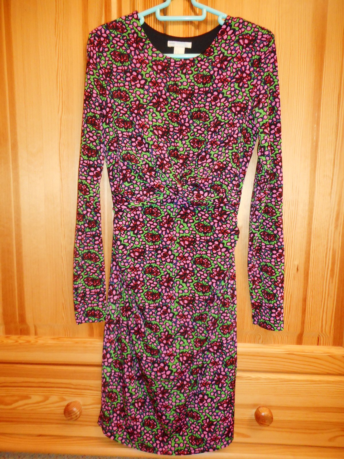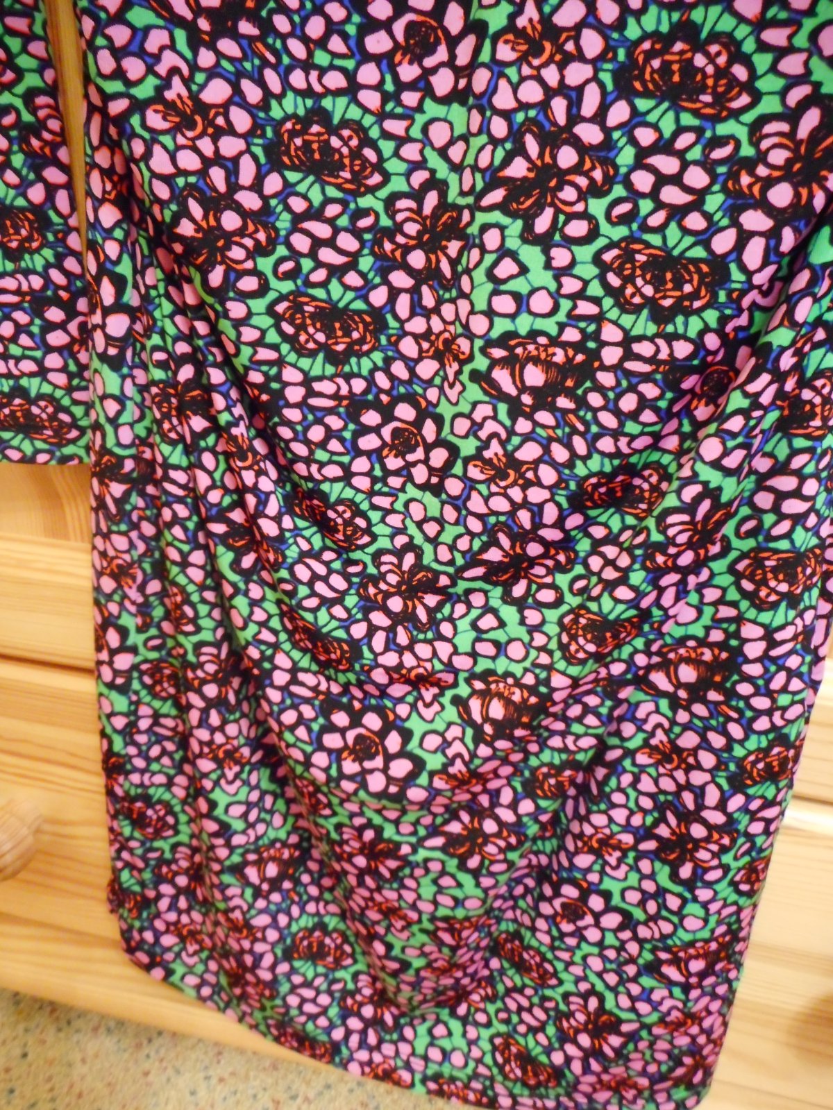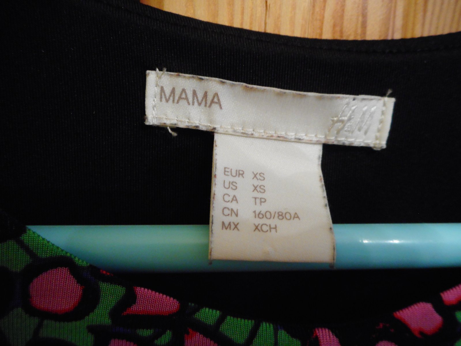 predám v top stave krásne tenšie dámske alebo dievčenské šaty s dlhým rukávom, obliekanie cez hlavu, bez zipsu, veľkosť XS /34-36/ zn. H&M Mama z pružného, lesklého elastického materiálu s potlačou ružových akoby mozaikových kvetov a lupienkov pretkávaná modrými odbleskami, v spodnej časti hrudníka a pásu je akoby prekrížené riasenie, šaty sú pekne tvarované k telu, zvýrazňujú štíhlu postavu