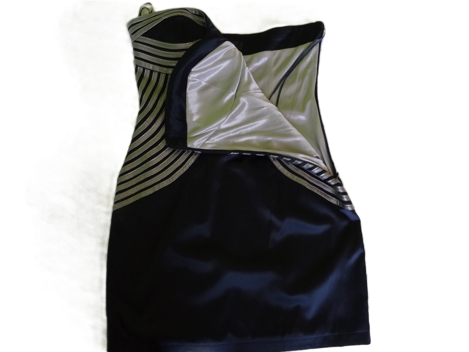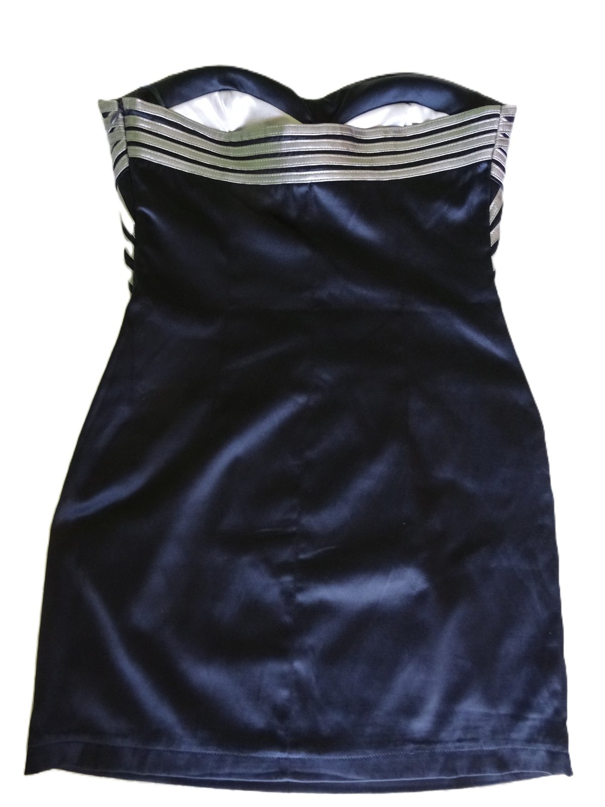 Čierno strieborné šaty bez ramienok, ale dobre držia - je v nich vložená vystužená podprsenka. Dlžka 51cm, pod pazuchami 40cm, v oblasti pása 36cm, boky do 2x45cm.
