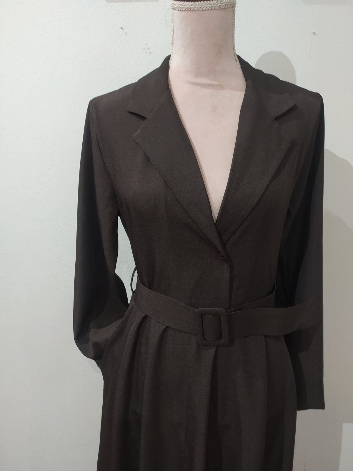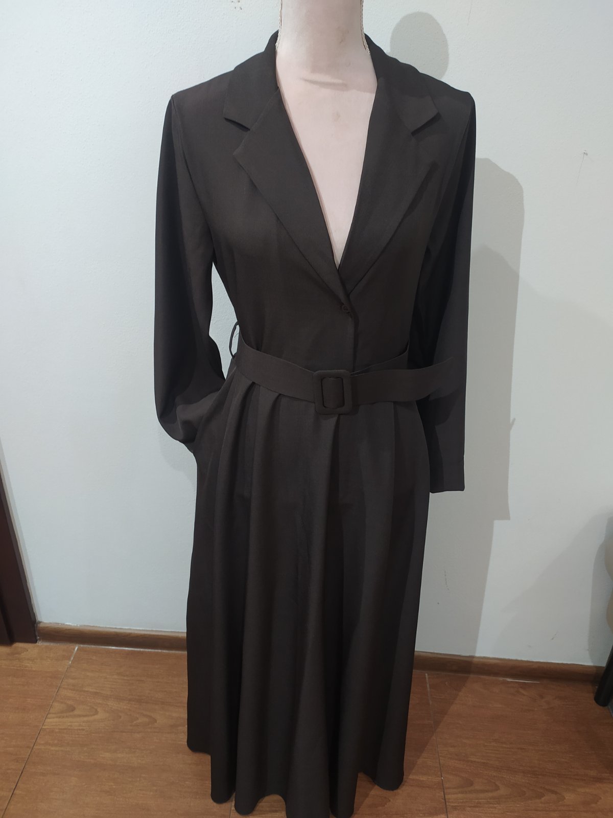 Štýlové krásne šaty ,vrch daňového strihu ,zapínanie na gombík,sukňa široká,vo švíkoch vrecká ,doplnené opaskom.Vel Uni vhodné pre veľ S-L,-mensie