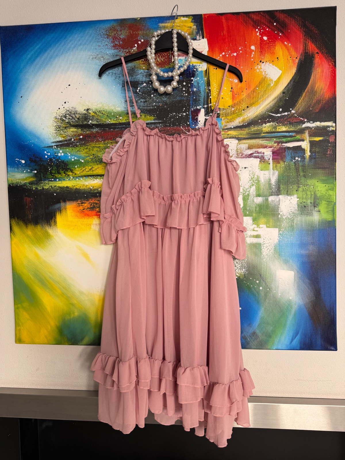 Nenosené mini šaty zn.ZARA v ružovom prevedení. Krátke šaty s výstrihom do V a ramienkami. Dokončené čipkou v rovnakej farbe. Nazberaný detail vpredu aj vzadu. Asymetrický spodný lem. Veľkosť L, sú...
