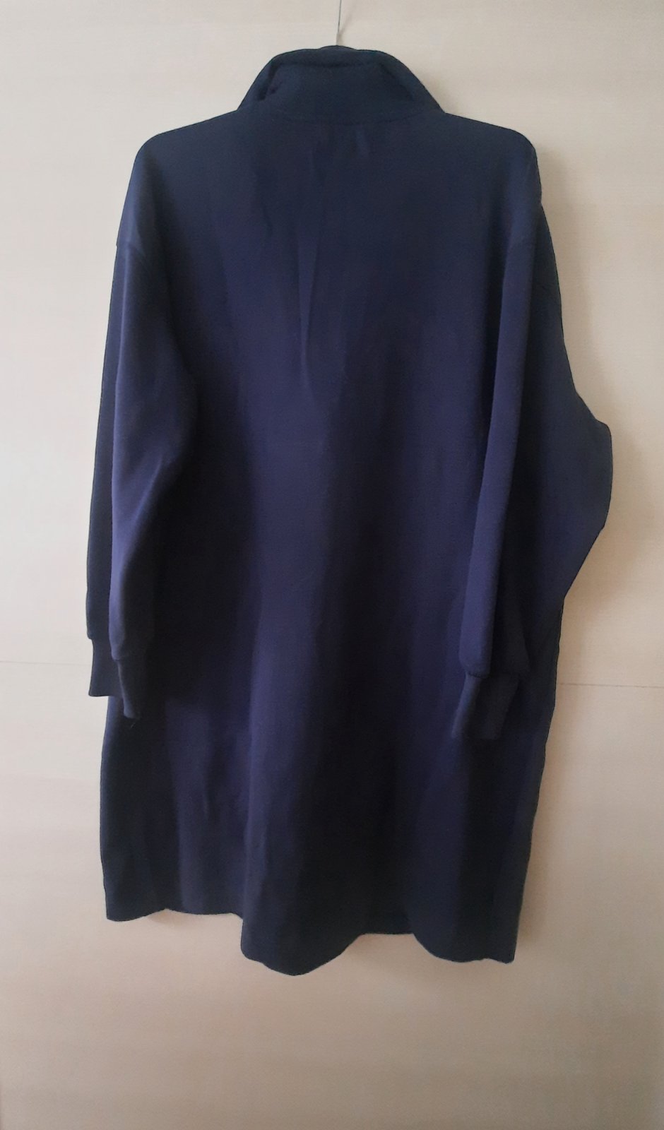 Praktické modré šaty s dlhým rukávom a opaskom na bežné nosenie Ležérny strih, výstrih do V 100% viskóza Dĺžka: 113 cm Šírka pod pazuchami: 54 cm Pás: 54 cm
