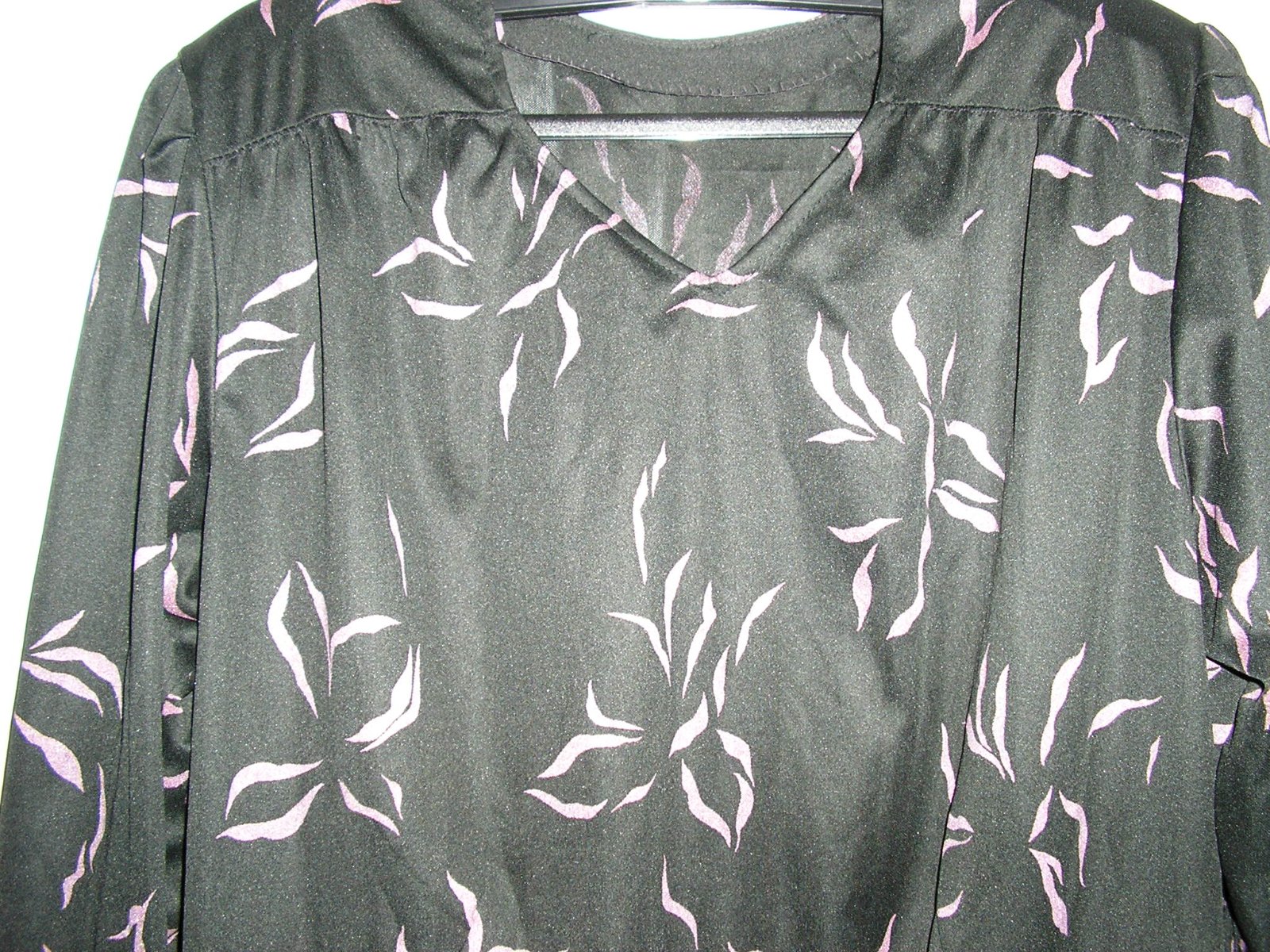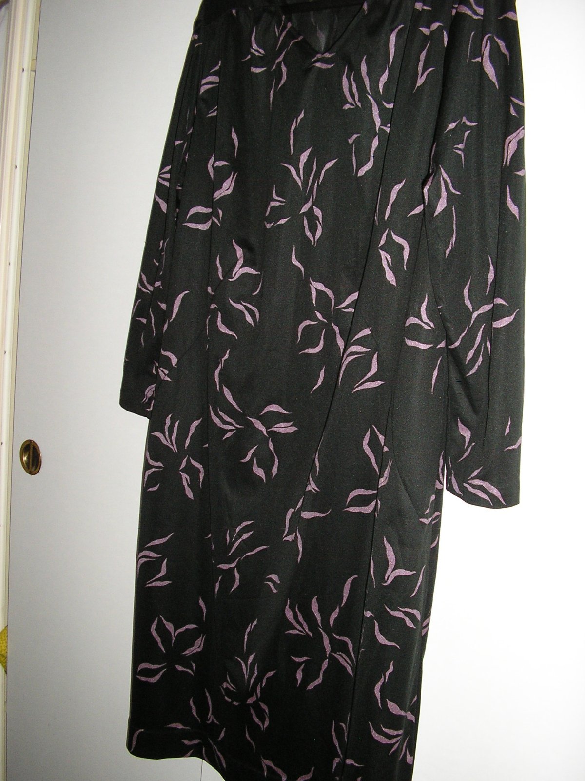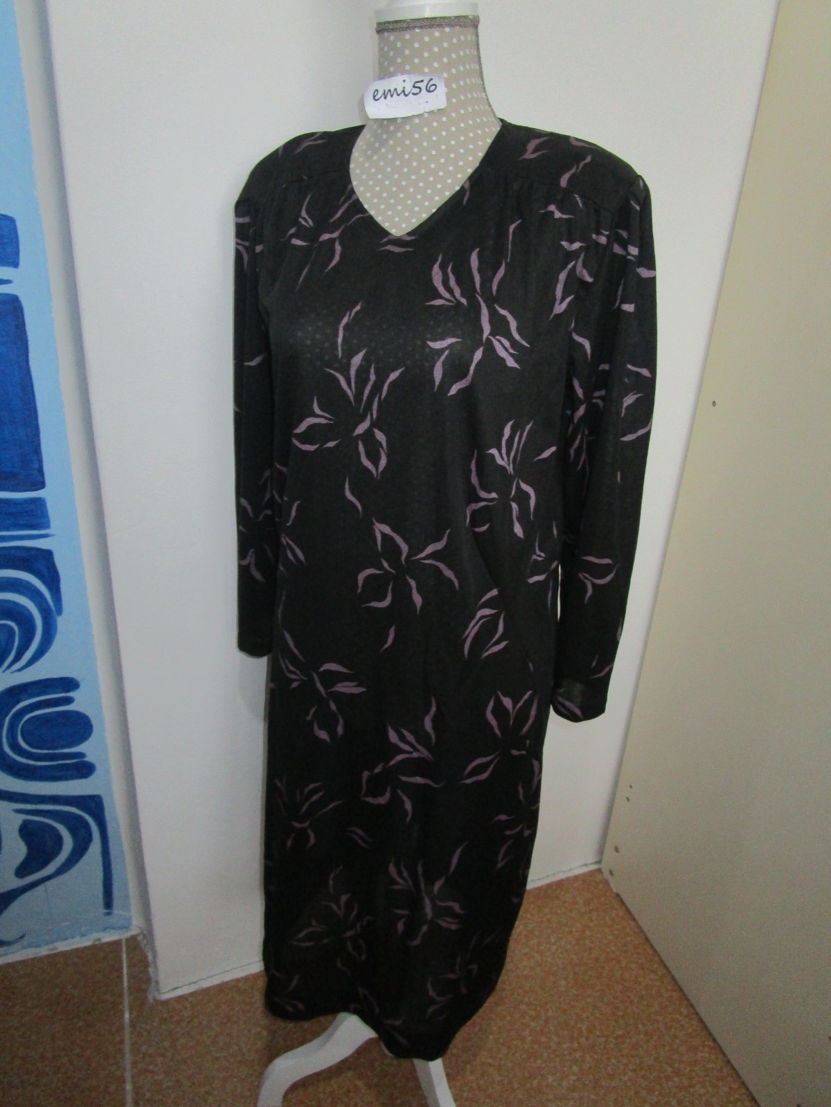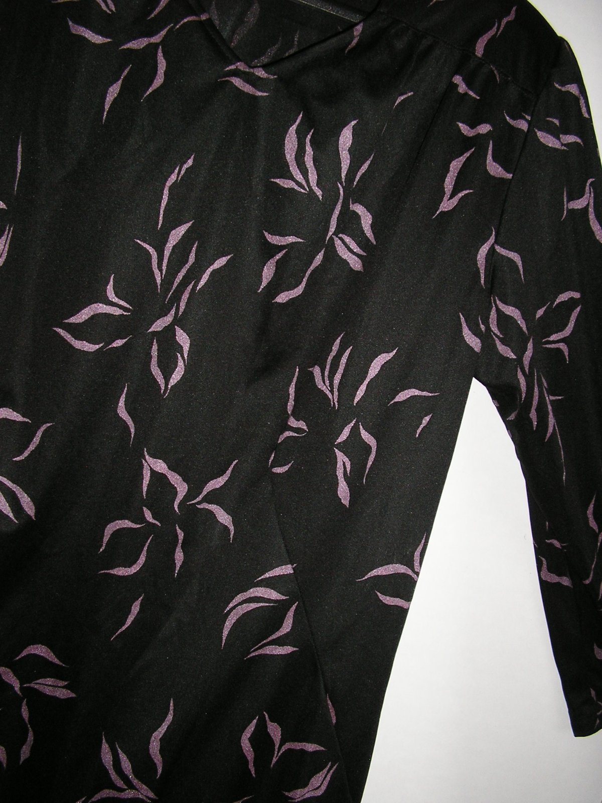 Ľahký, tenký úpletový mierne elastický materiál na čiernom podklade s modernými tm. fialovými motívmi. Śaty sú jedinečné, šité na mieru. Rukávy dlhé, spodok rovný. Výstrih do V. Na ramene sú prestrihnuté, mierne nazbierané, čo zakryje malé nedostatky. Vzadu sú vypasované. Šaty sú vhodné na spoločenské akcie, príp. na všedné dni.