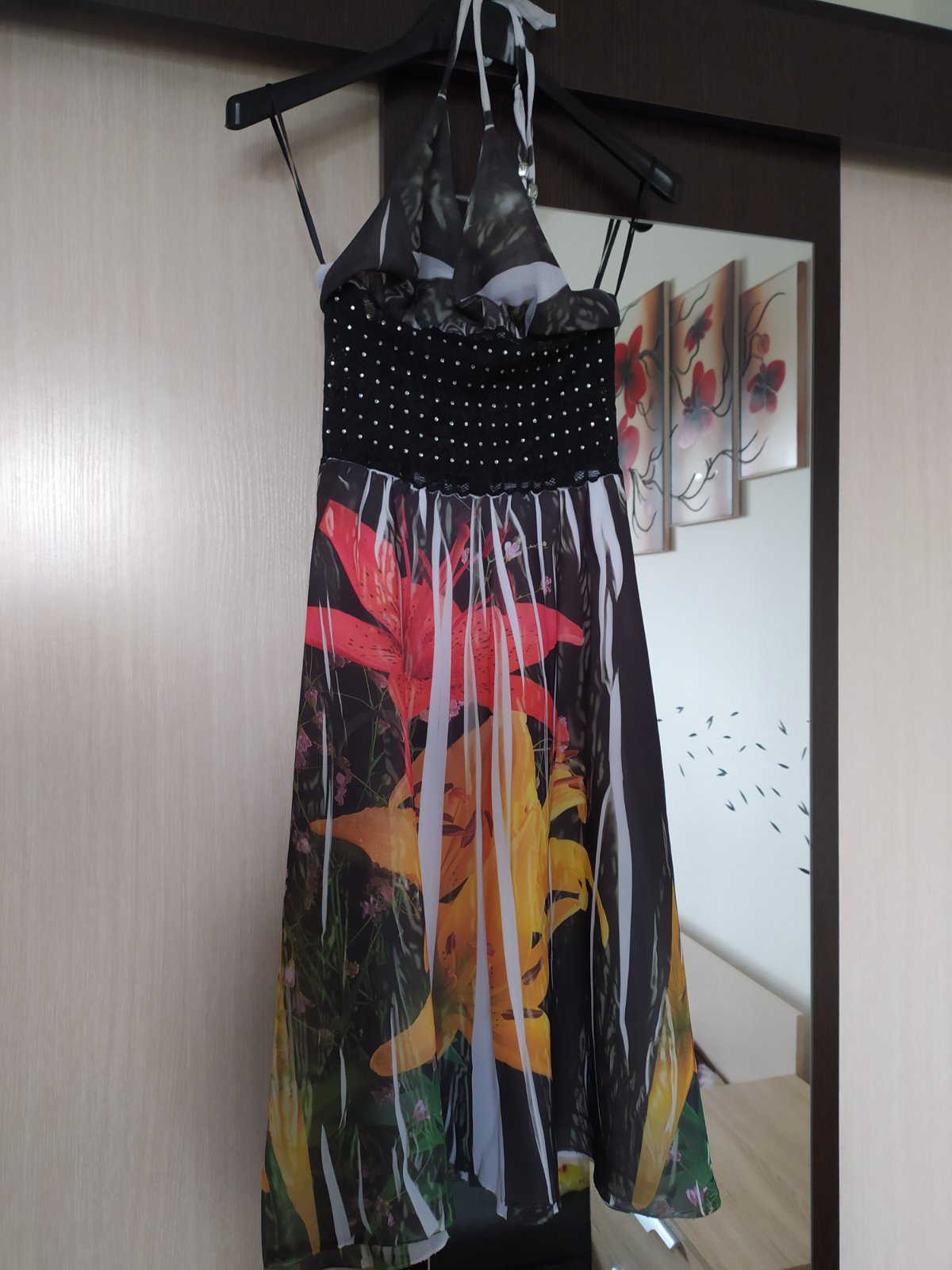Predám tieto nepoužité romantické a trochu sexy šaty veľkosť xs,s. Sú z lahučkého materiálu, v páse čipka s kamienkami, viazanie okolo krku. Top stav.