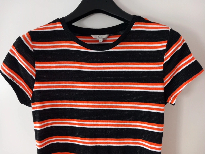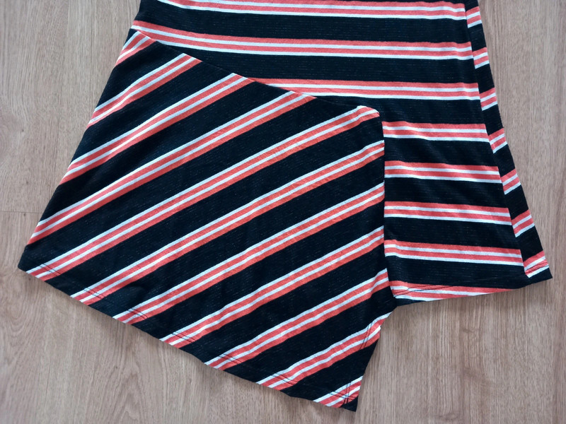 Pohodlné, padavé tričkové šaty s krátkym rukávom, zn. C&A kolekcia Clockhouse, veľ. S, materiál: 56% polyester + 41% viskóza + 1% elastan. V spodnej časti zozadu klasický oblúk, vpredu zaujímavý špic.