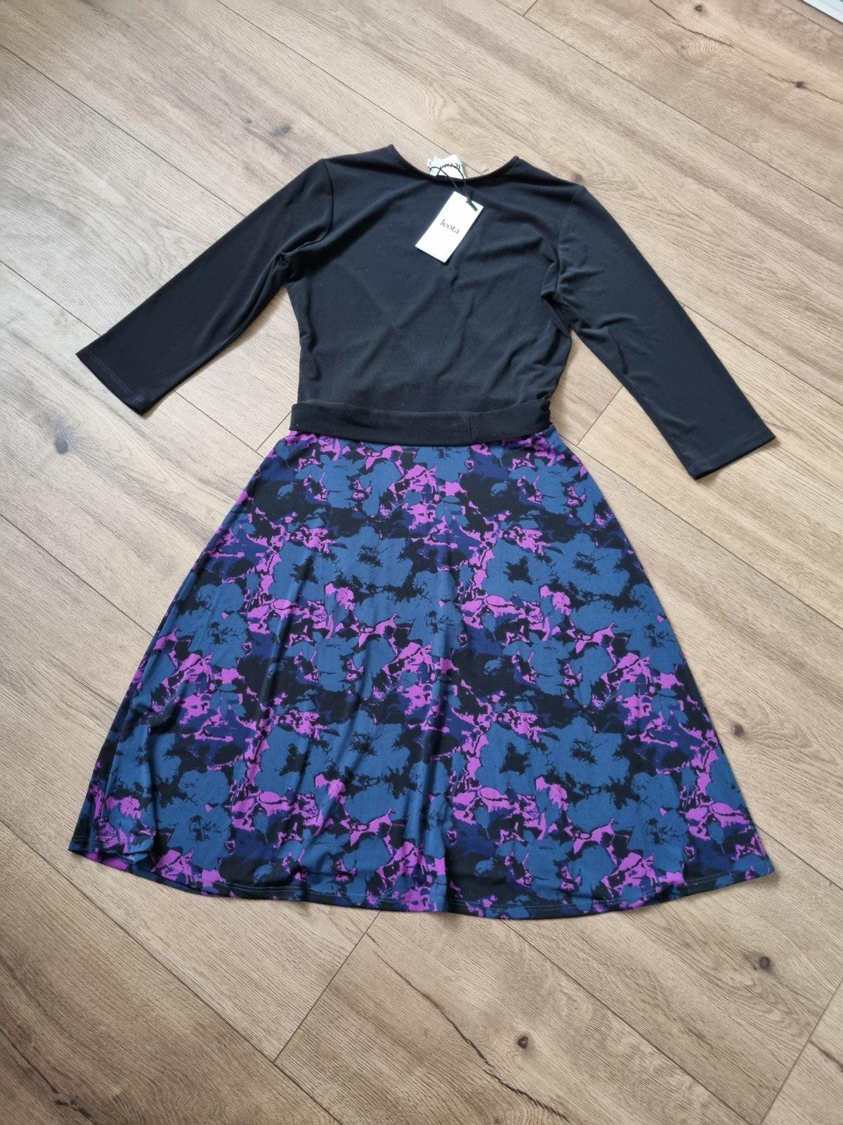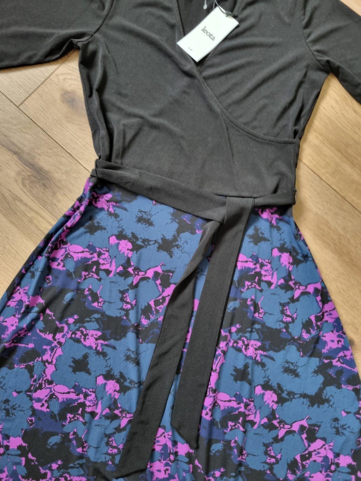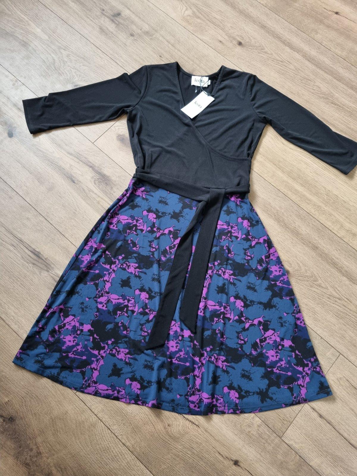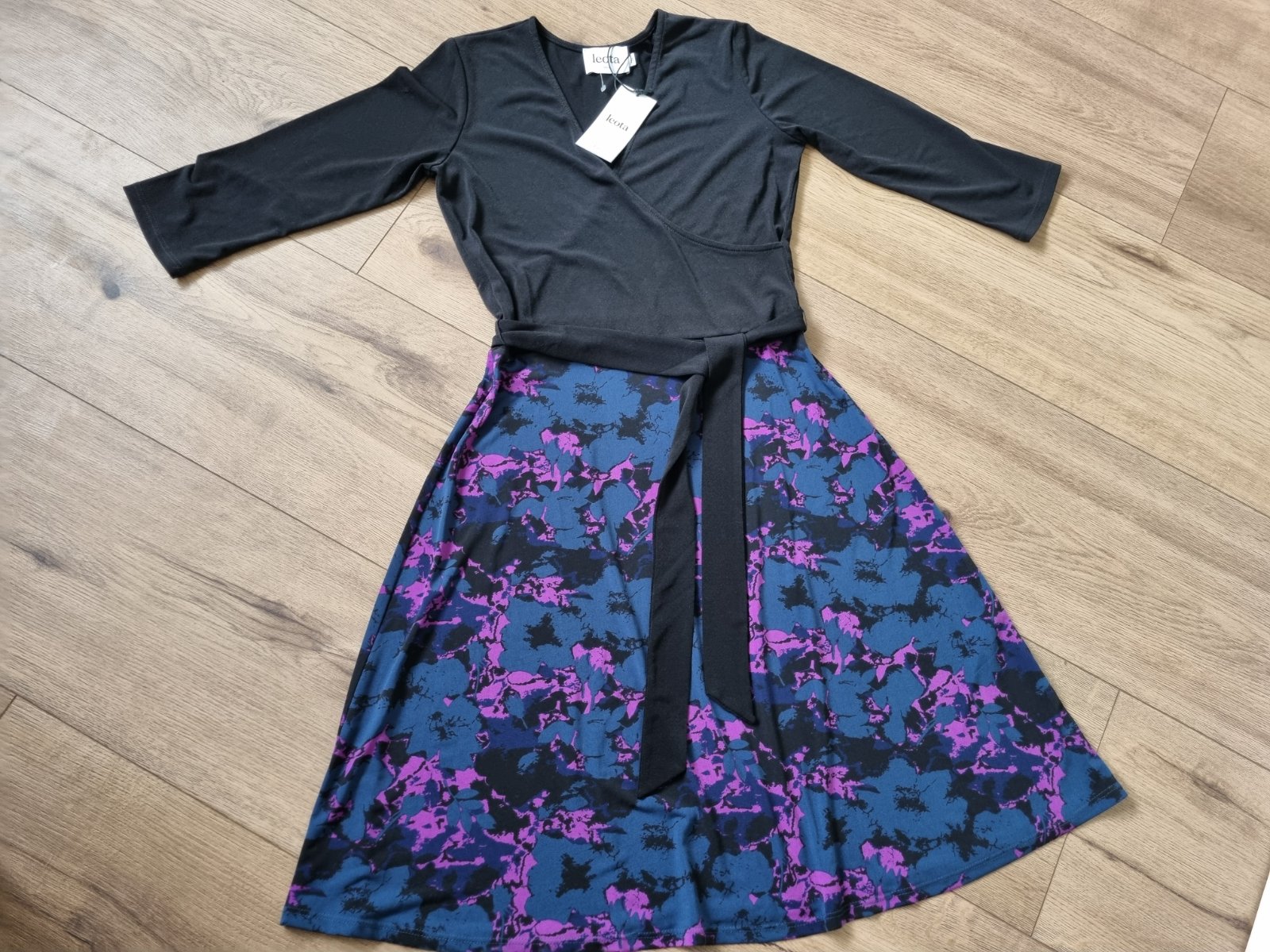 syntetický úplet, zavinovací efekt, v páse strihané s točenou sukňou a opaskom. MIERY: šírka v podpazuší cca 46x2 cm, šírka v páse cca 36x2 cm, dlžka cca 103 cm,rukáv od krku 51