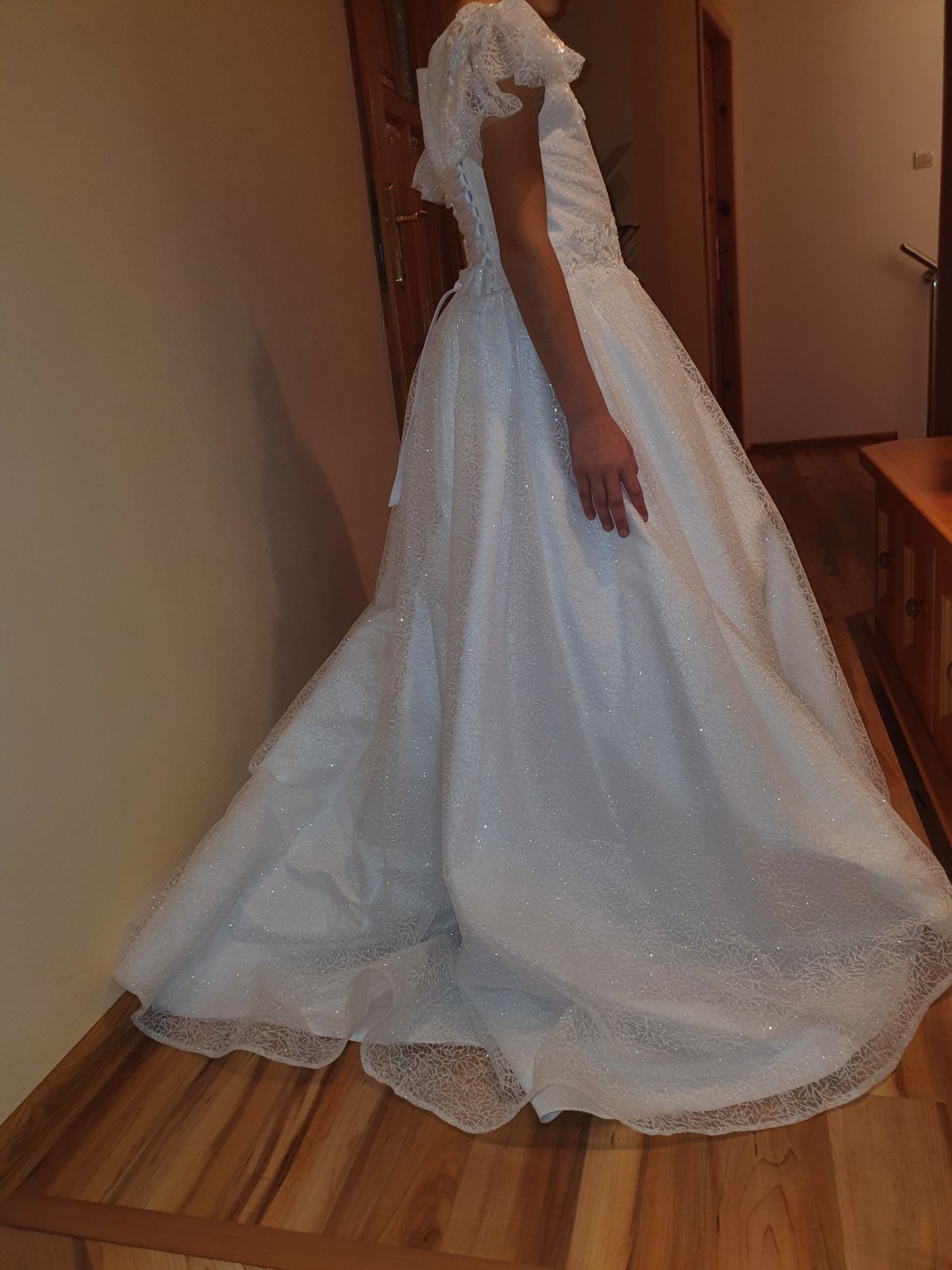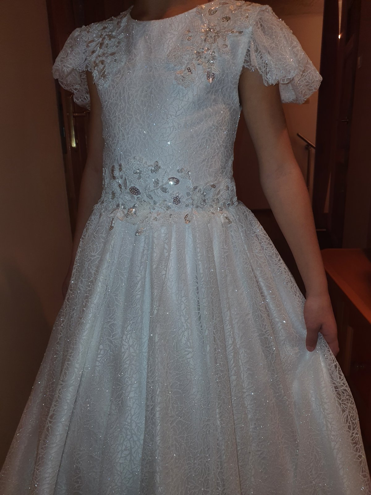 Nádherné luxusné snehobiele šaty v top stave na 1 sväté prijímanie. Fotene bez kruhu . Je ku ním aj kruh. Pošlem video. Oblečené 2 hodiny . Vyčistené v čistiarní. PC 250 eur . Je k nim aj korunka originál na predaj aj topánočky velk 34 aj kabelka