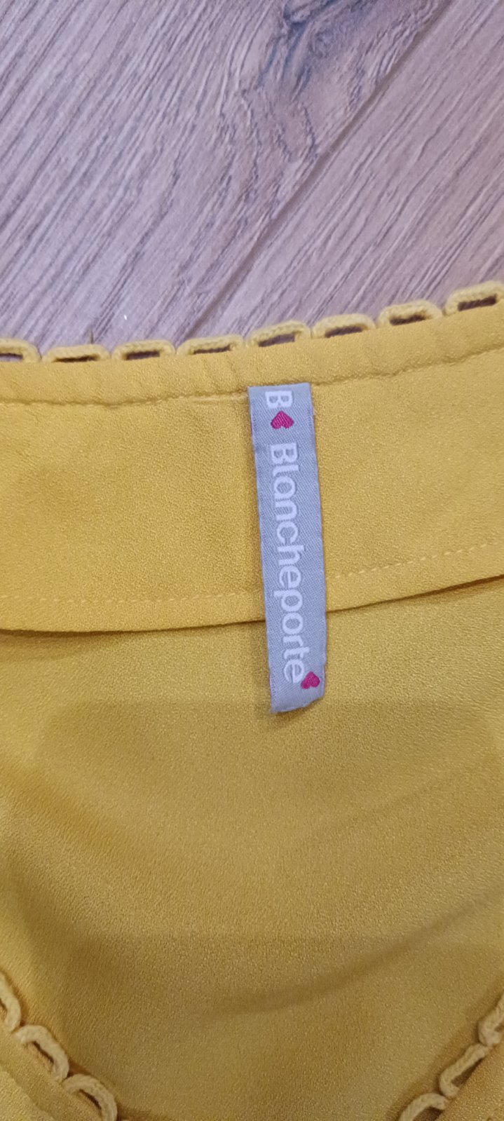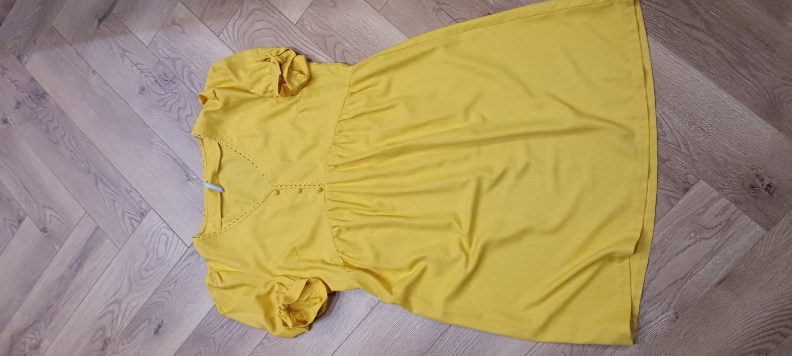 Výrazné žlté šaty kombinované so žltou guľkovanou látkou, šaty sú zaujímavo prestrihnuté a pekne sedia na postave. Rozmery: šírka pod pazuchami 48 x 2 cm šírka pásu 42 x 2 cm šírka bokov 51 x 2 cm ...