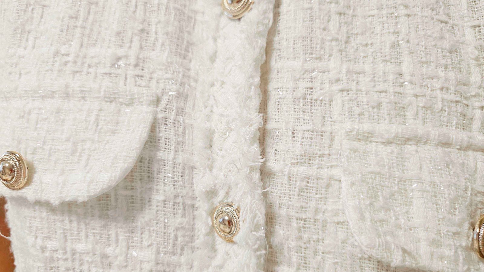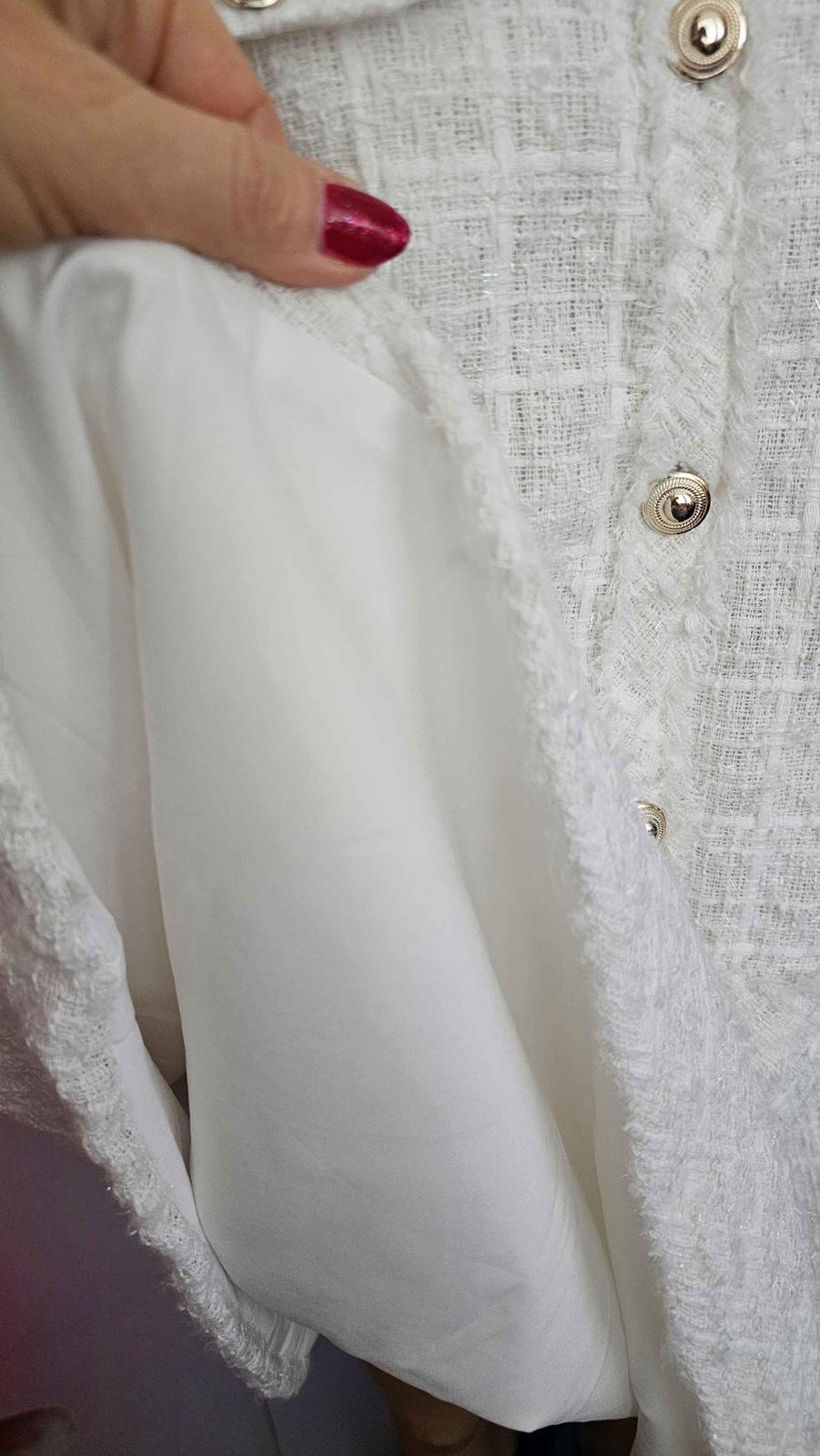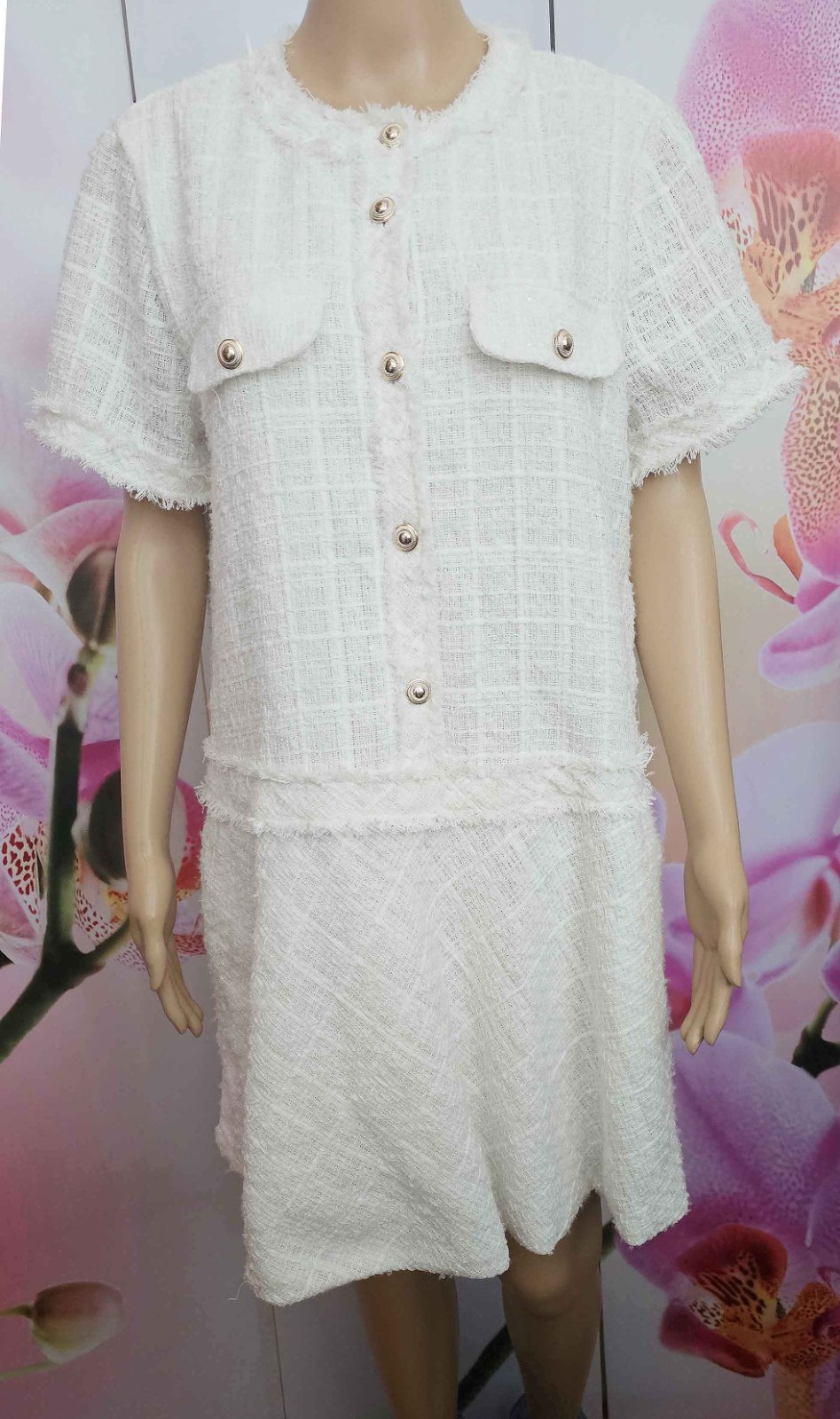 Nové. Dĺžka 88 cm, šírka v hrudníku 53x2 cm, pás cca 55x2 cm. Materiál látky príjemný mäkký s všívanými trblietavými niťami v látke. S podšívkou. Na bokoch vrecká.