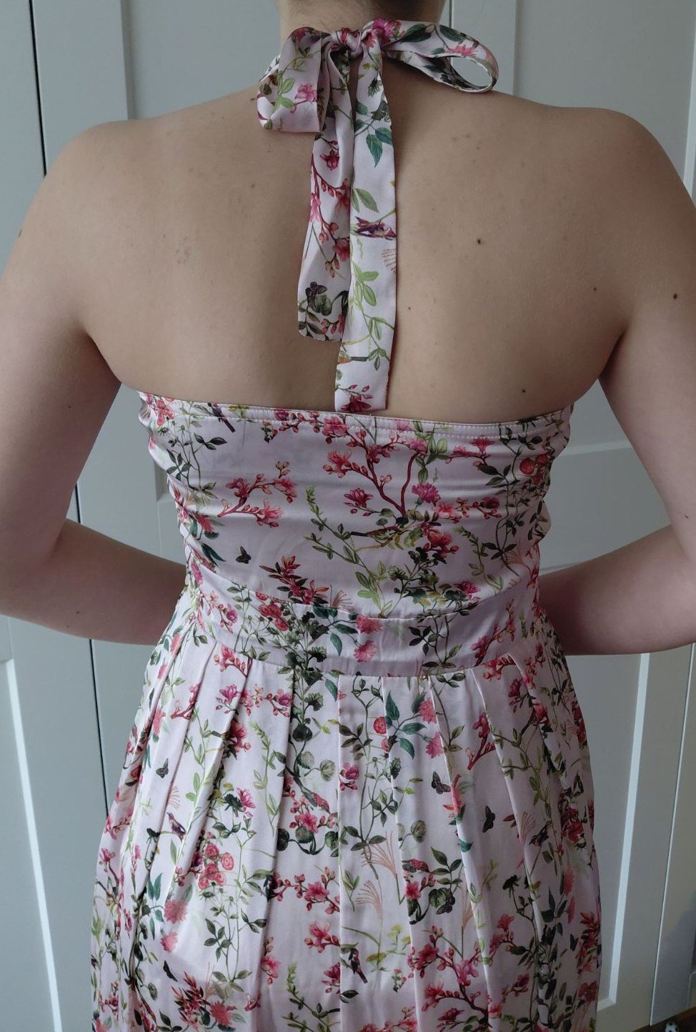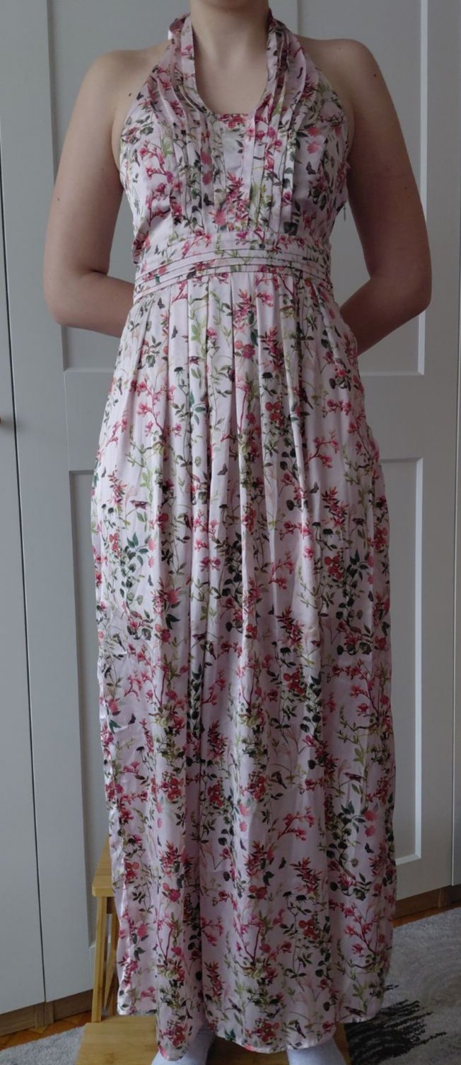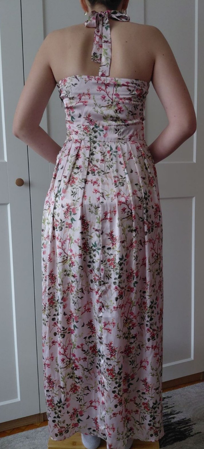 Ľahké letné šaty, viazanie okolo krku. Na boku zips, spodnička pod sukňou. Vhodné na letnú svadbu, oslavu.