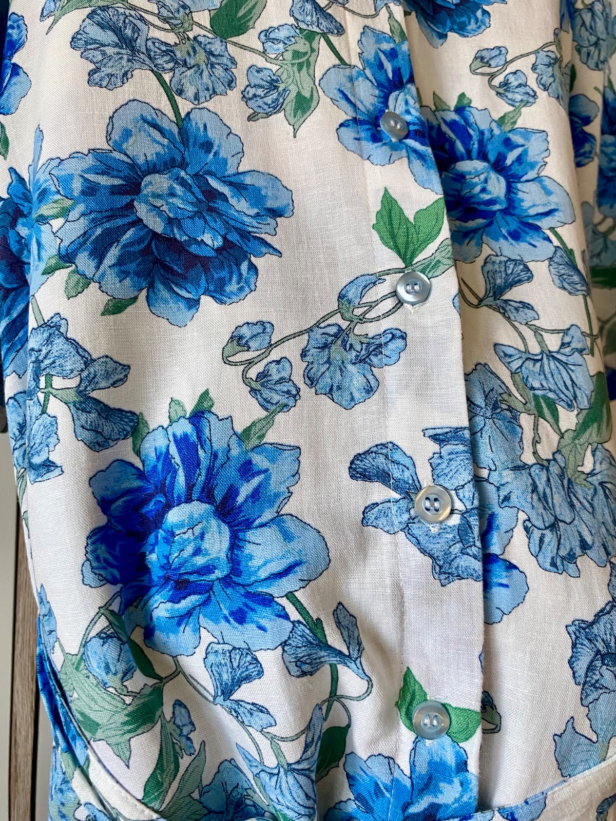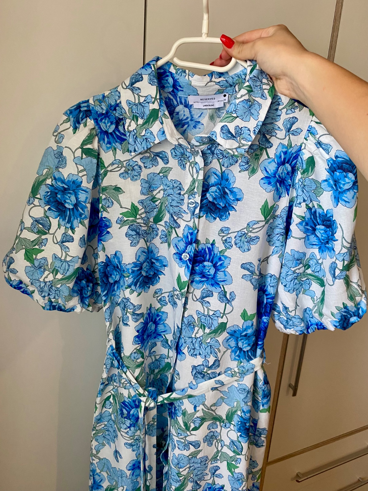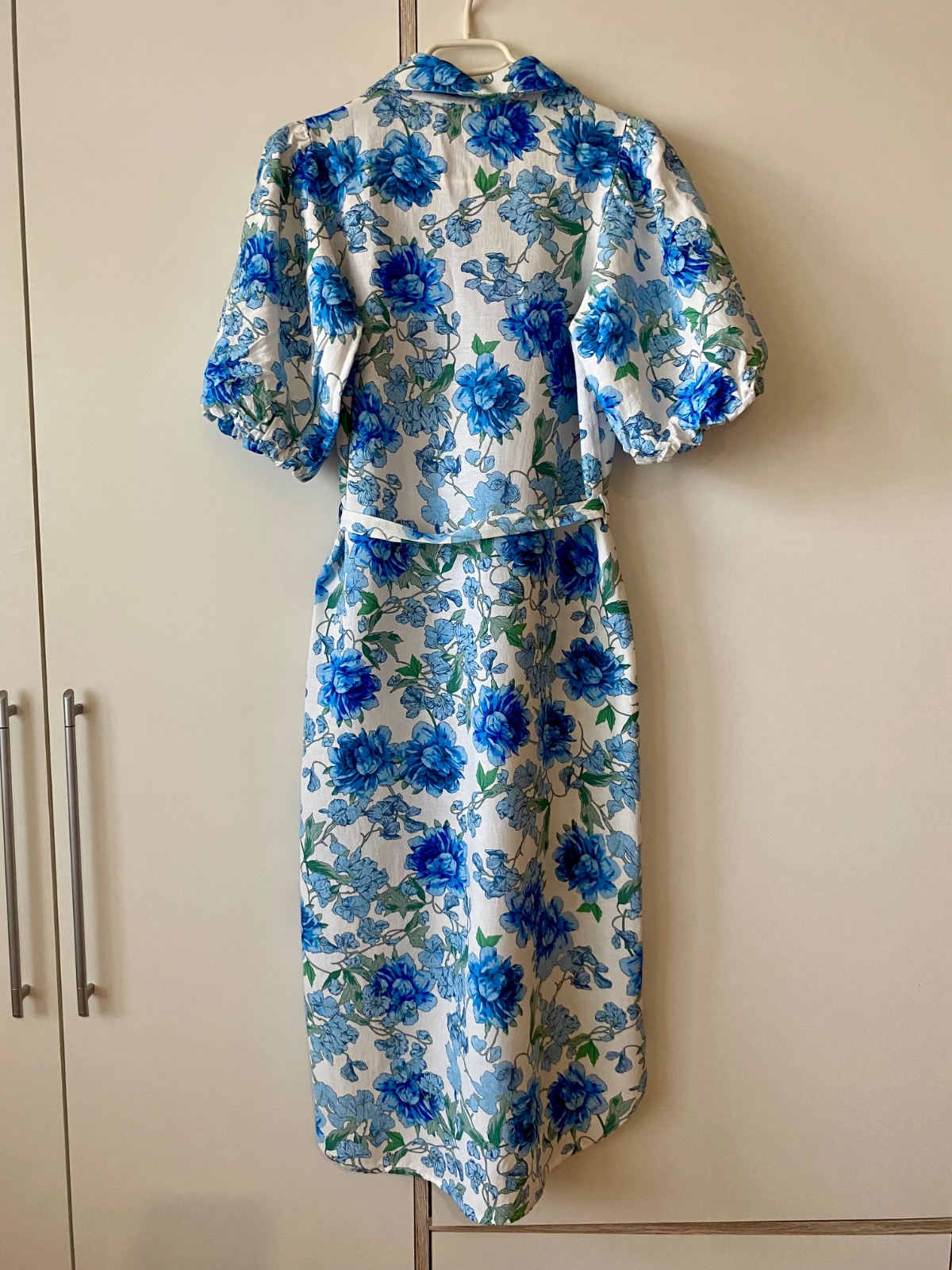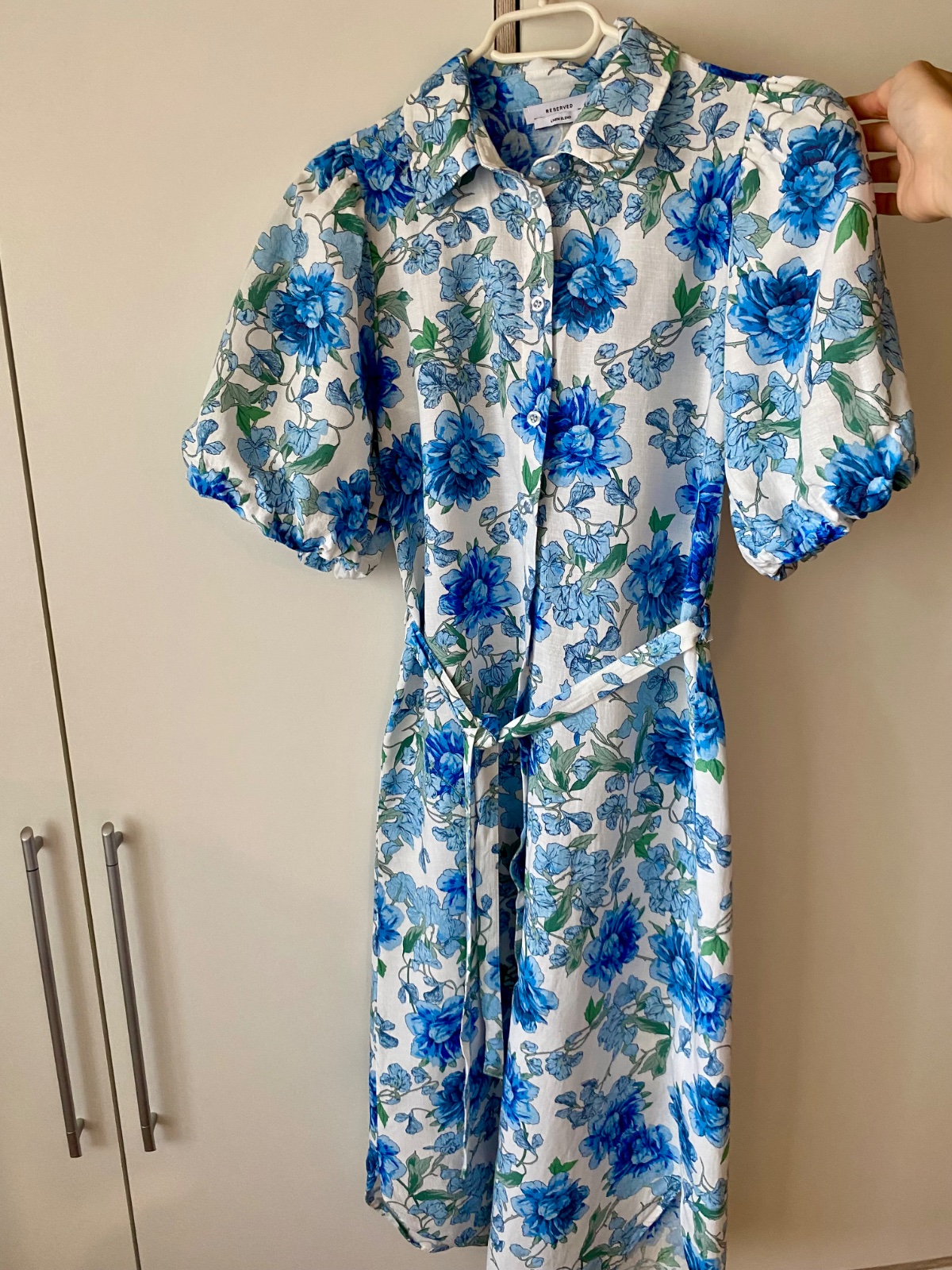 Úplne nové. Veľmi prijemny material. Zmes: ľan a bavlna. Krátke pufované rukávy. Zapínanie vpredu na gombíky. Opasok je možné aj vybrať. Midi dlzka