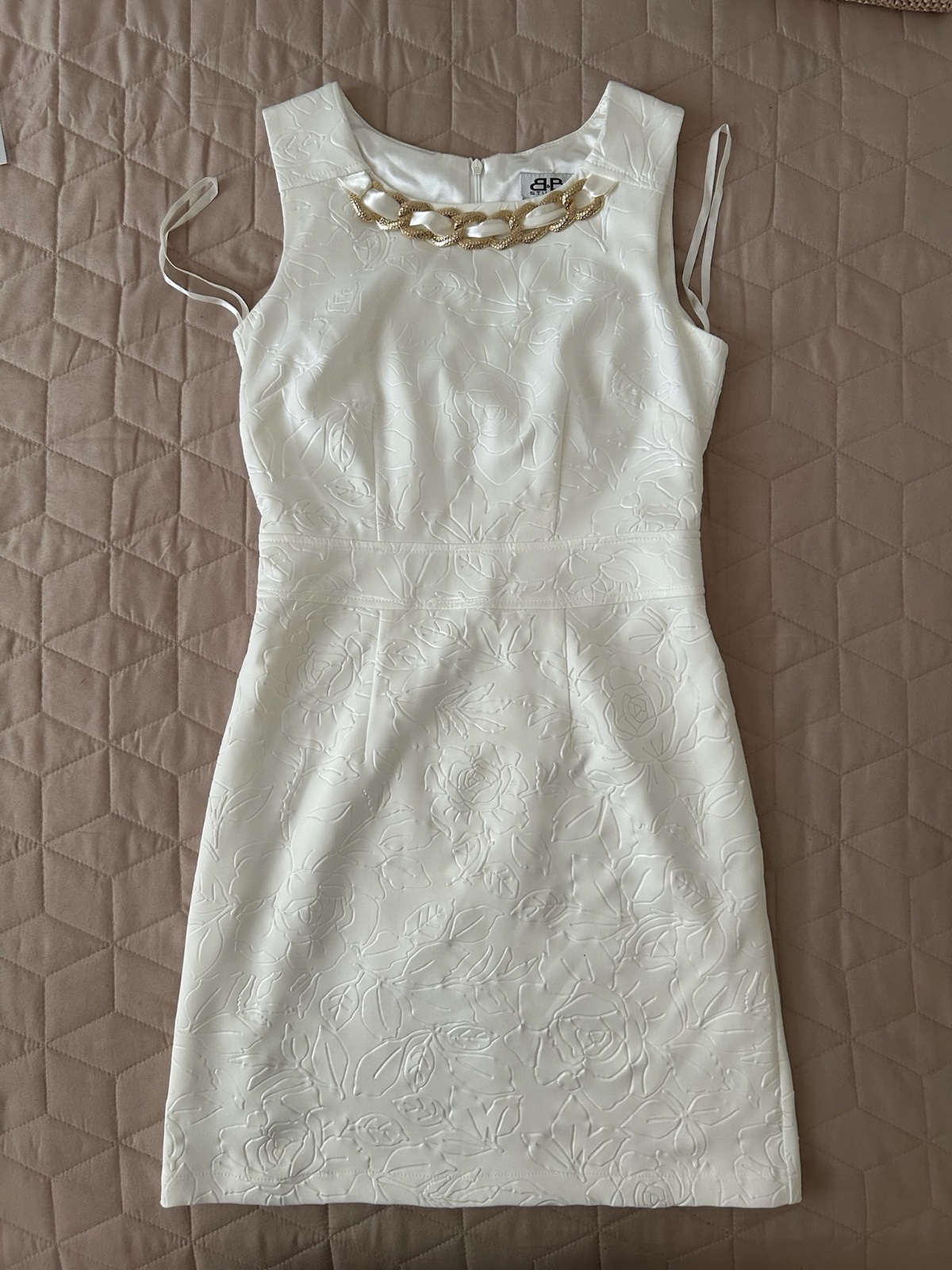 Bíle šaty s farebnou potlačou, elastický materiál, nové, nenosené. Pravdedpodobne pri balení vznikla drobná bodka pod vrchnou farebnou apilikáciou, je viditelná iba pri bližšoum pohľade Rozmery: ...