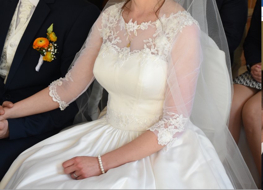 Svadobné šaty som si navrhla s pomocou salónovej krajčírky. Materiál svadobný satén a tyl s prišitými krajkovými aplikáciami. tie sú na rukávoch, na dekolte a chrbte, na "opasku" a tiež na závoji. odtieň teplá biela (v metráži mi povedali, že nie snehobiela, lebo tá je domodra). hrudník vystužený, ale nie príliš, len štepovaný. spodok kruhový, ale tiež pohodlný. bez vlečky.