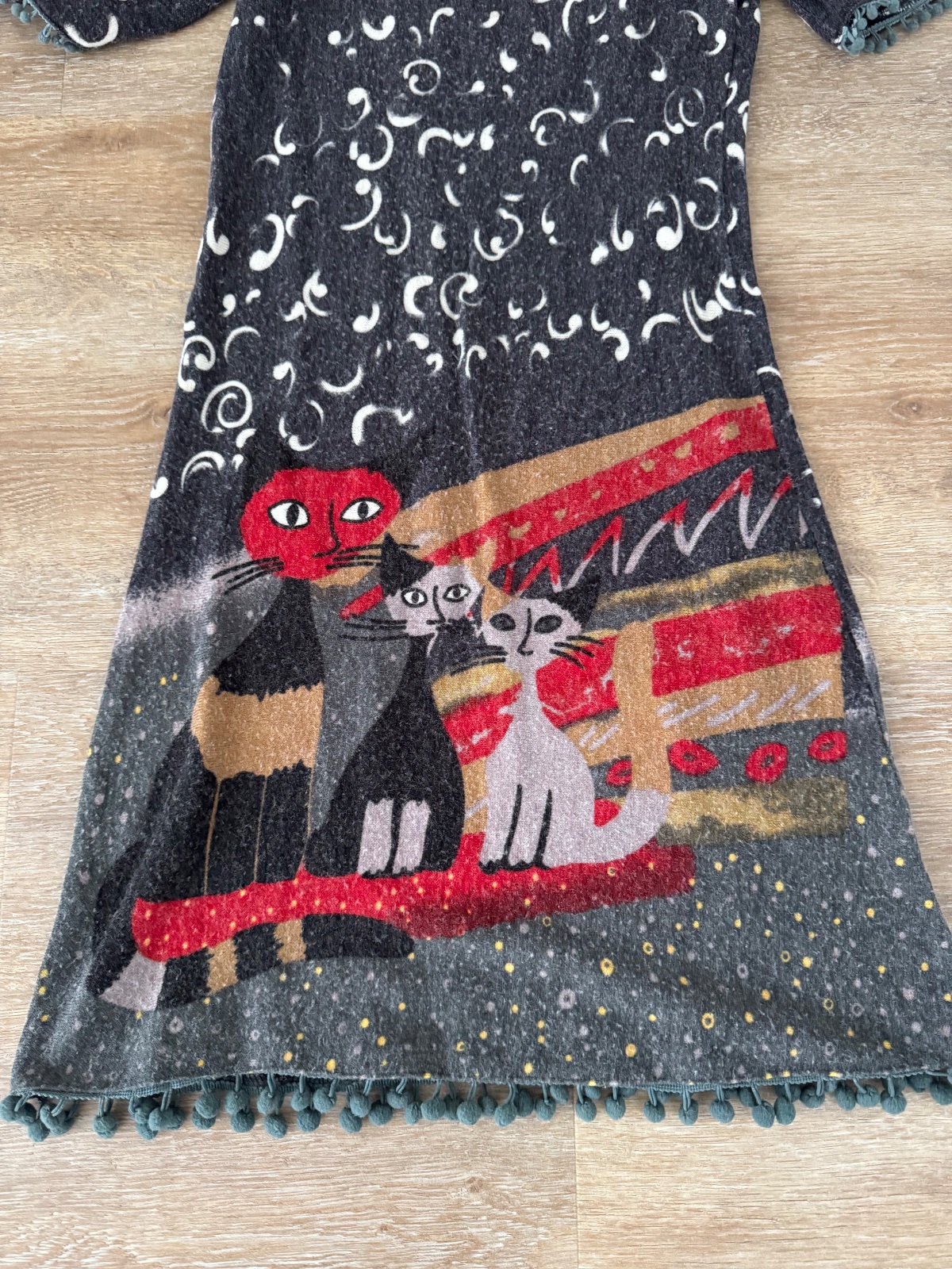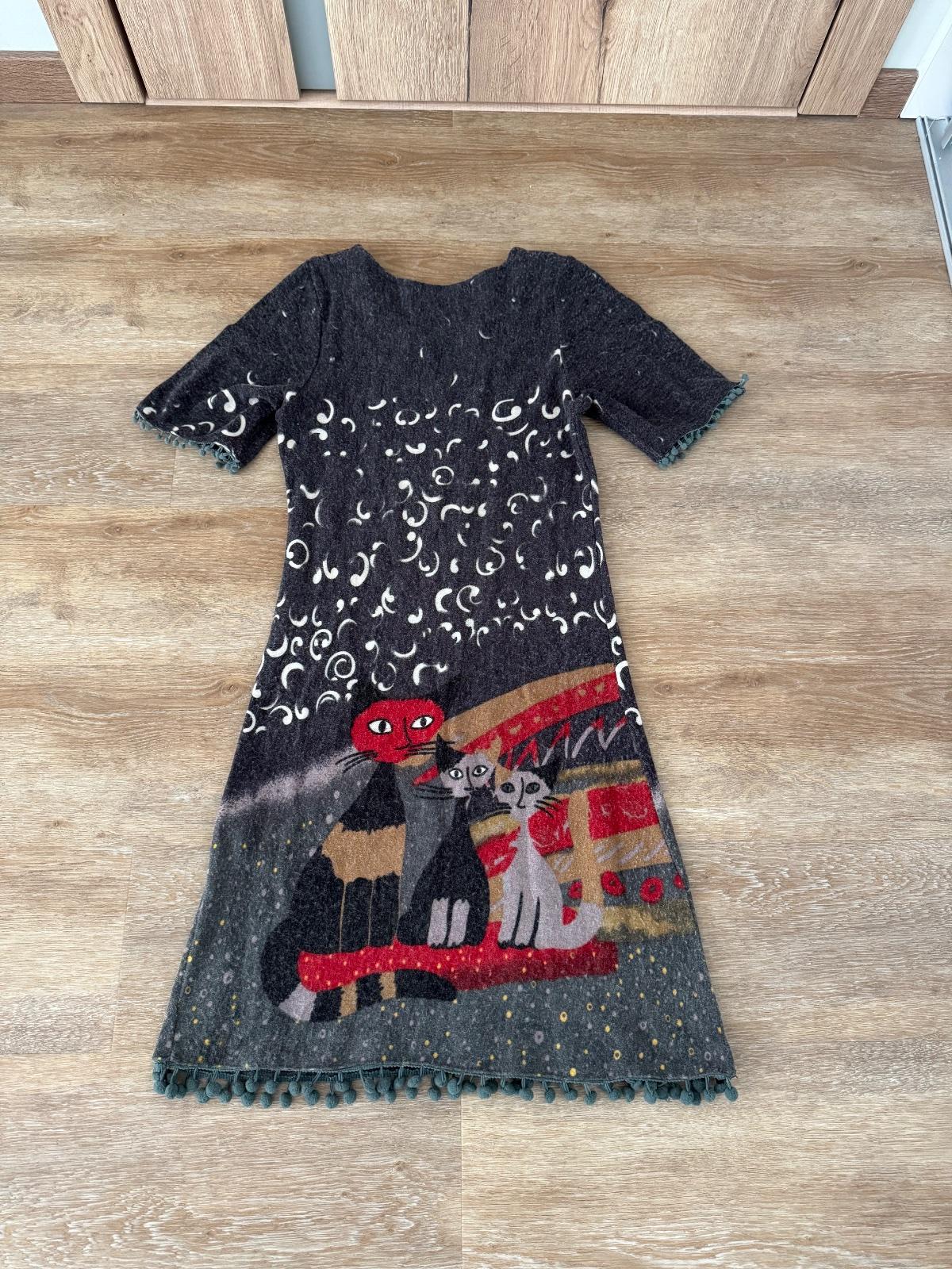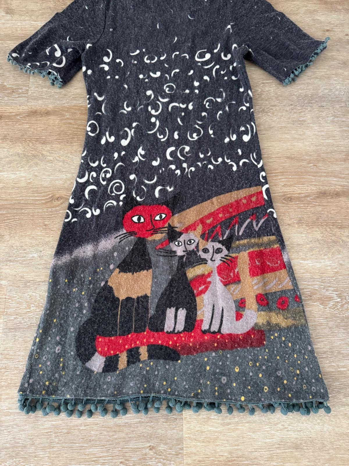 Ponúkam zaujímavé šaty v tmavošedej farbe + farebný motív mačičiek. Krásne sedia, prispôsobia sa. Ideálne na veľkosť S. Značka je Pepper Tree. Môžete ich nosiť celoročne. Boli pár krát nosené, naďalej v peknom stave. Zaujímavé je ukončenie na rukávoch aj dole, také efektné guličky. Inzerujem ešte 2 v takomto štýle. Poštovné podľa taríf.