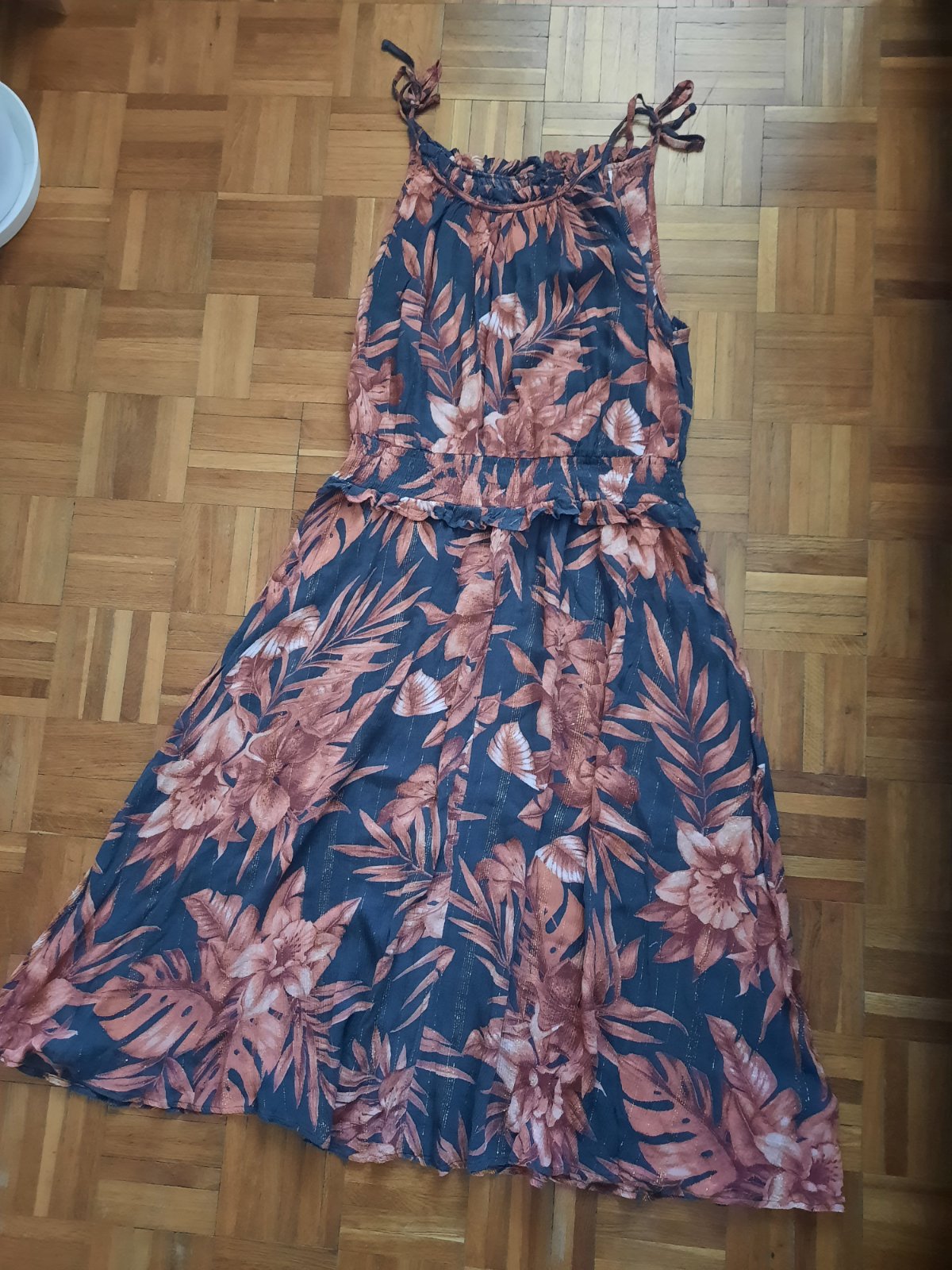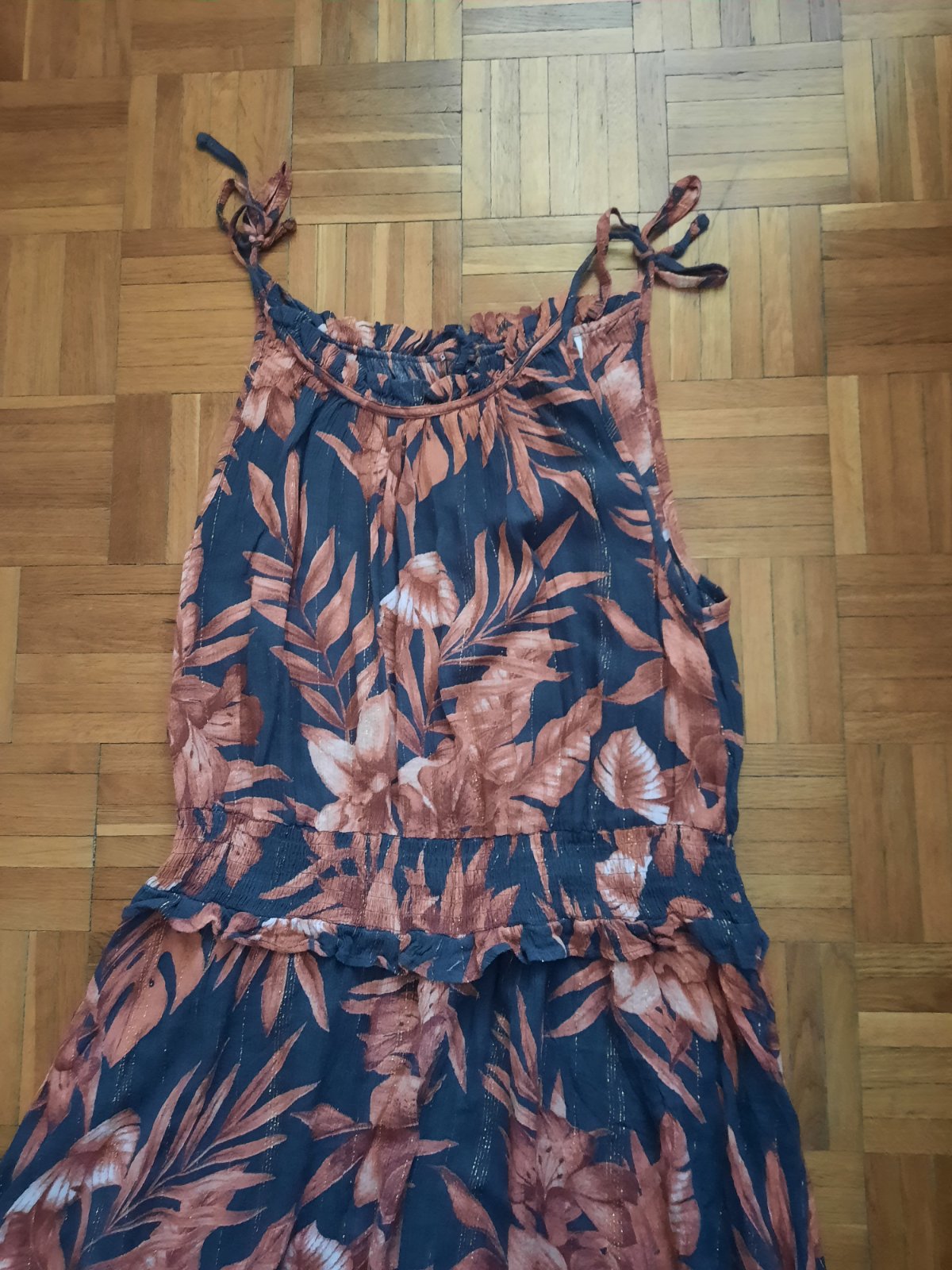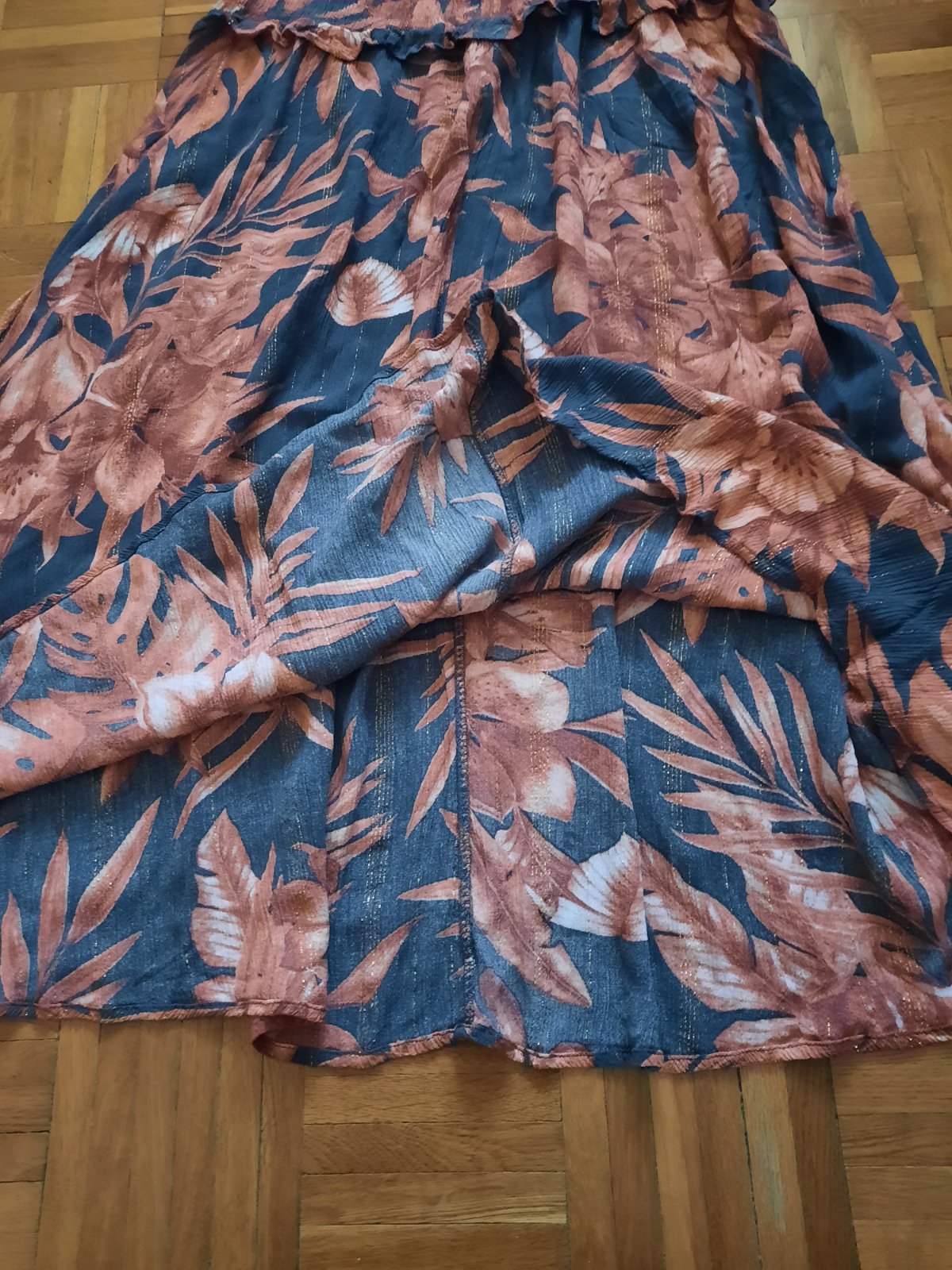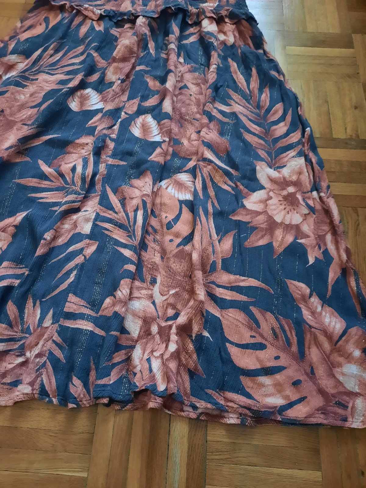 Krásne dlhé vzorované šaty na ramienka.V páse sú husto nariasené. Látka je popretkávaná striebornou niťou.