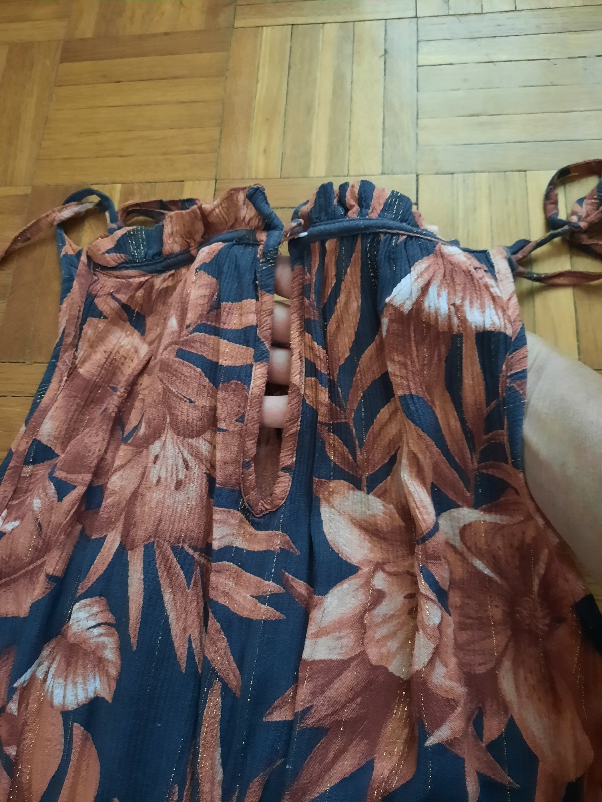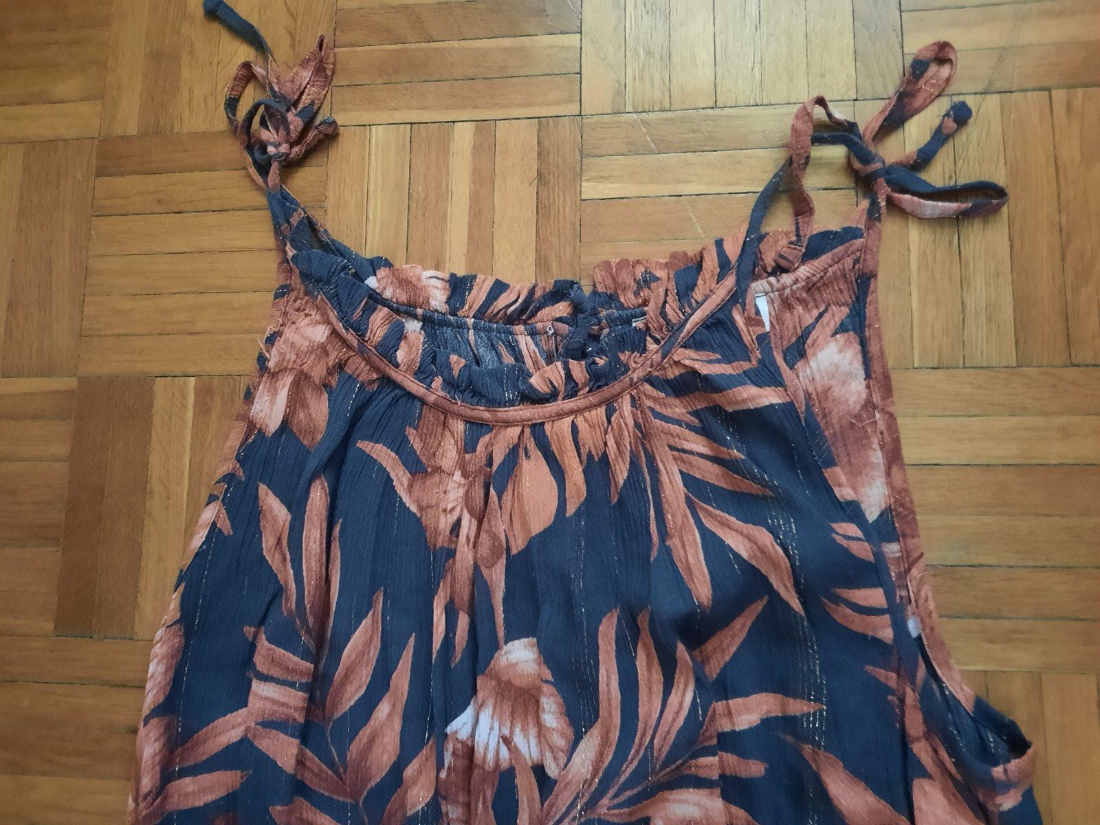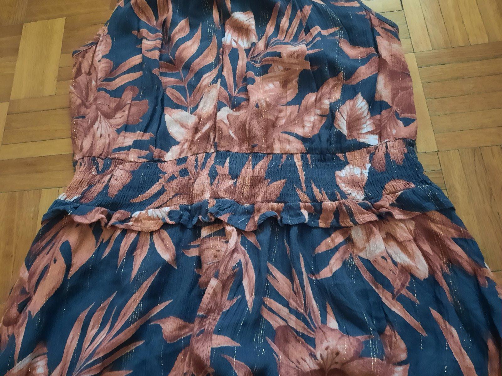 Krásne vzorované dlhé šaty s volánom okolo dekoltu. Z boku majú aj skryté vačky. Pod prsiami sú husto nariasené gumou. Z boku sú dlhšie rázporky. Dajú sa nosiť spustené na ramená, aj klasicky.