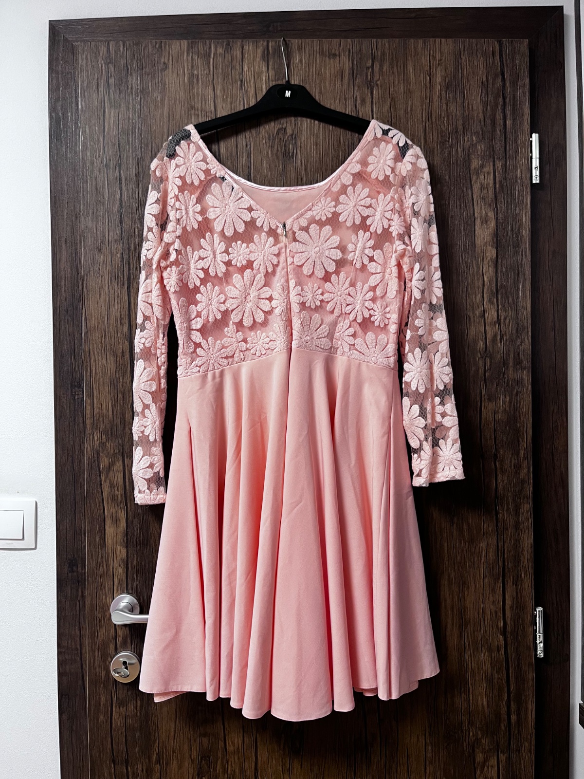 Raz oblecene krasne spolocenske saty. Bledo lososova farba. Vzadu zips. Maju kruhovu suknu. Su lahucke. Cez prsia 45cm. Dlzka siat cca 93cm.