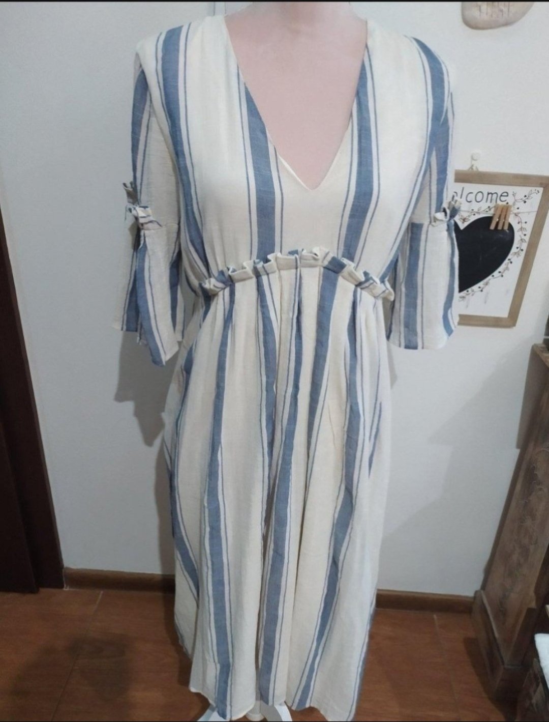 Nosené super stav,vzadu sa viažu na maslu,podšite. Veľmi krásne šaty na leto,veľmi príjemné do letného počasia.