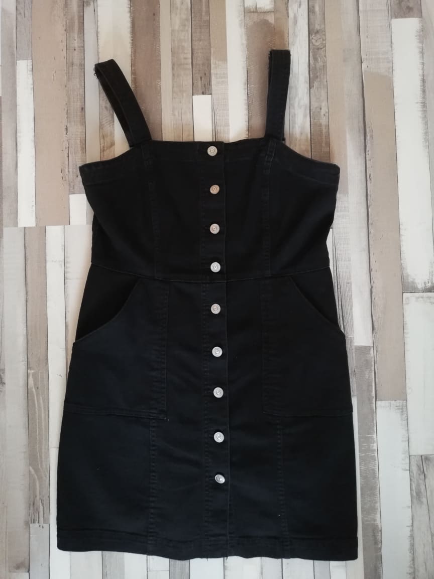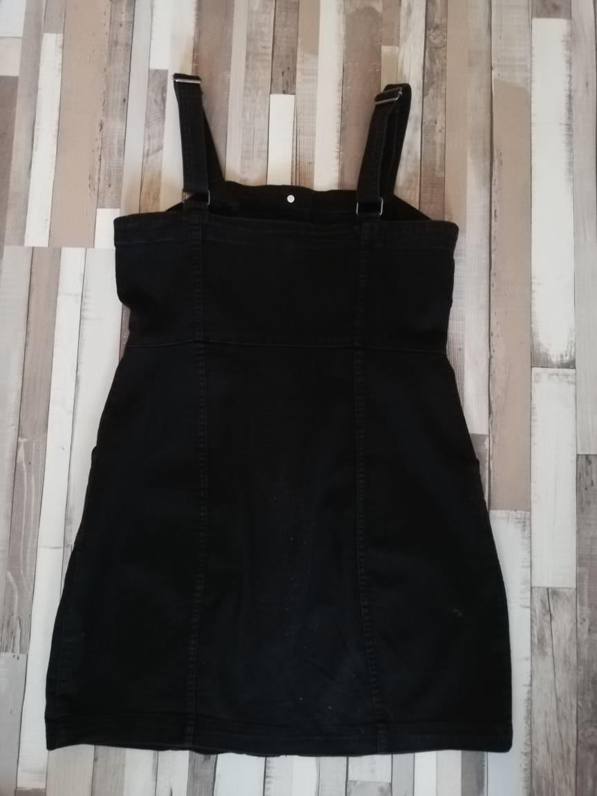 Predám málo nosené šaty. Krátke, jemne vypasované overalové šaty zo strečového denimu. Zapínanie na gombíky vpredu, široké nastaviteľné ramenné popruhy a šev v páse s našitými vreckami. Obvod hrudníka 86 cm. Obvod pásu 80 cm. Dĺžka od hrudníka: 67 cm.