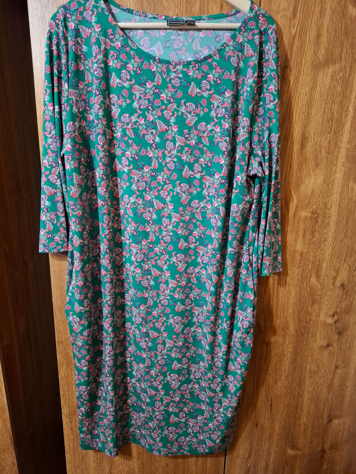 Nekrčivé elastické zelené šaty s ružovými kvietkami, po bokoch vrecká. Uvedená veľ. 44/46, ale určite väčsie. Šírka 62cm(povolia ešte), dĺžka 100cm.