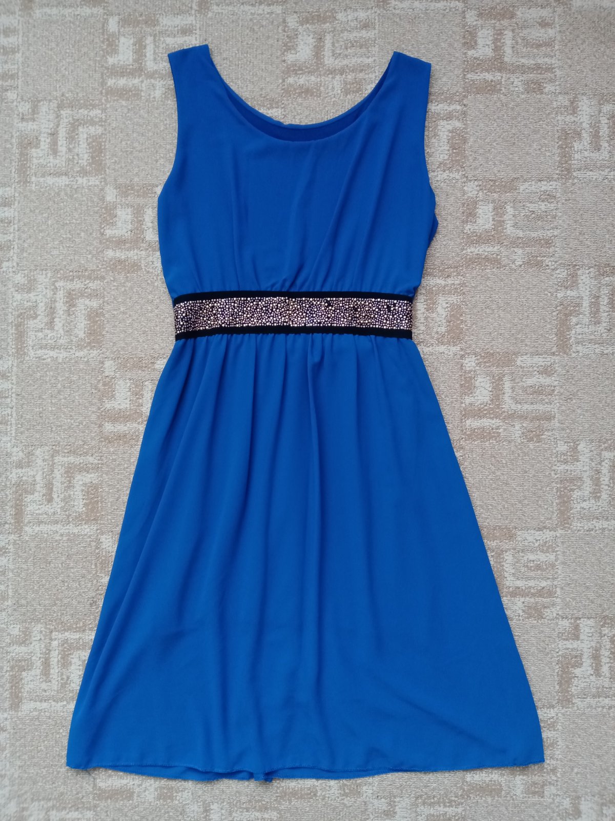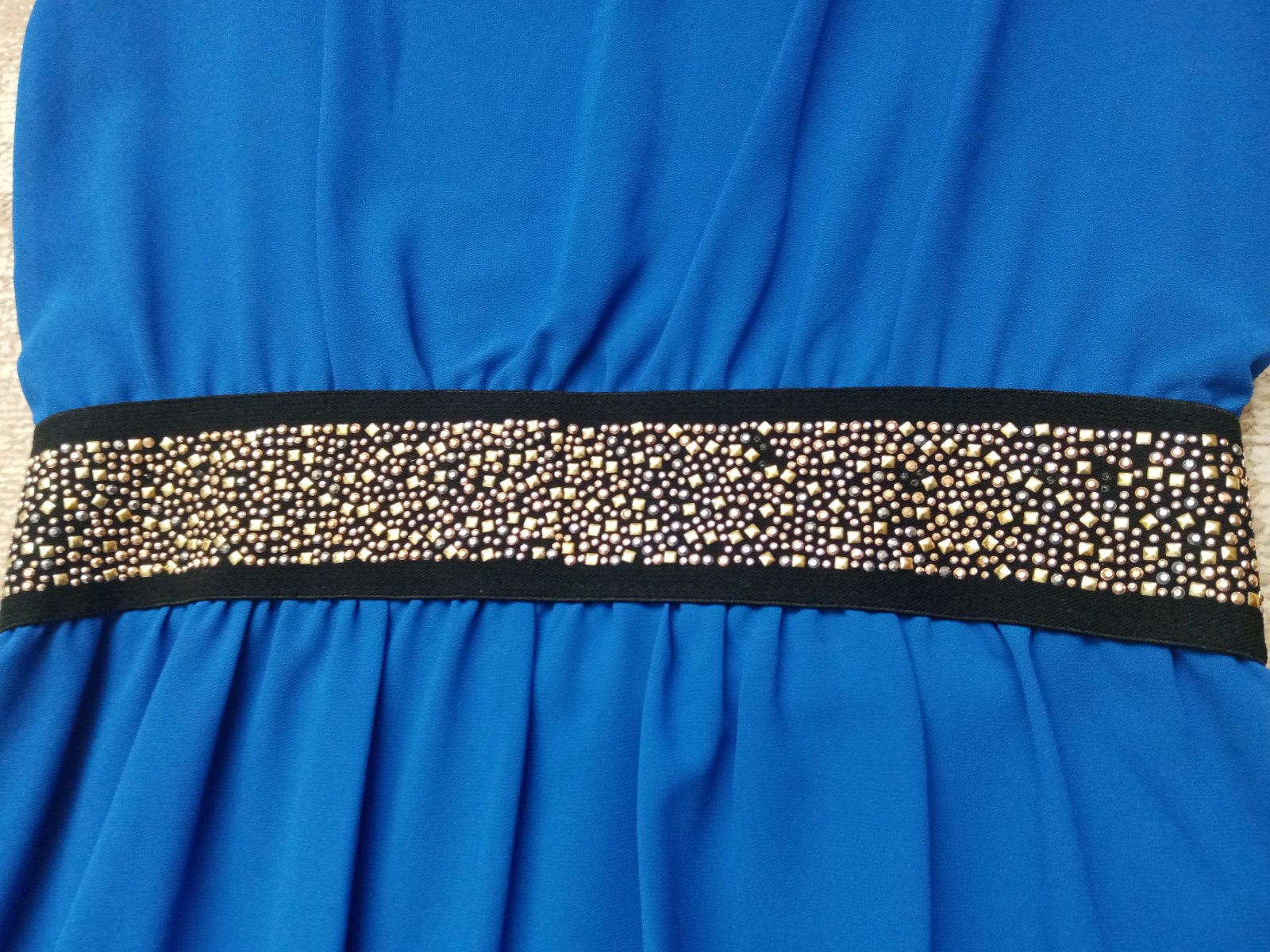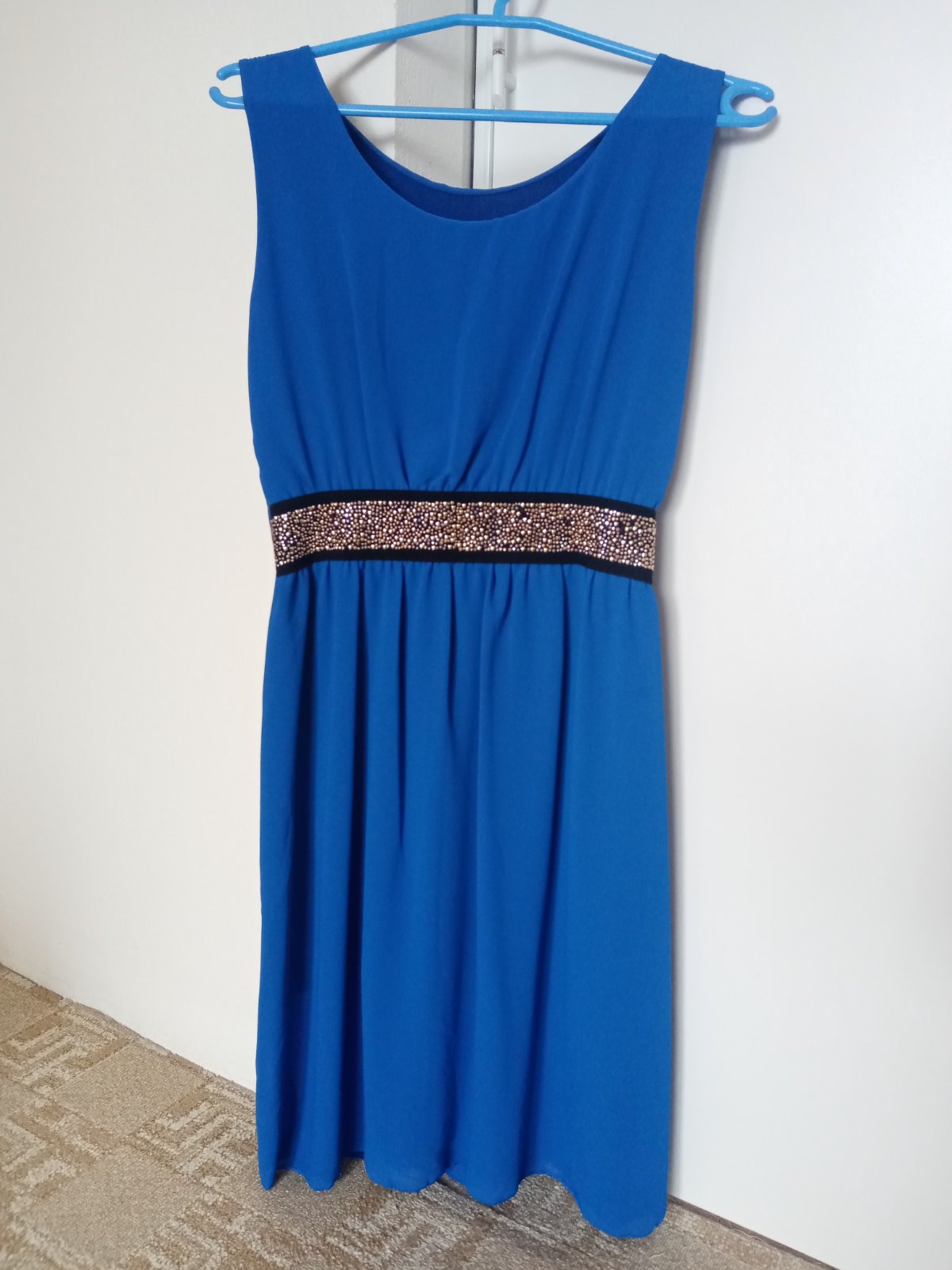 Šaty v kráľovskej modrej, so zdobením v páse. Šaty sú vo výbornom stave, iba v dekore chýba niekoľko kamienkov, ale nič čo by nejako udieralo do očí (viď posledná foto). Krásna sýta farba. So spodničkou.