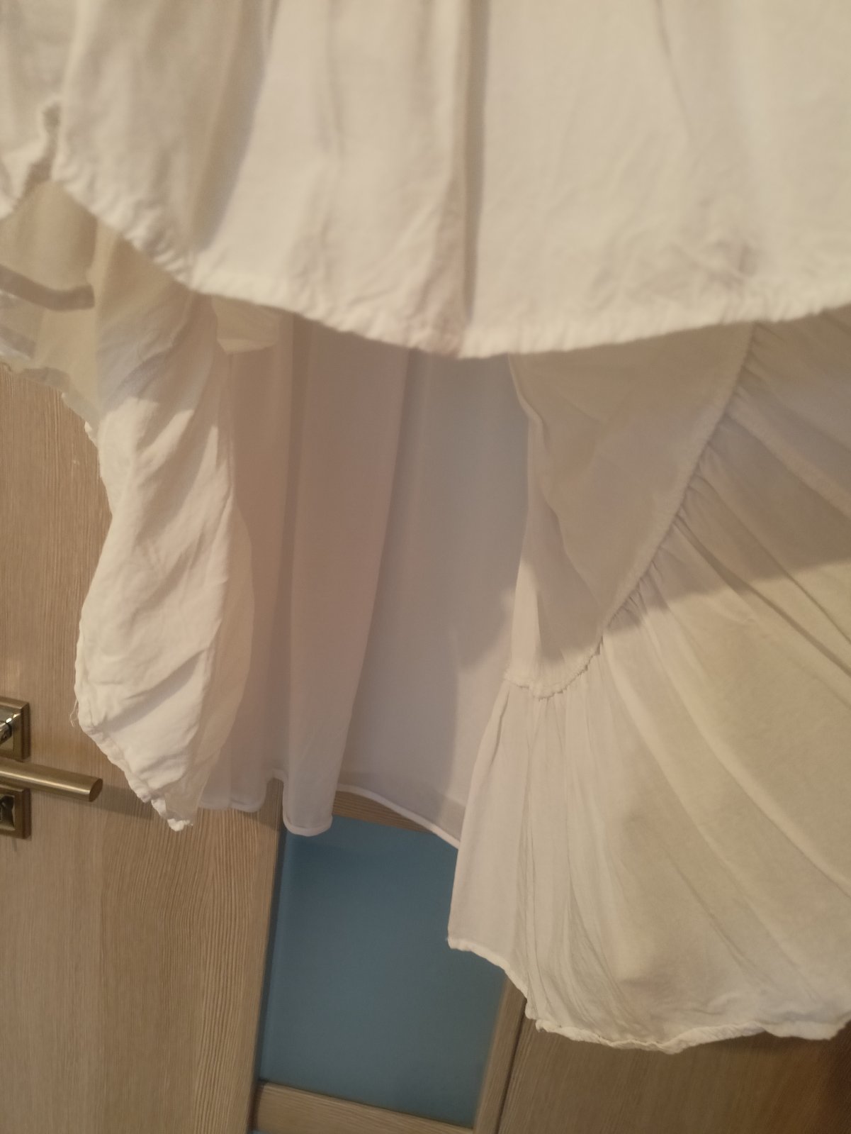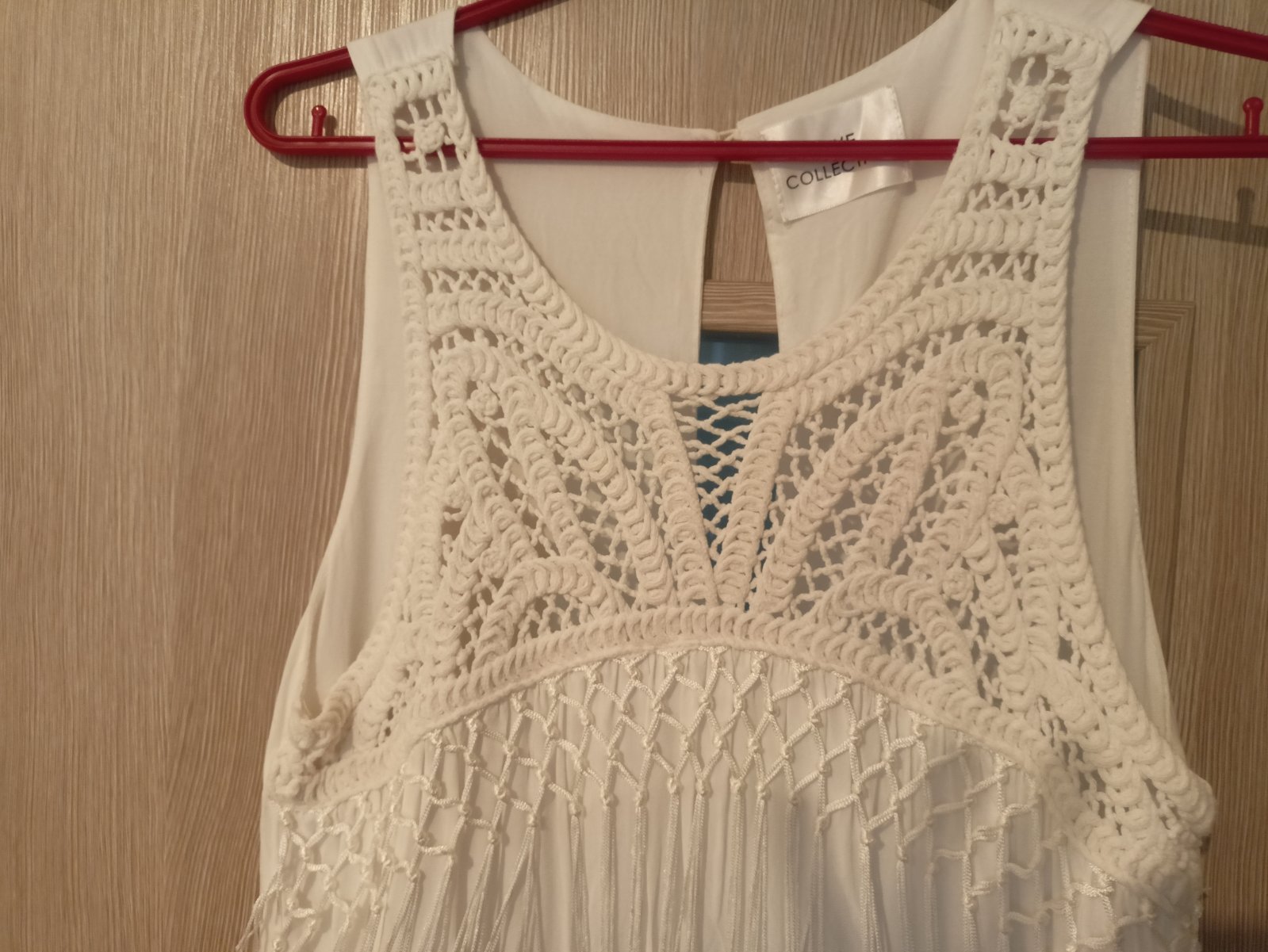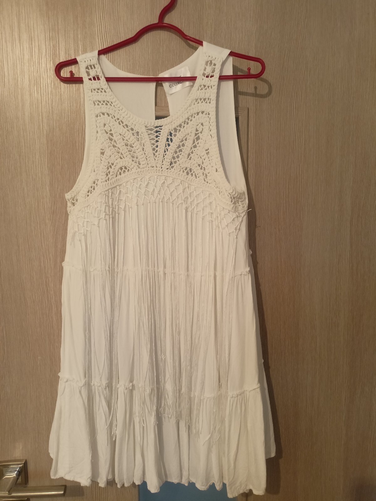 Predám svetlé strapcové šaty, sú mini, vhodné na veľkosť S, rozmery na fotkách. Šaty majú akoby dve vrstvy. Odfotený je aj materiál.
