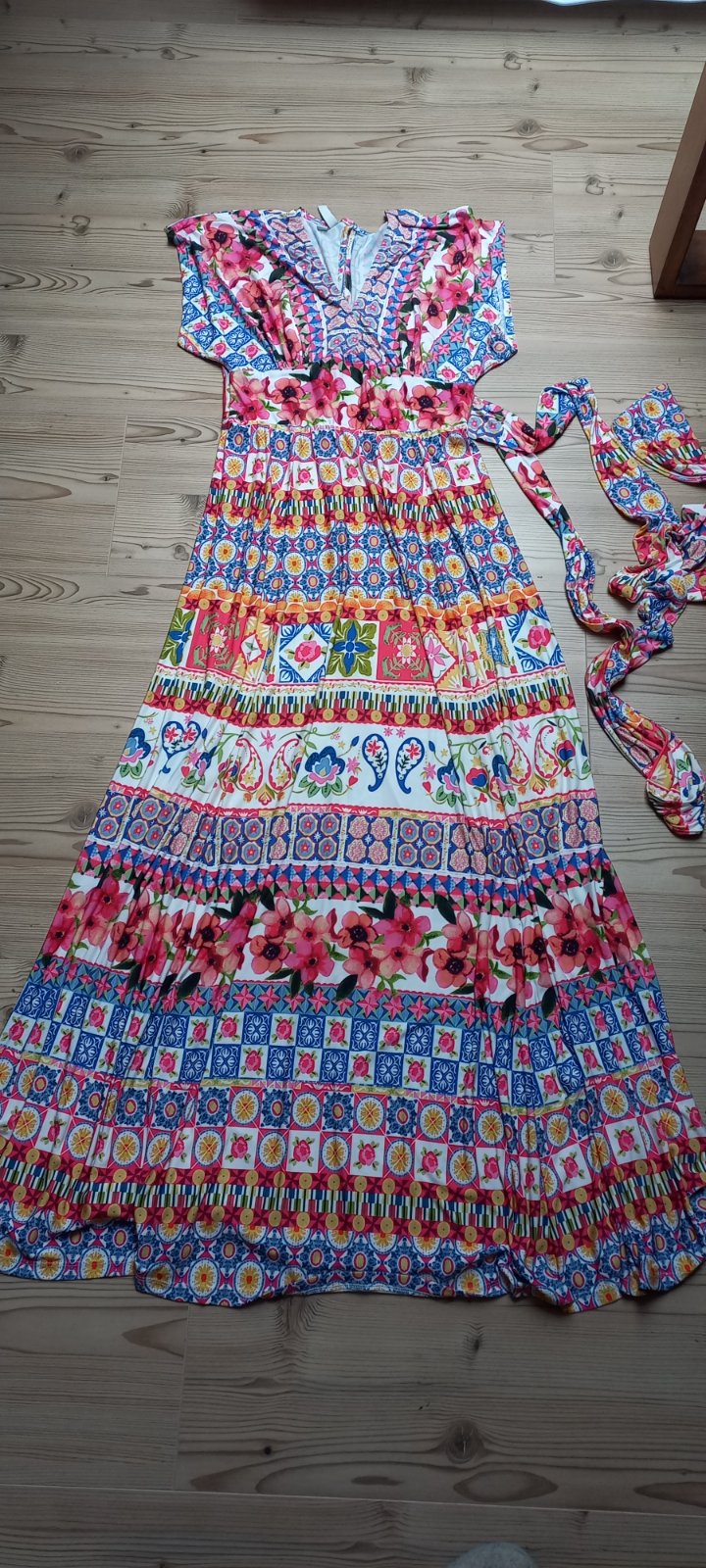 Nadherne saty po zem, oblecene raz na dovolenke. Velkost je 38/40, krasne sa prisposobia postave. Su na vyssiu postavu od 172 cm. S latkou na zaviazanie masle.