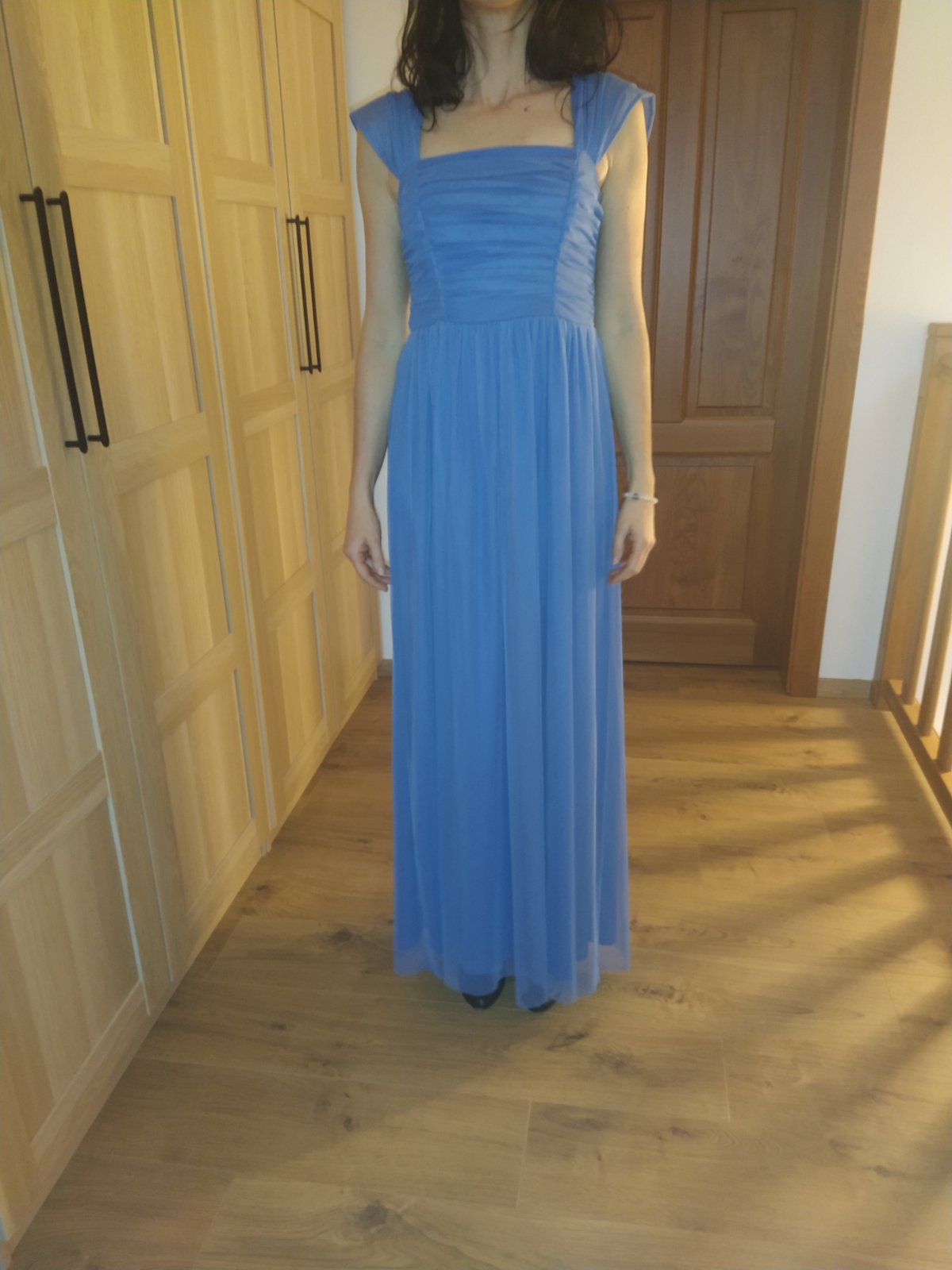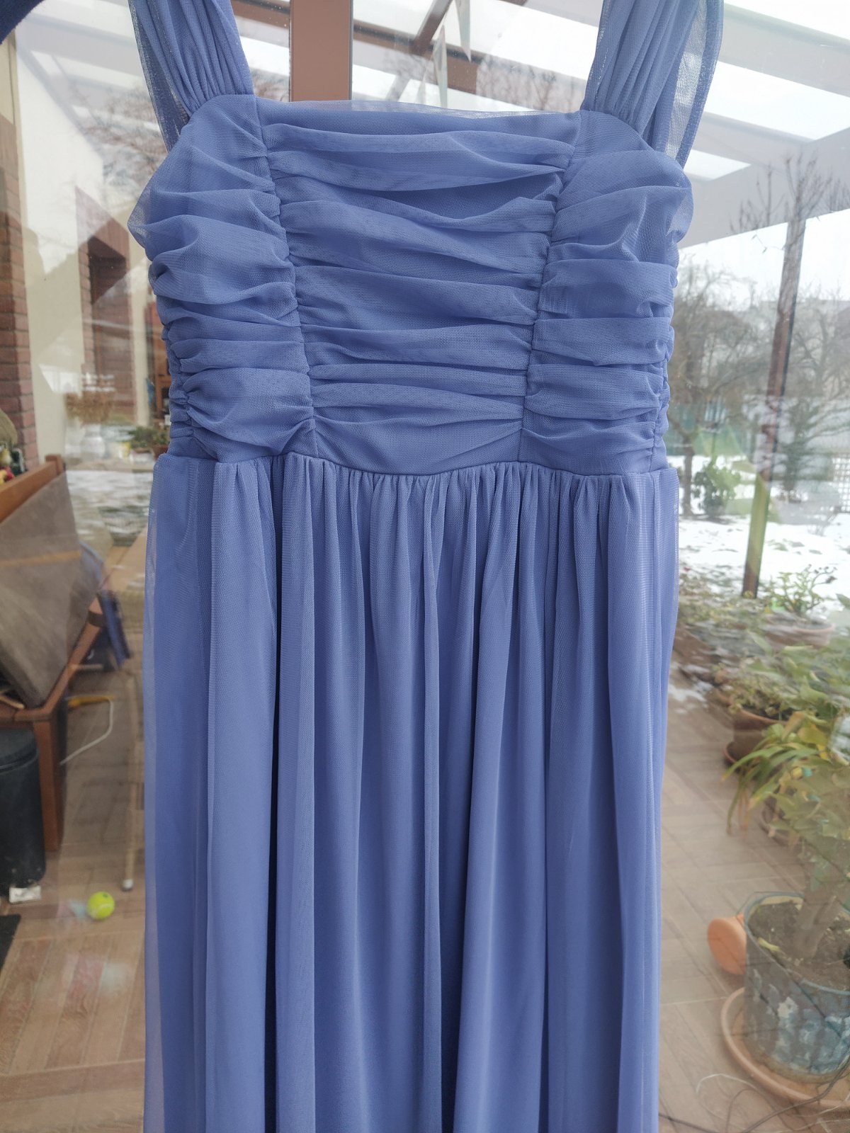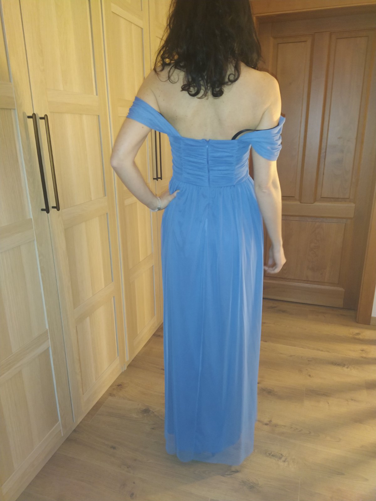 Krasne saty Mohito kupene pred rokom a pol, na ples, ci svadbu, stuzkovu Ja som ich mala len raz na plese. Farba levandulova, na foto vyzera skor do modrej. Na poslednej foto su odfotene vonku na prirodzenom svetle. Bezne nosim S/M, mam 175 cm
