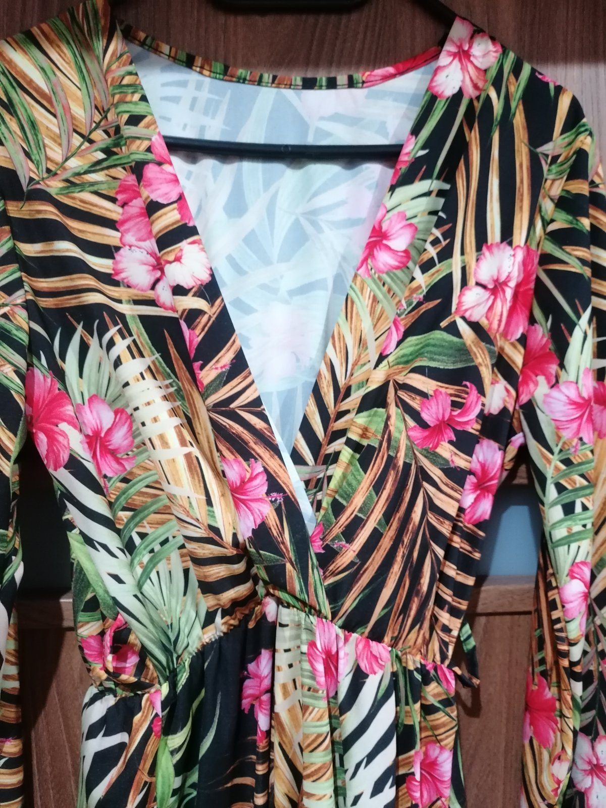 Raz oblečené dlhé spoločenské šaty Floral Beauty. Veľkosť UNI. Šaty sú podšité, bez zipsu či gombíkov. Gombíky sú len ozdobné na prsiach.
