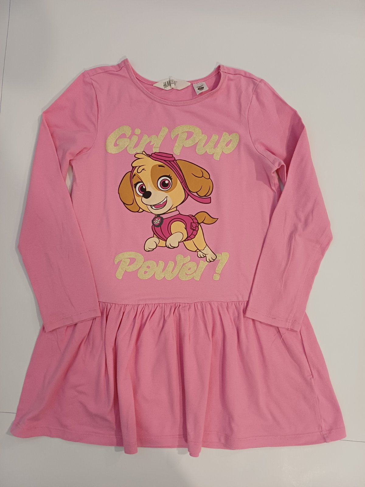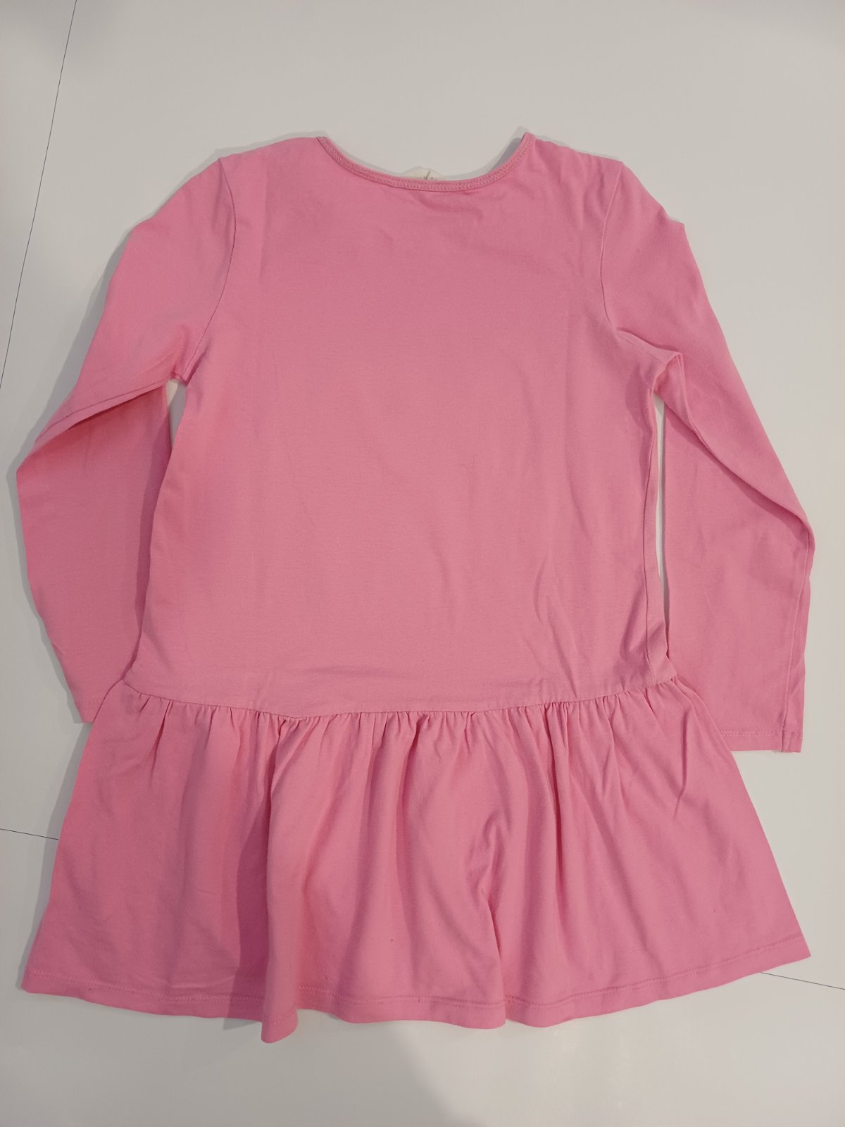 Predám šaty s dlhým rukávom vo veľkosti 122/128. Stav bez poškodení a bez fľakov, vyblednutejšia farba oproti novému stavu, jemné žmolky.