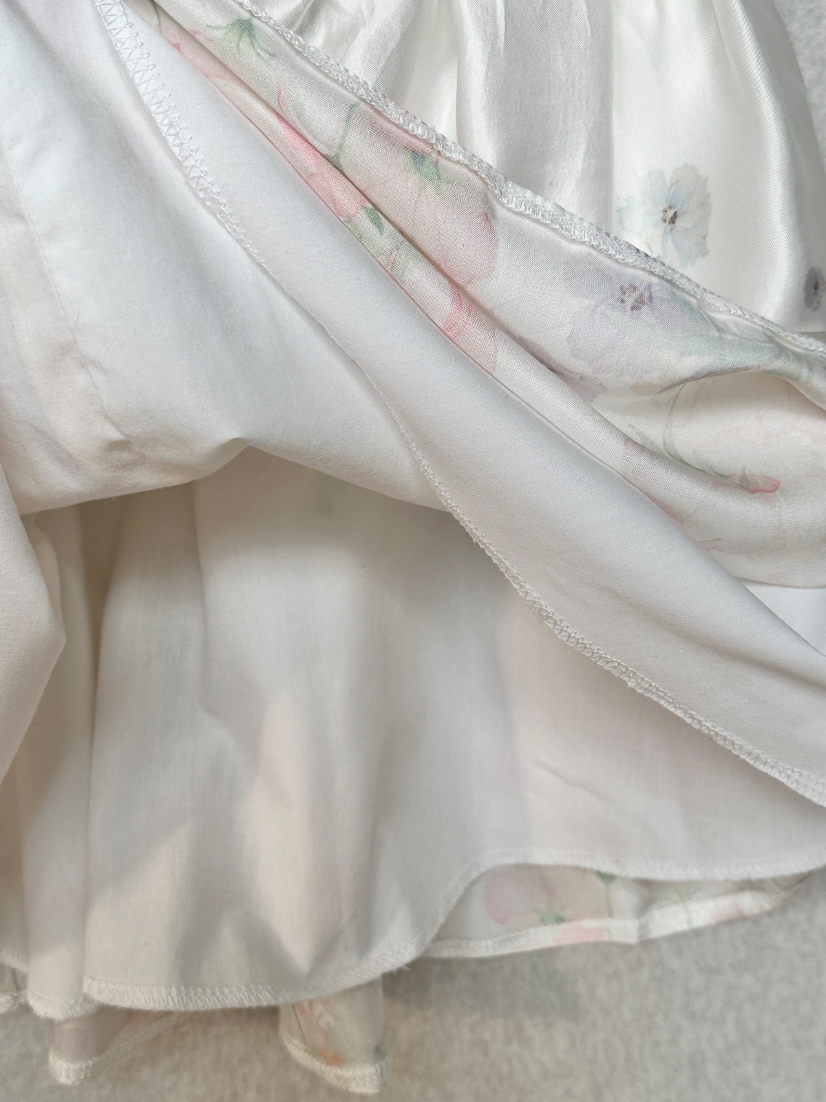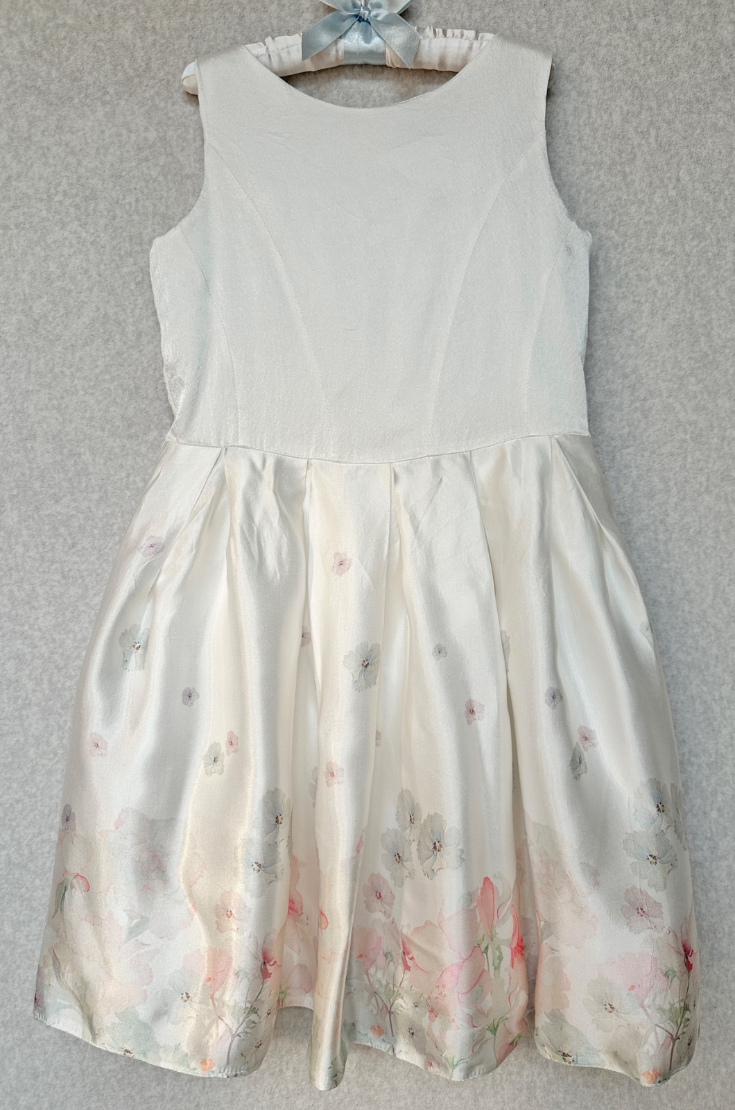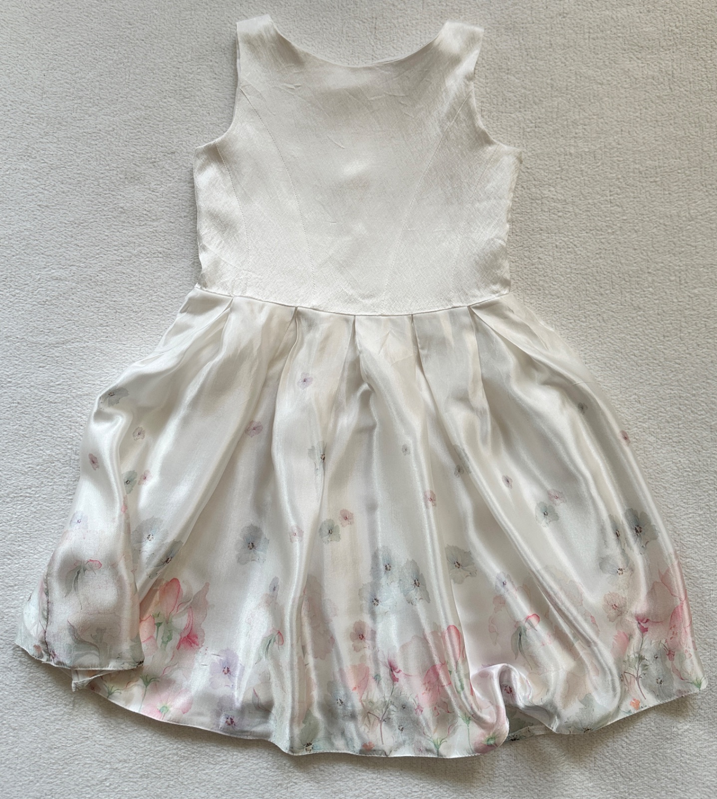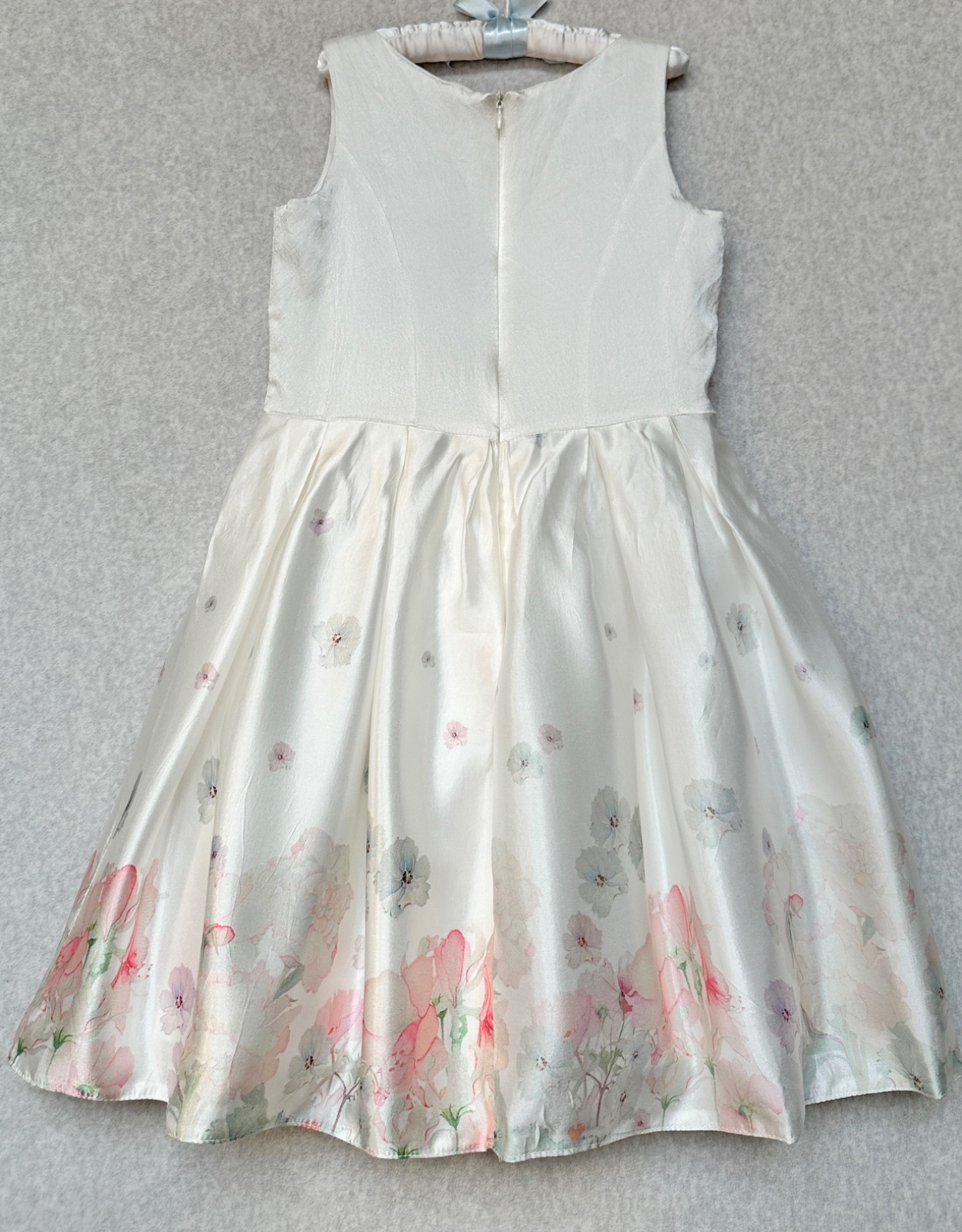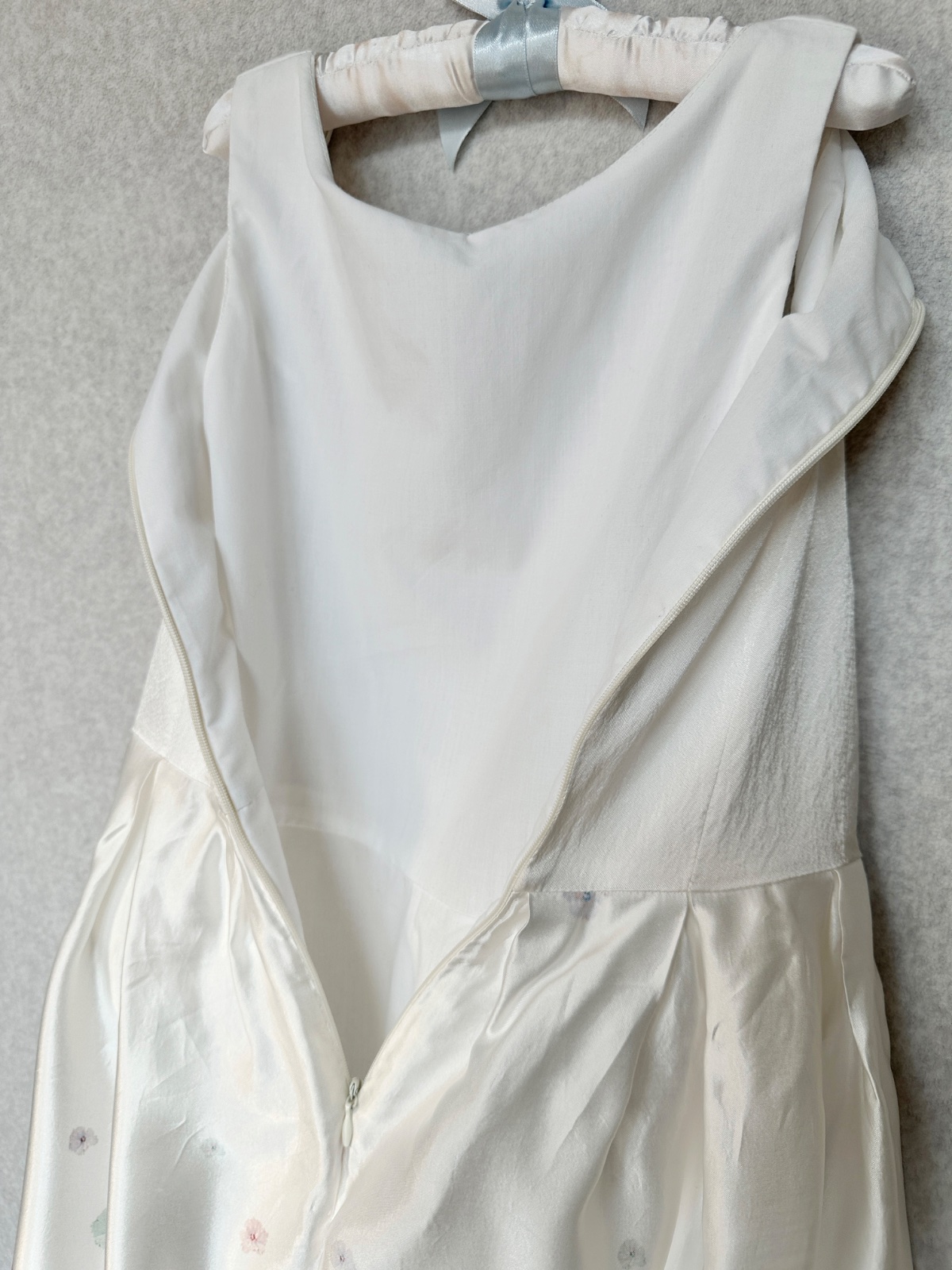 Slávnostné šaty v teplej bielej farbe s jemnými pastelovými kvietkami v spodnej časti sukne. Zapínanie vzadu na chrbáte na skrytý zips. Sú celo-podšité bavlenenou látkou.