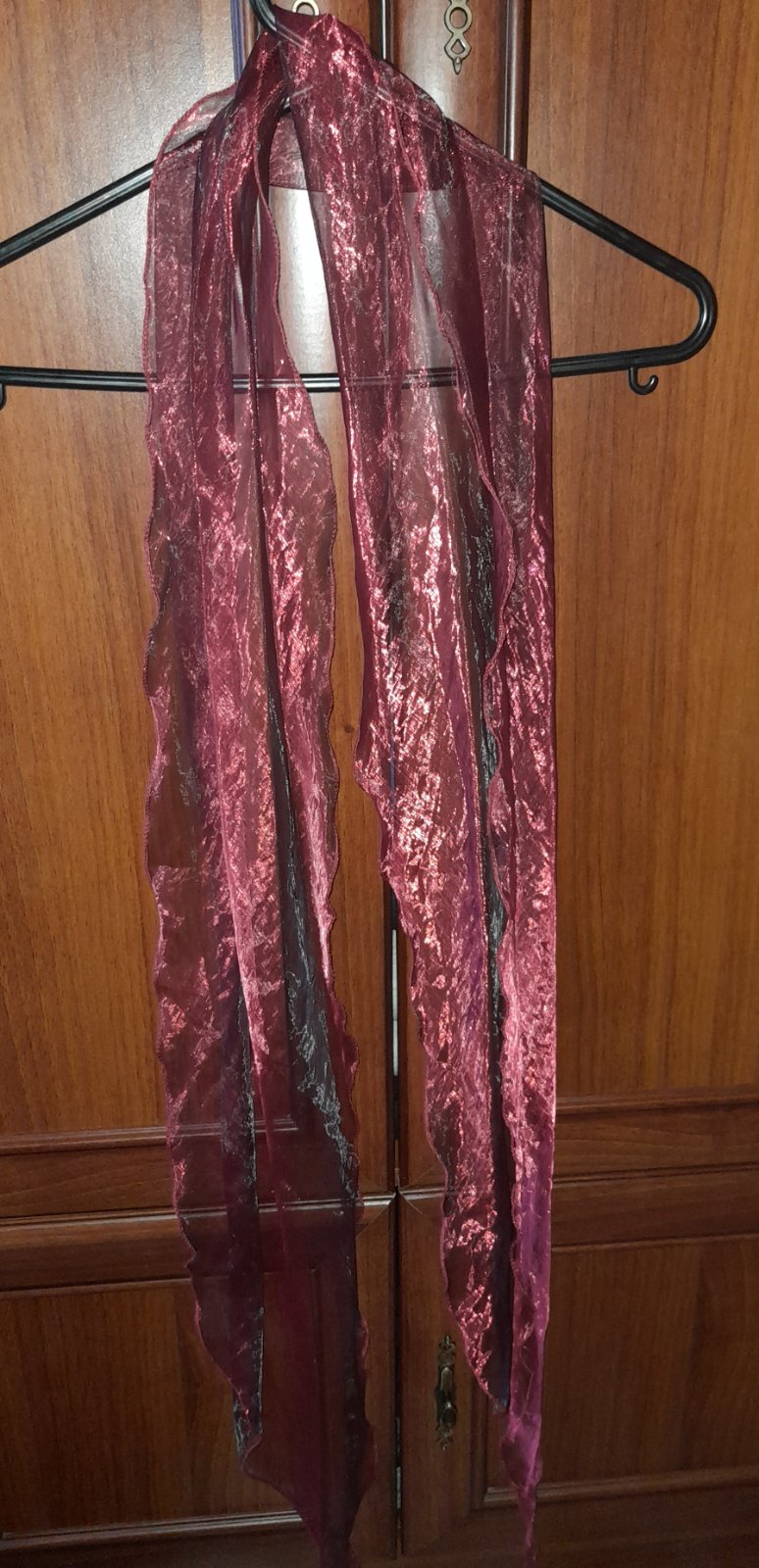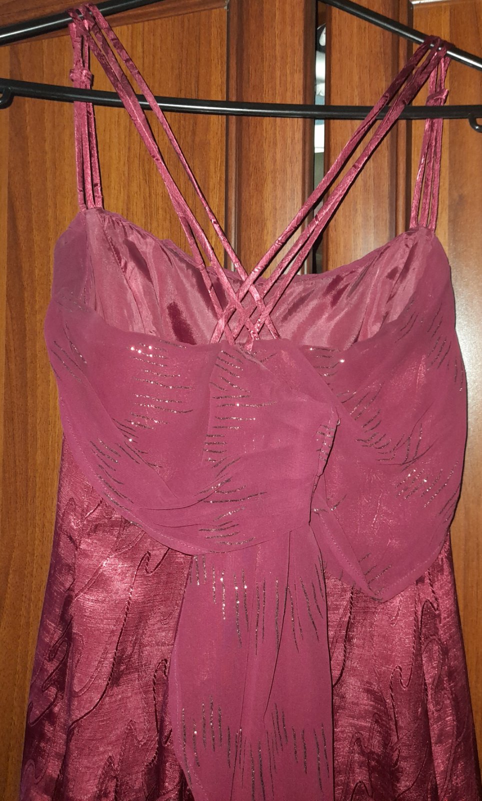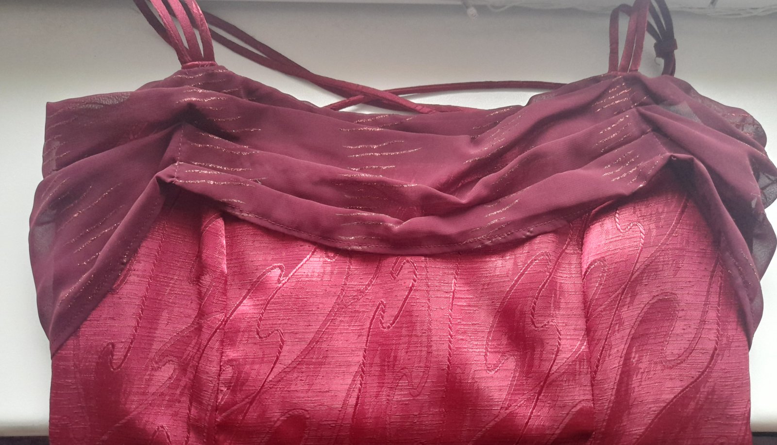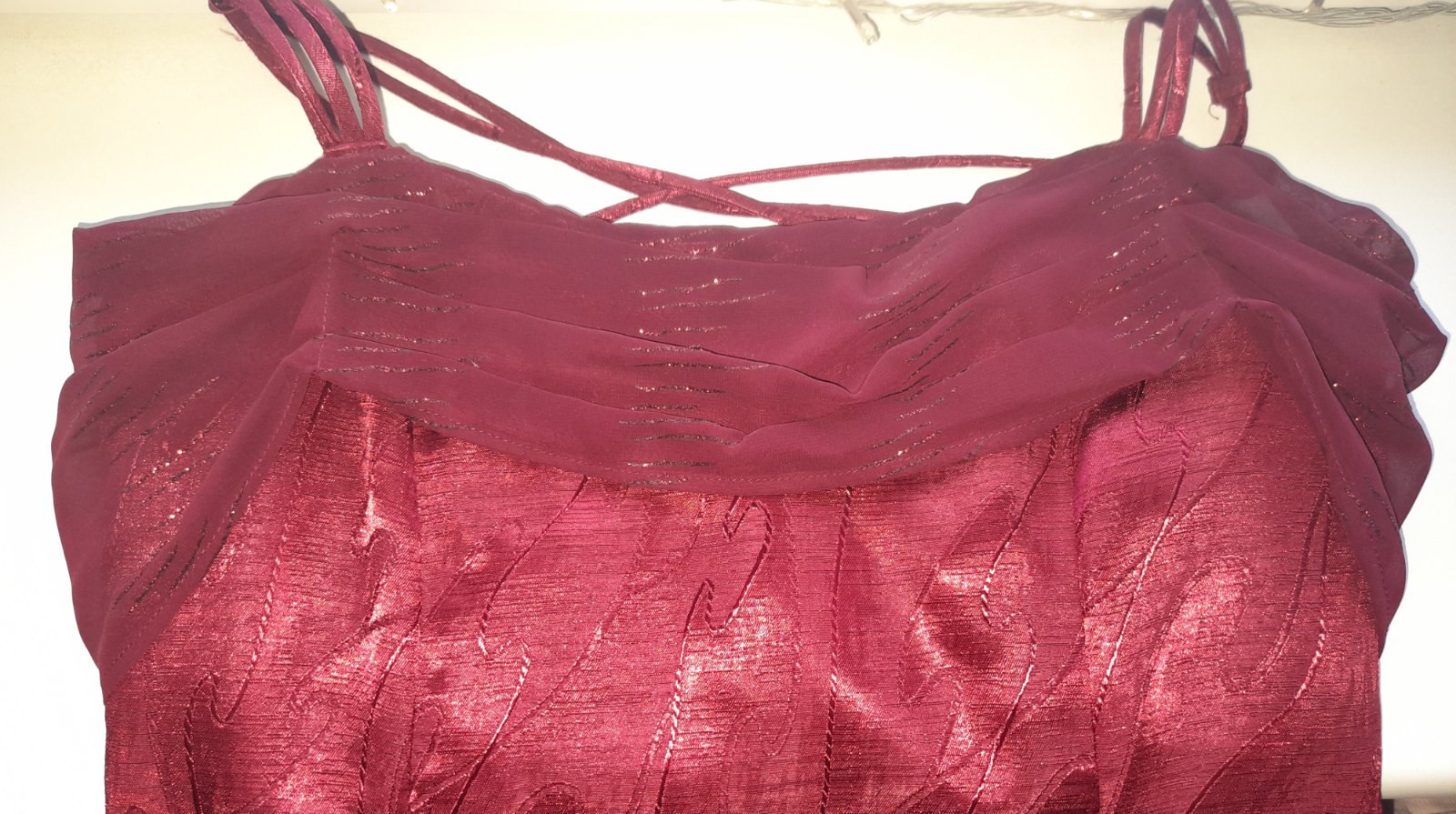 Šaty dĺžka s ramienkami 140 cm, rozparok od spolu 55 cm, podšité, vzadu v strede zips, ramienka nie sú nastaviteľné, vzadu prekrížené, šírka pás 41x2 cm, šírka prsia 45x2cm, nepoškodené, vzaté 2x bez známok nosenia, v oblasti dekoltu doplnok vo forme šatky ktorá sa dá odpárať a teda ostanú iba šaty