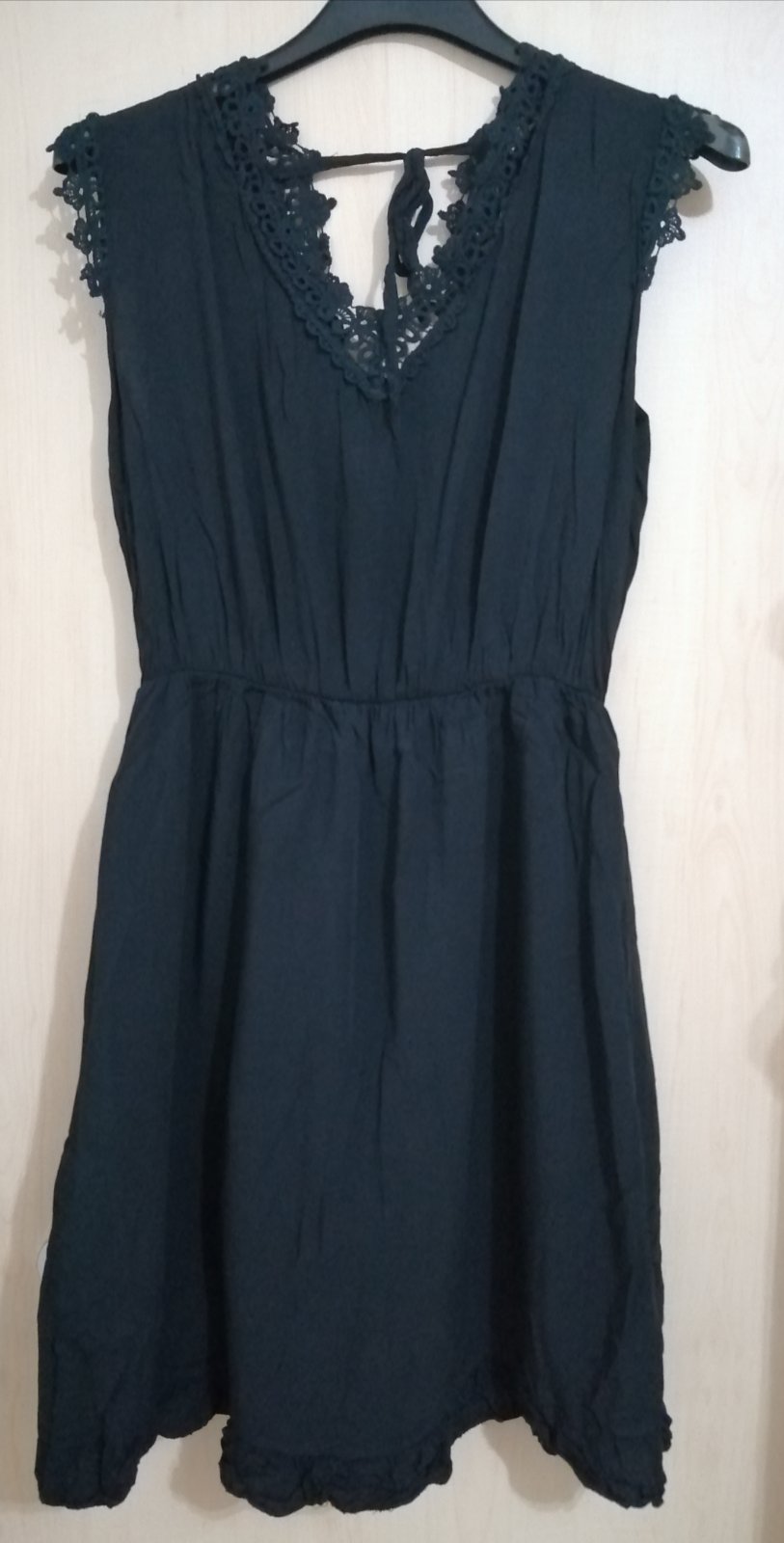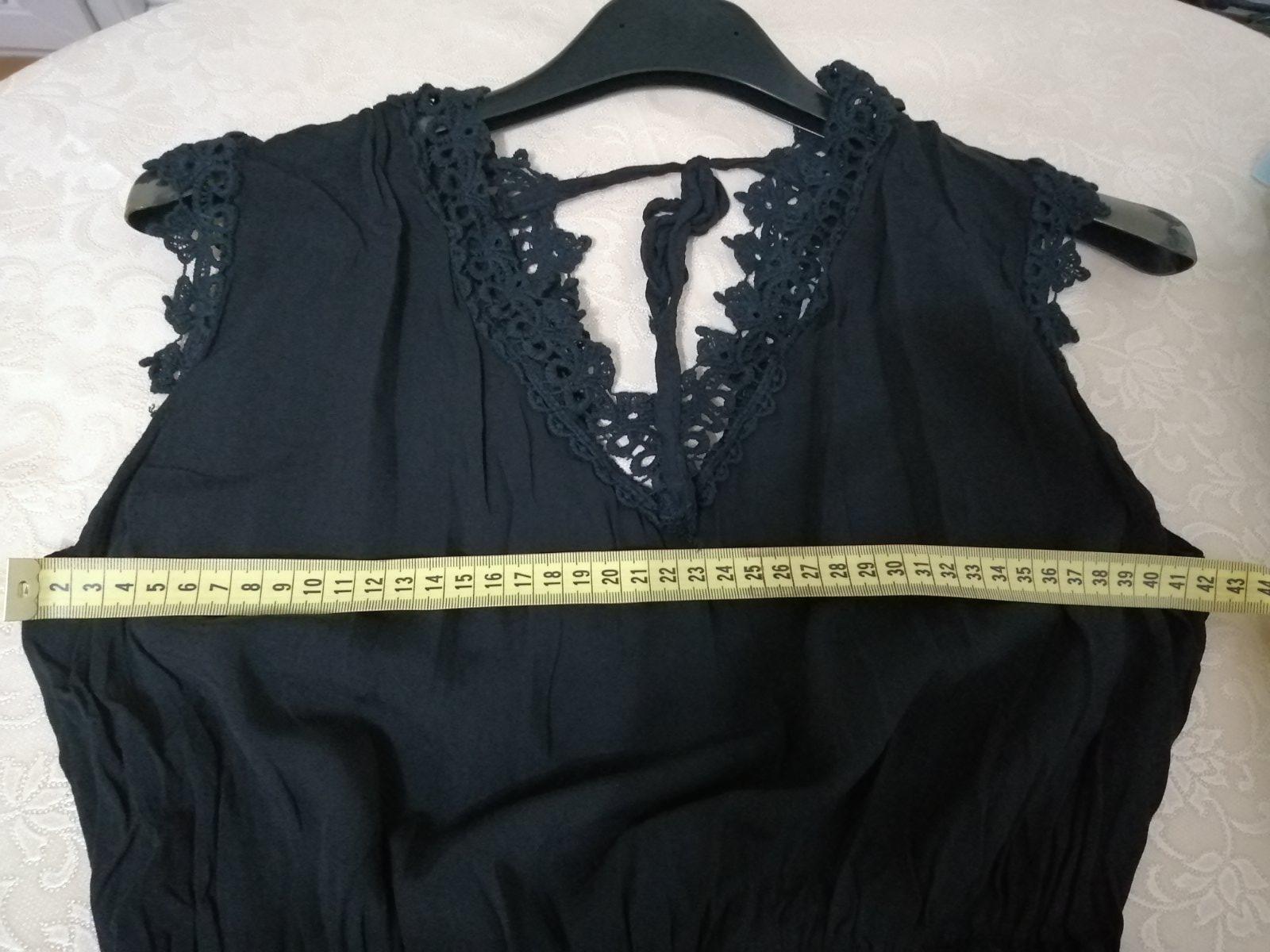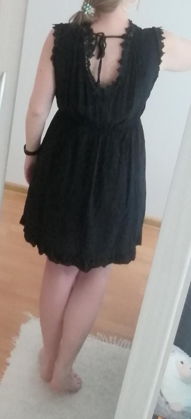 Predám minimálne nosené dámske letné šaty, dĺžka 90 cm, na chrbte väčší výstrih a zaväzovanie na šnúrku, podšité ľahkou spodničkou z fáčoviny, čierna farba. Ostatné miery na foto, v páse gumička.