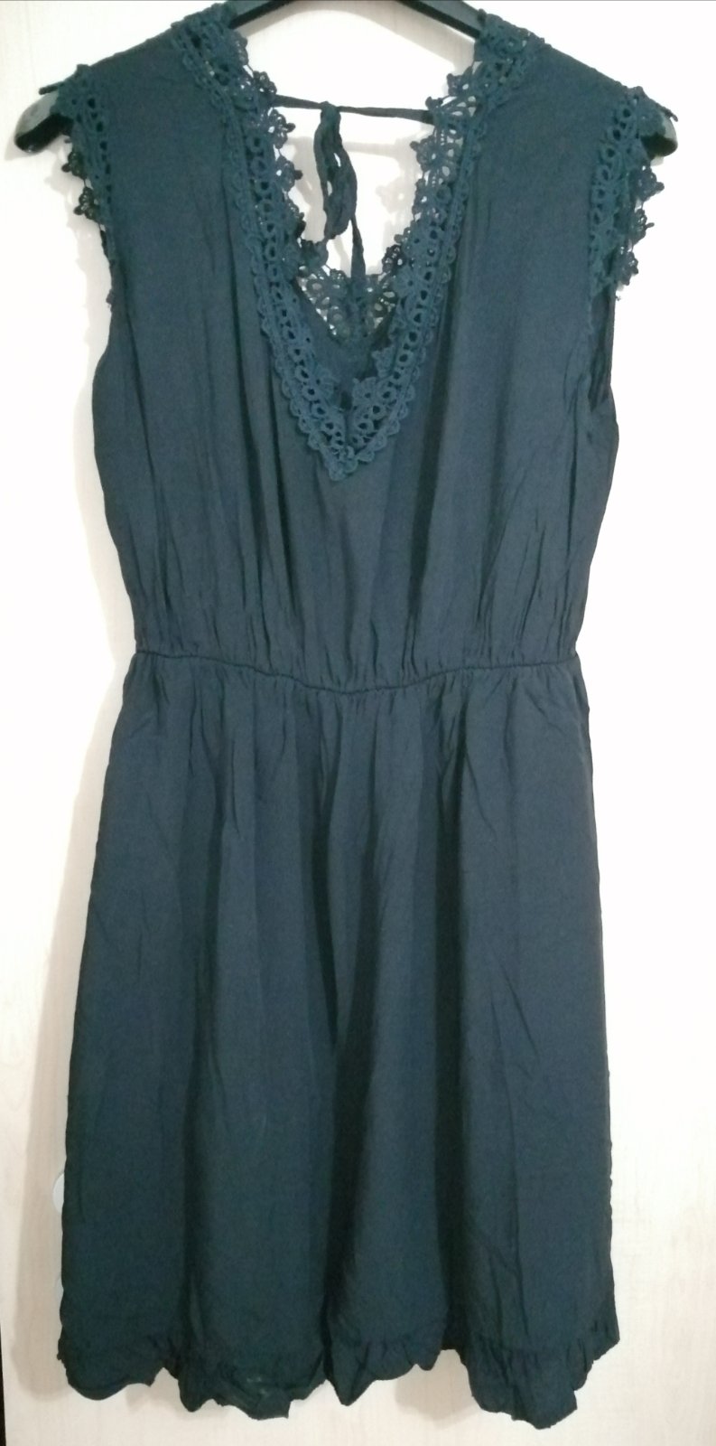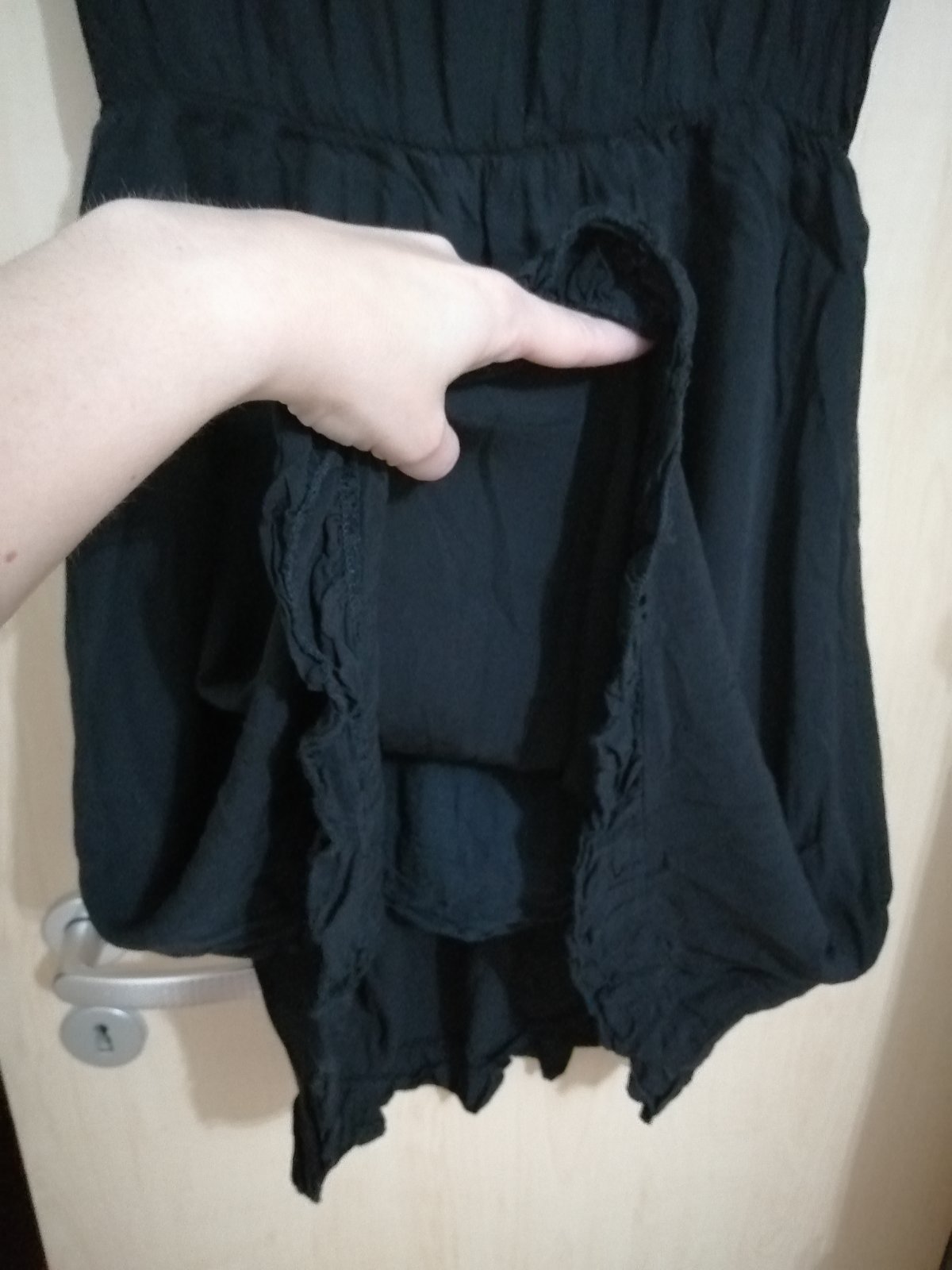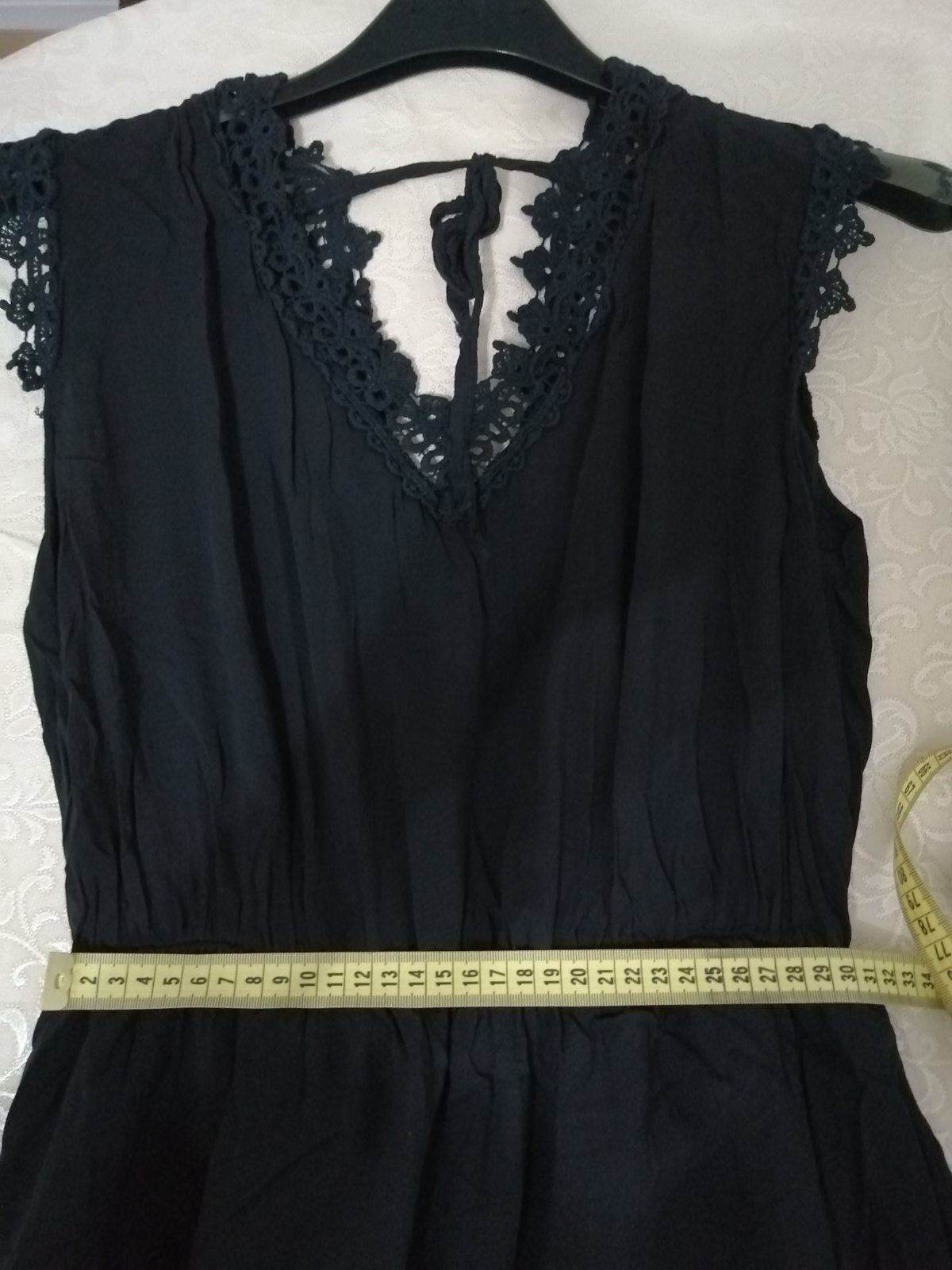 Predám minimálne nosené dámske letné šaty, dĺžka 90 cm, na chrbte väčší výstrih a zaväzovanie na šnúrku, podšité ľahkou spodničkou z fáčoviny, čierna farba. Ostatné miery na foto, v páse gumička.