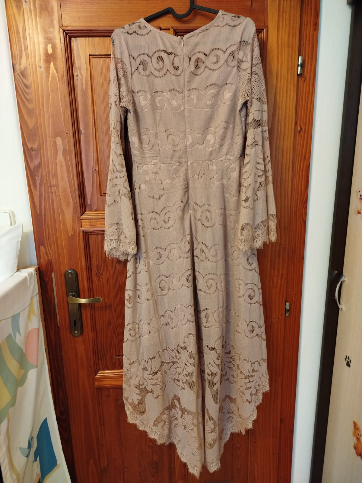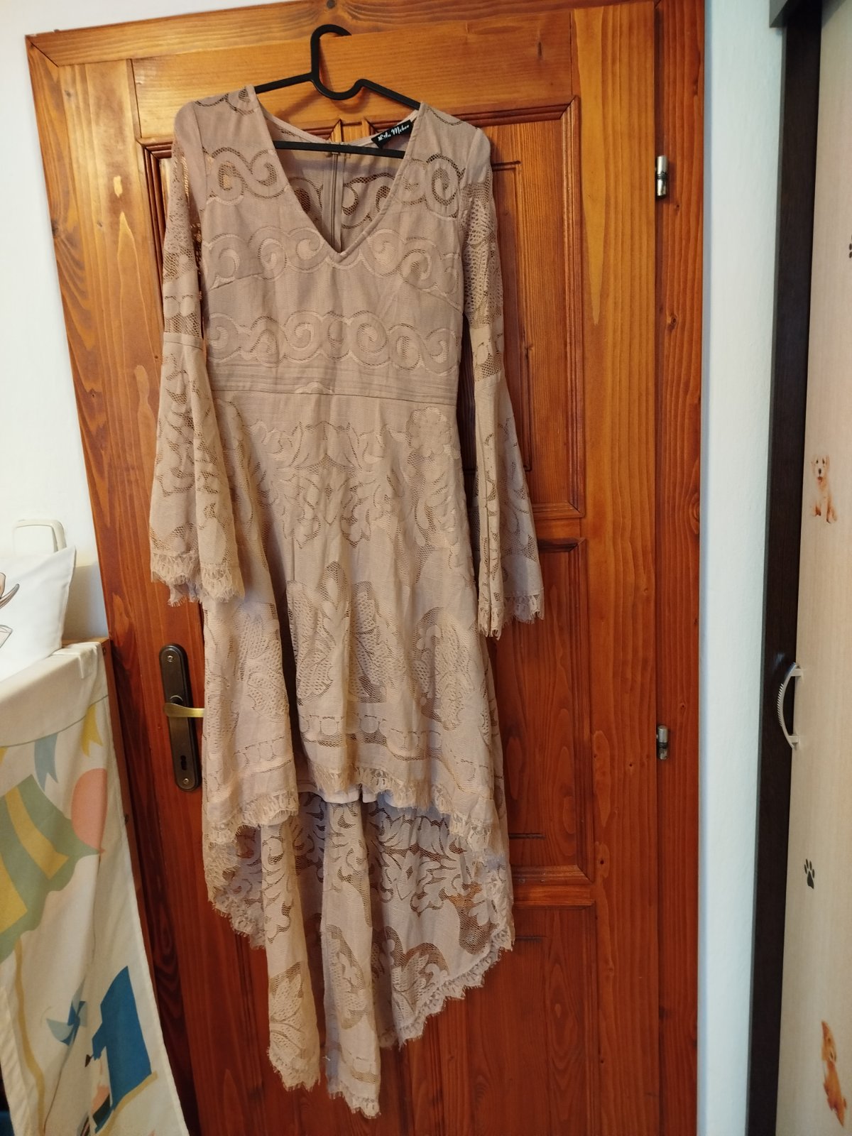 Krásne spoločenské jemnoružové šaty s aplikáciou bielej krajky na prednom aj zadnom diele a bohato riasenou sukňou so spodničkou. Zips všitý z boku. Sú pár krát oblečené bez poškodenia v peknom sta...
