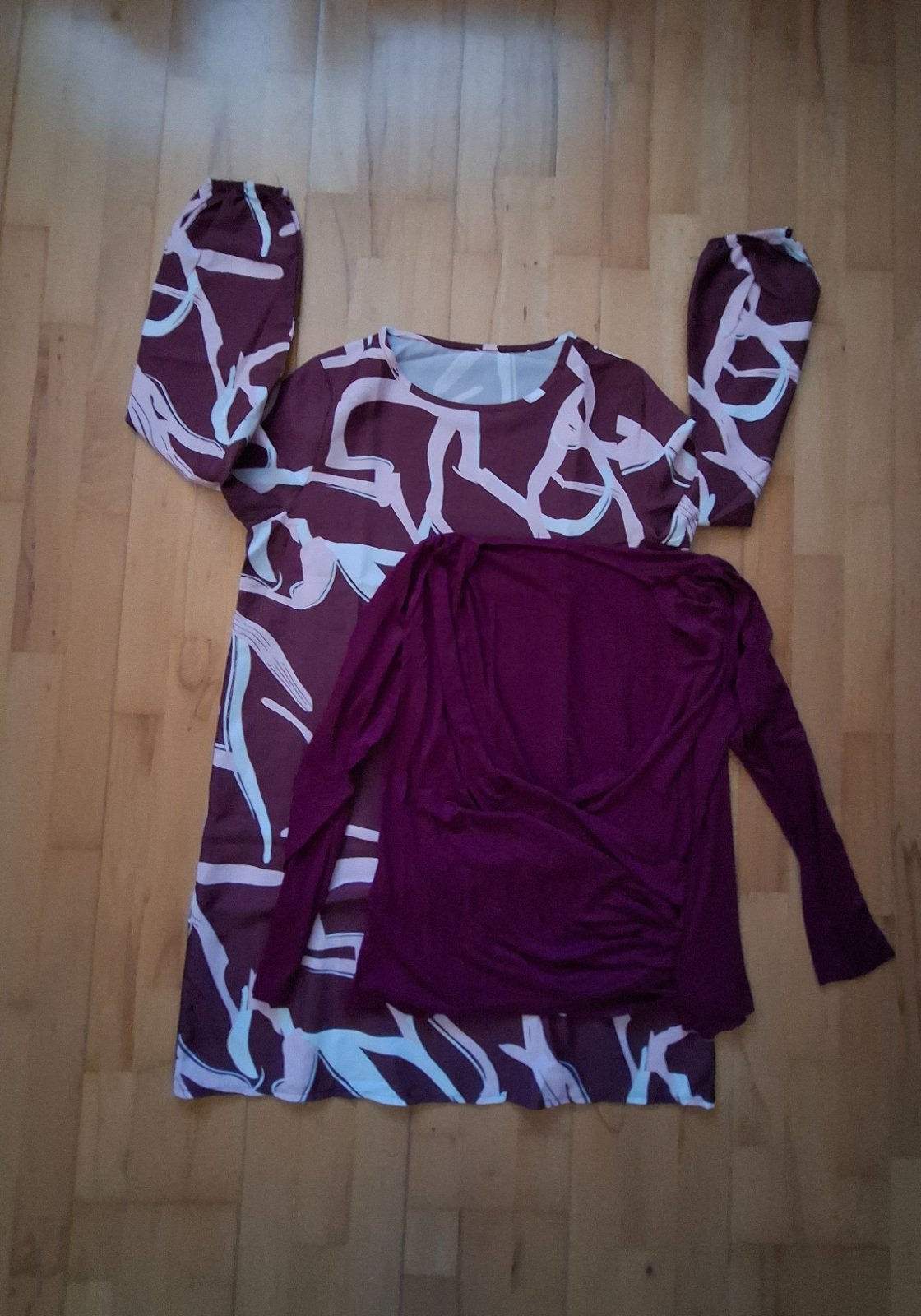Perfektné šaty malinovej farby z polyesteru a elastanu, rukávy zo šifónu. Dĺžka - 93 cm, šírka pod pazuchami - 2x 51 cm, strih do A, boky - 2x 61 cm, rukáv od krku - 67 cm.