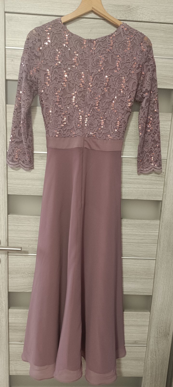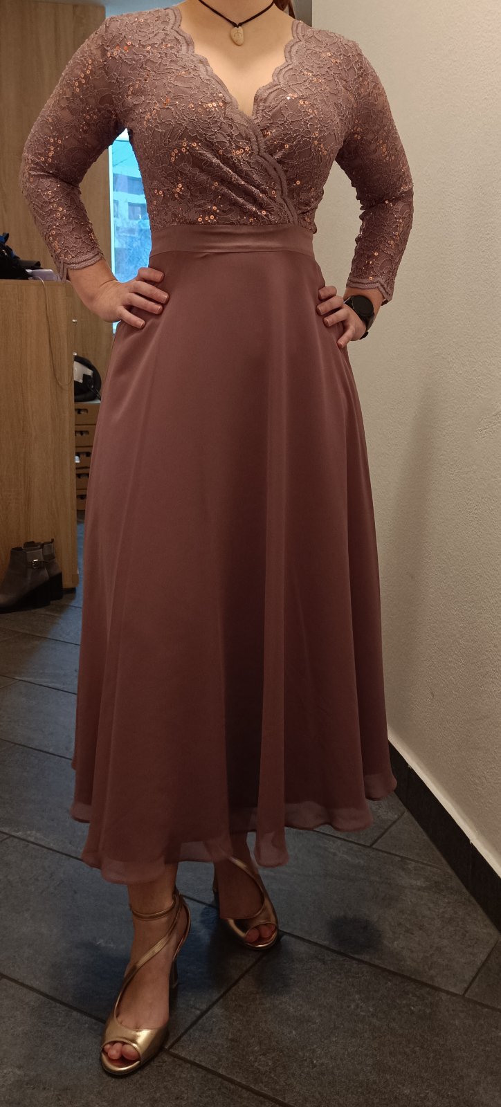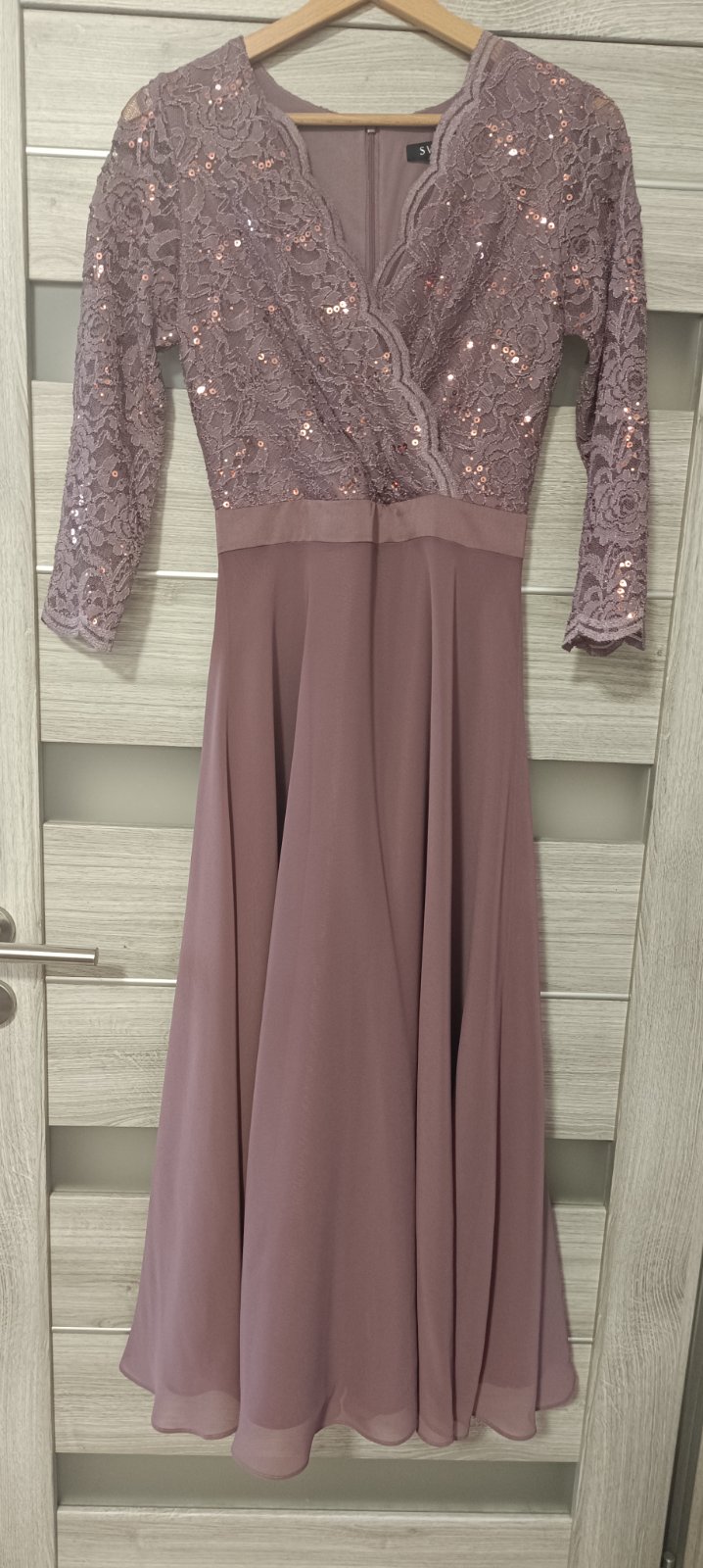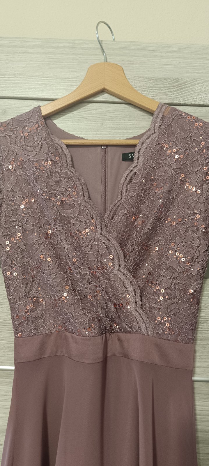 Ponúkam na predaj luxusné koktejlové šaty zn. Swing vo veľkosti XS. Šaty boli použité 1x na spoločenskej udalosti. Farba je zaujímavá - taká staro-ružová (najpríbuznejšia na tej fotke na tele). Vrchná časť je čipkovaná, 3/4 rukáv, výstrih do V prekladaný, sukňa tylová so saténovou spodničkou. Sú vyčistené. Upozorňujem - na sukni som pri žehlení našla 2 mini bodky, netuším z čoho, skutočne minimálnych rozmerov (viď foto). Pri bežnom nosení ich nevidieť. Vzadu zips. Sú nádherné. PC 179,99 EUR.