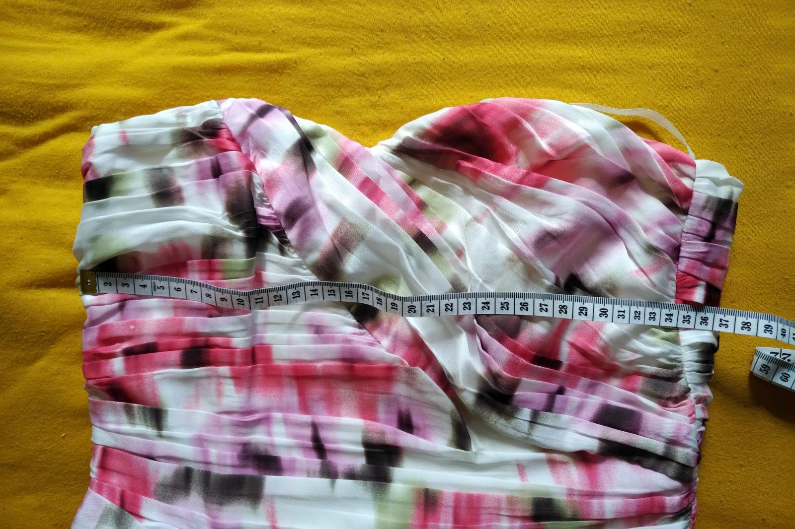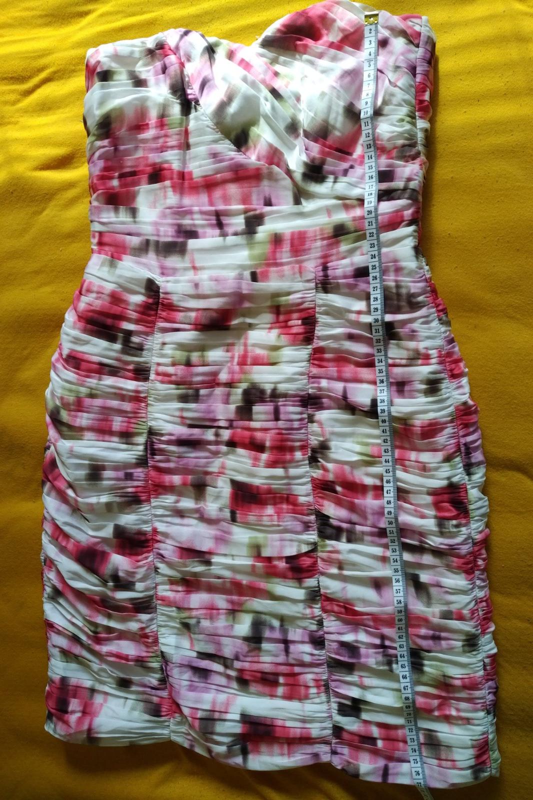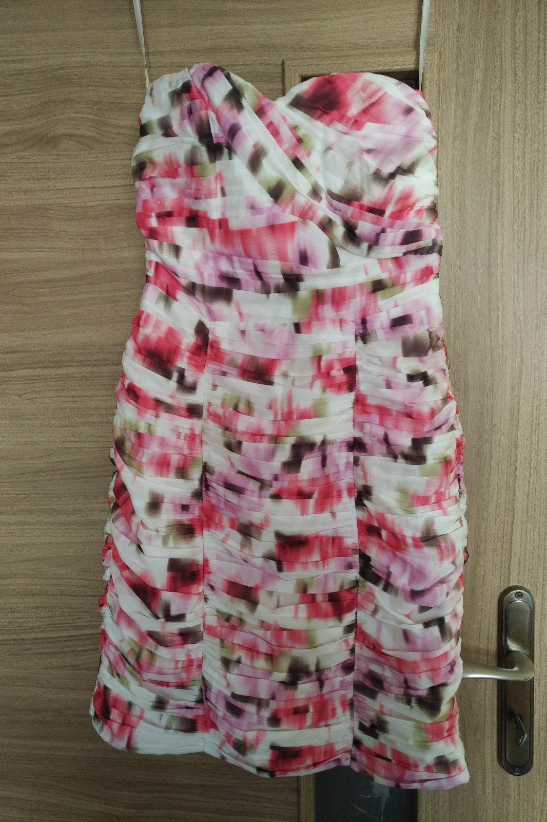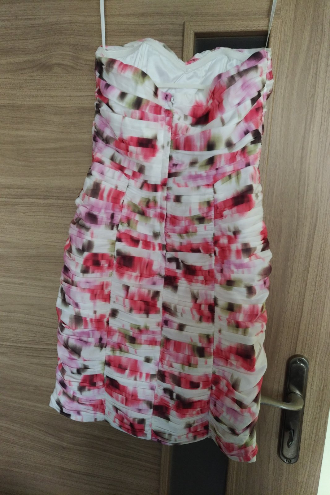 Krásne spoločenské šaty bez ramienok. Zvnútra je po hornom okraji silikonový pásik, vďaka ktorému sa šaty nešmýkajú dole. Od pása nadol sú trošku širsie, nie je teda problém ak má niekto užší pás a širšie boky, sedia perfektne. Dĺžka nad kolená. Oblečené 2x.
