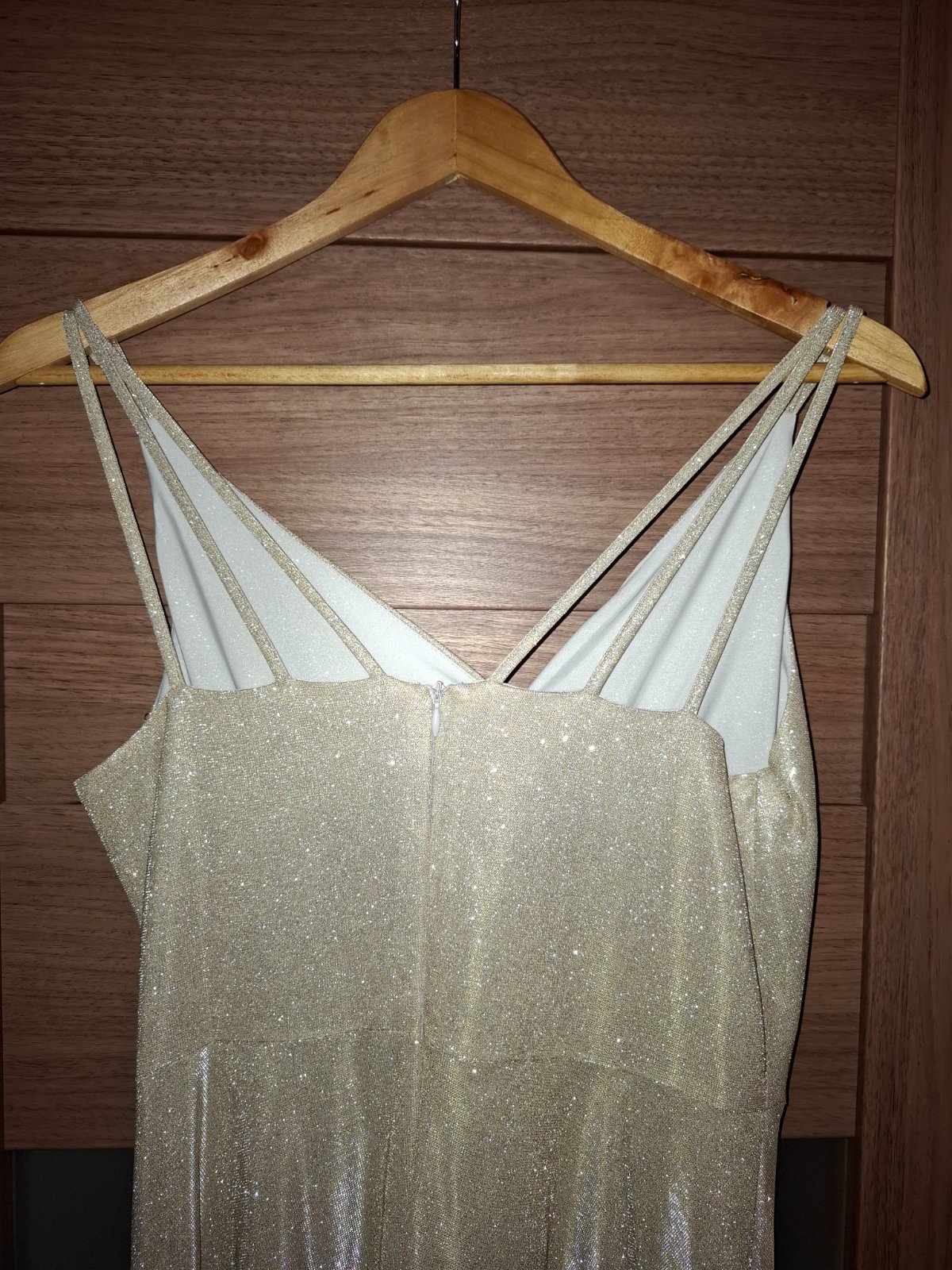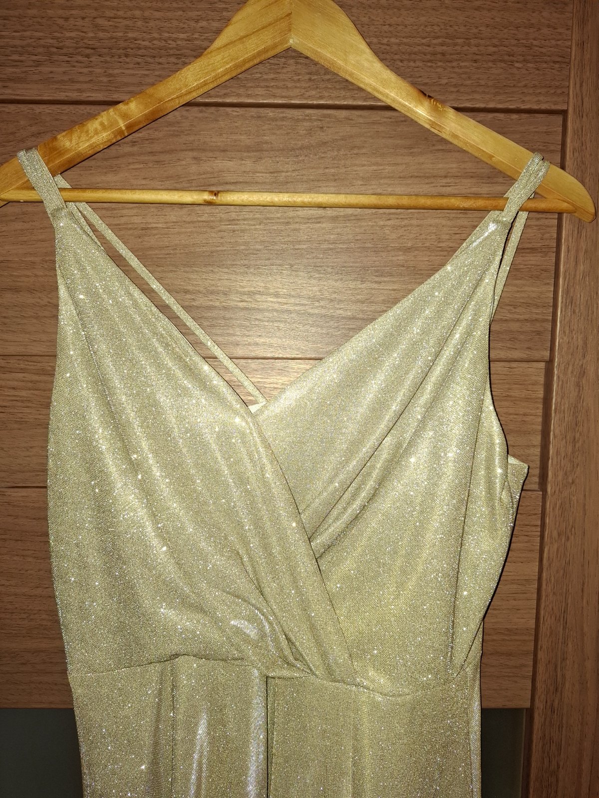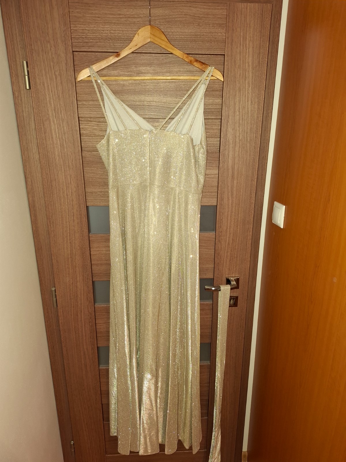 Zlaté trblietavé šaty oblečené 1x -Top stav. Na výšku 180cm (dĺźka šiat cca 155cm). Veľkosť 40.