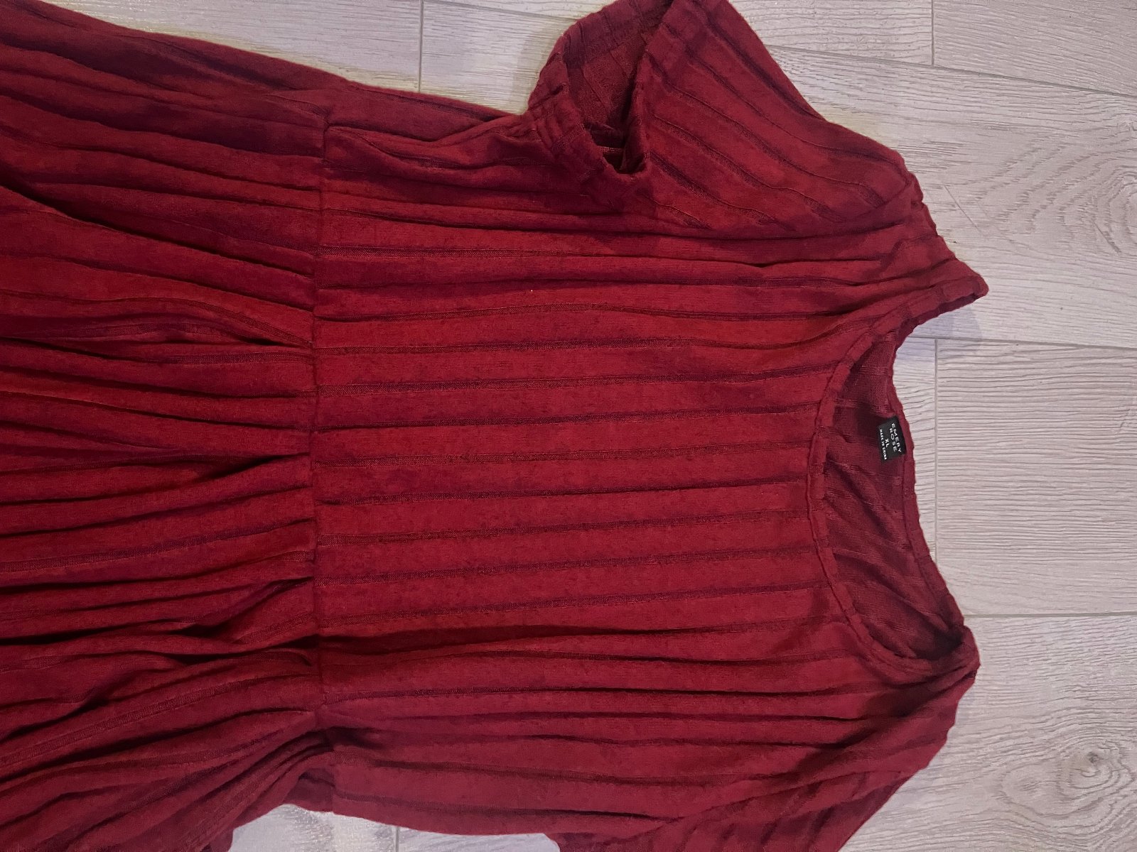 Dámske bordové šaty s krátkym rukávom z rebrovaného úpletu s okrúhlym výstrihom a dvoma vreckami.Príjemný materiál ani tenký ani hrubý.Farba pekná bordová nie ako na obrázku. Šaty sú nové nesedí mi veľkosť.Rozmery: poprsie 106cm, pás na gumku 92cm nariasené ešte môže povoliťo3-4cm,sú nariasené aj od zadu. Dĺžka šiat od pleca 100cm, dĺžka rukáva od pleca19cm.Šaty sú bez bižutérie.