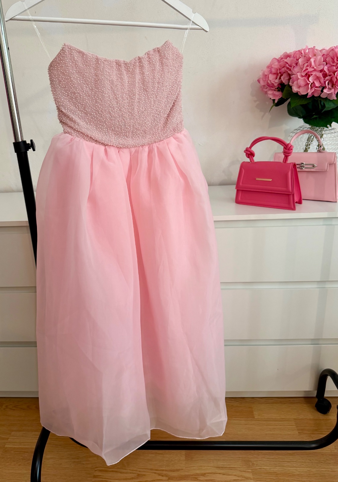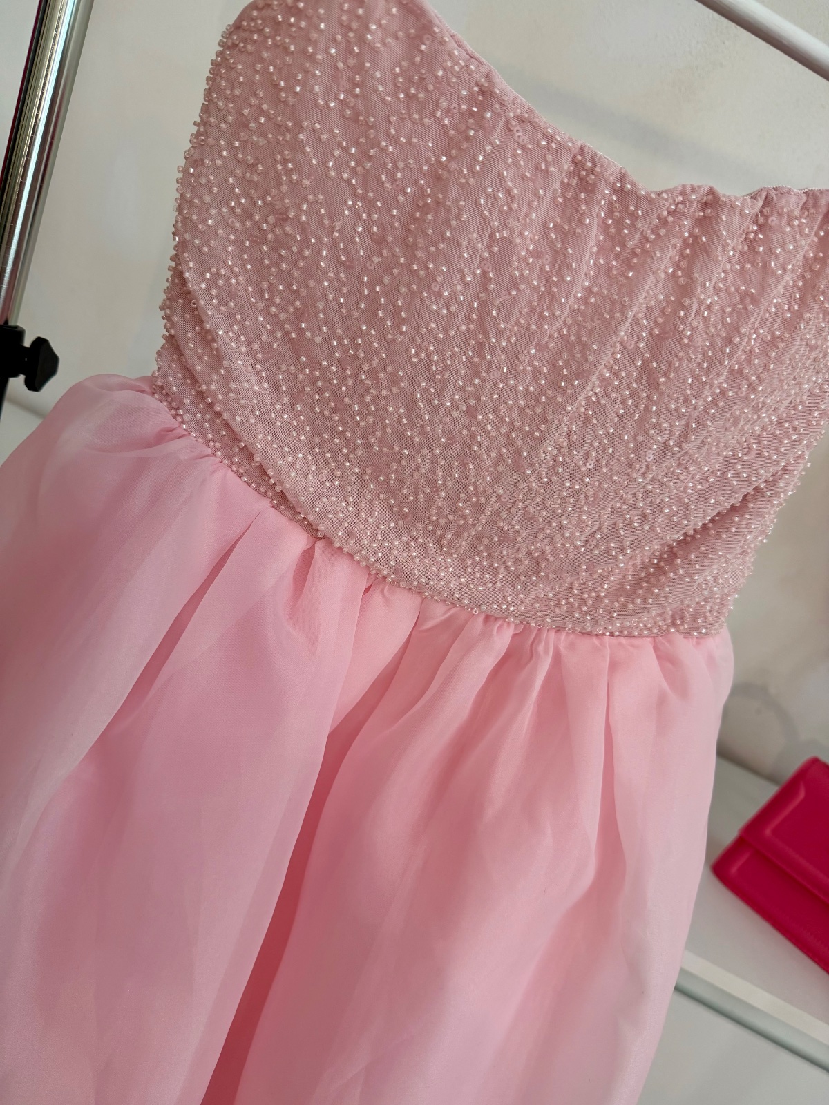 Vzdušná organzová midi sukňa dodáva šatám romantický a luxusný charakter – ideálny kúsok na svadbu, gala večer, ples alebo výnimočnú príležitosť.