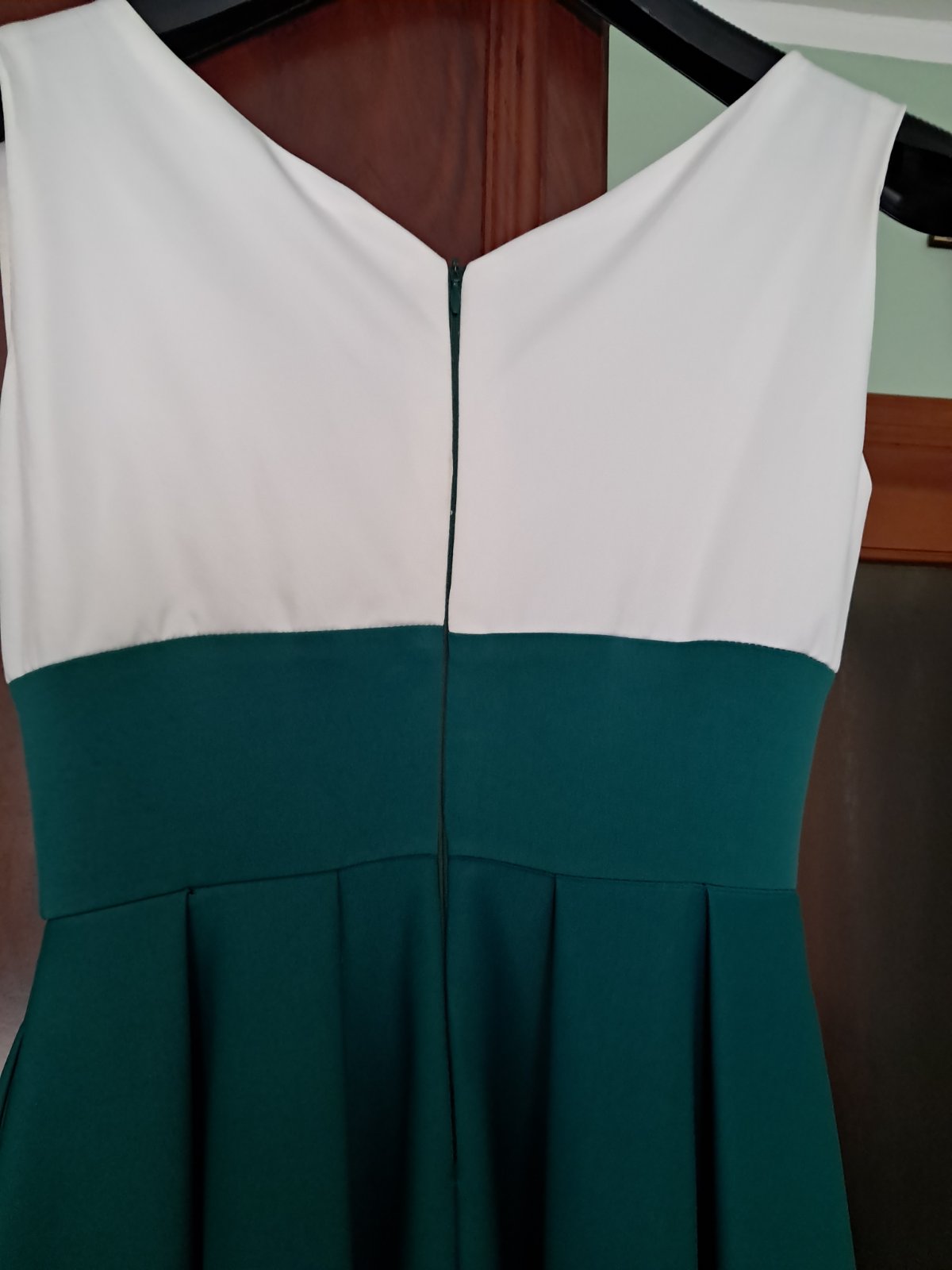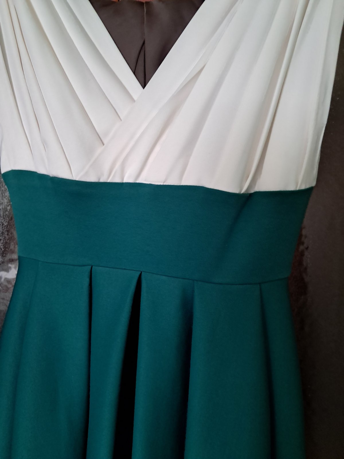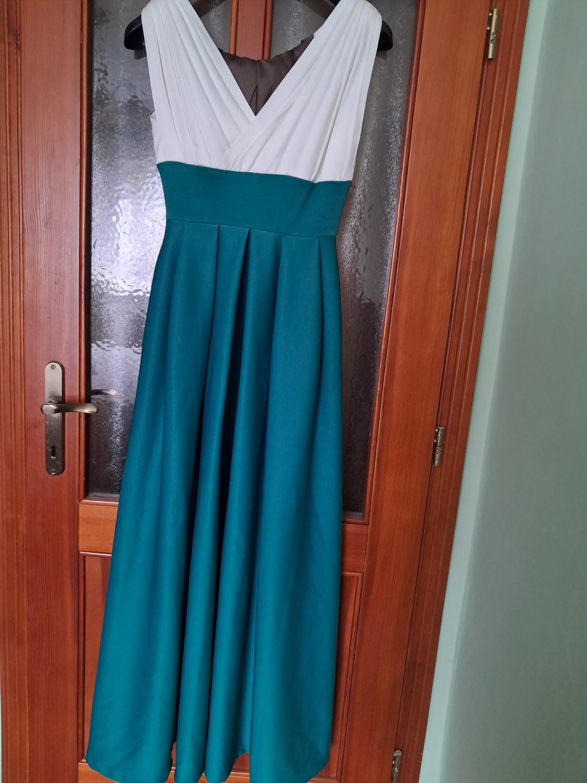Vhodné na stužkovú, ples, svadbu. Látka je ťažšia, padavá. Šaty maju vrecká. Sú to pôvodné šaty upravené profesionálnou krajčírkou. Dĺžka do vrchného okraja pásu: 31 cm, šírka opasku 9 cm, šírka v páse 72 cm, dĺžka od spodného okraja opasku dole: 109 cm, šírka šiat dole: 320 cm. Farba: snehovo-vanilkový vrch, smaragdový spodok. Šaty v tomto prevedení neboli nikdy oblečené.