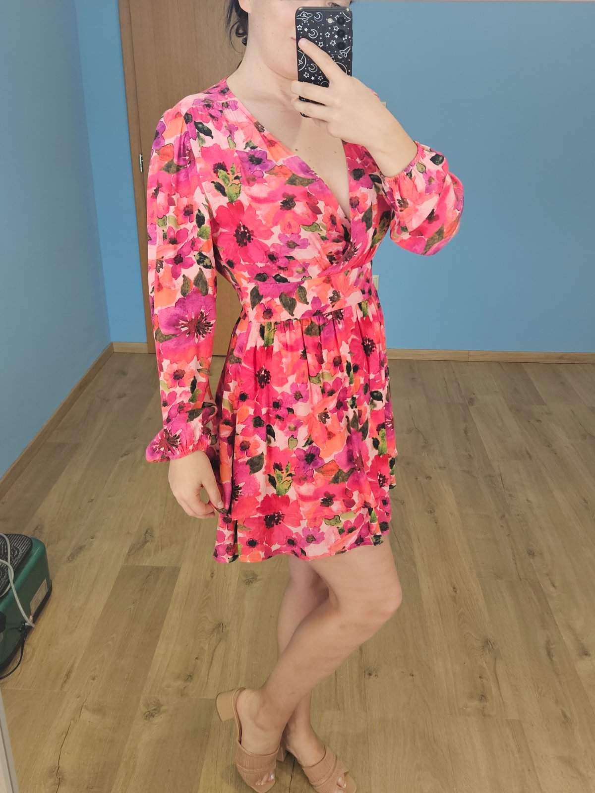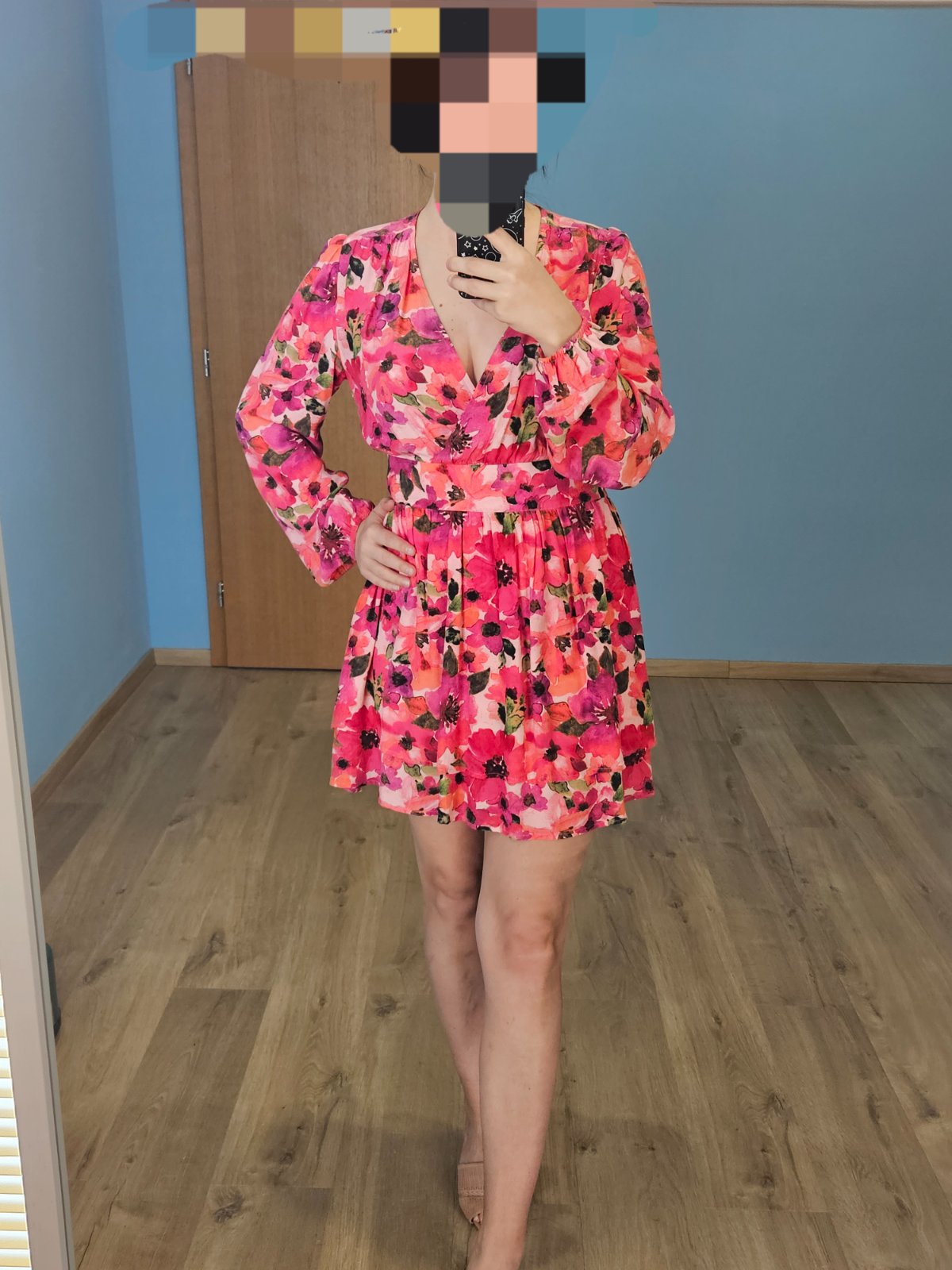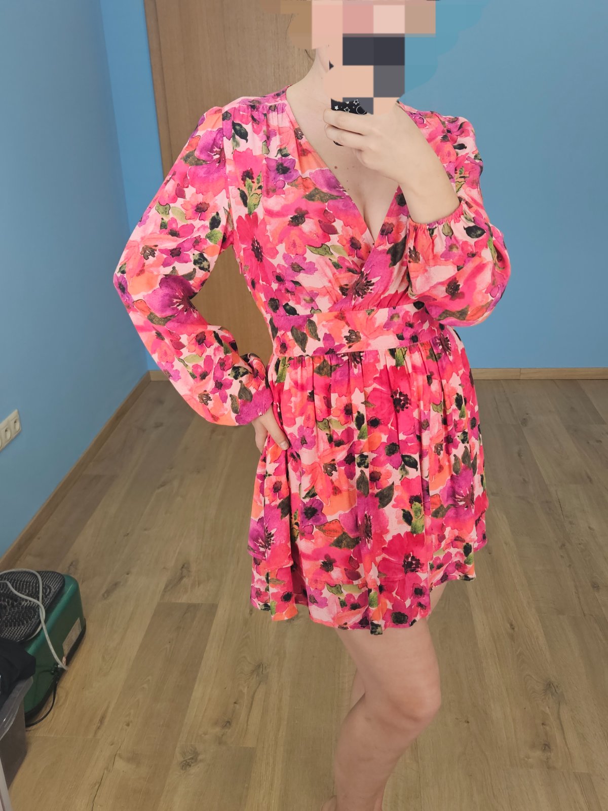 Predam krásne kvetinové šaty Mohito, oblečené 3-4x, stav 100%. Naboku majú zips, šírka v páse 36 cm, pás nie je elastický. Dĺžka 84 cm. Nikde nepresvitajú, spodná časť je dvojvrstvová. Farba je bledunko ružová s ružovými a červenými kvetmi.