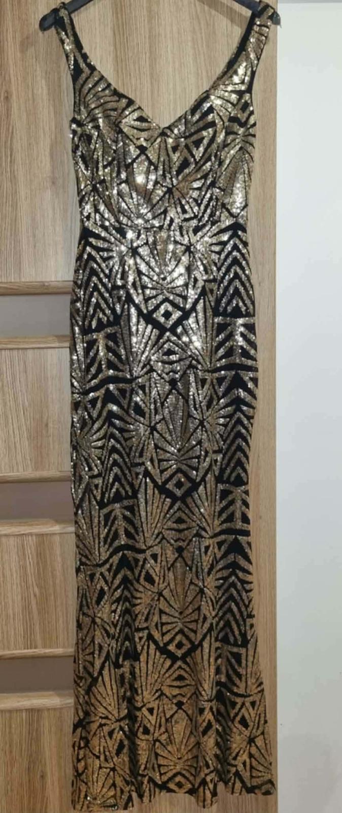 Predám zlaté šaty, šité na mieru, veľkosť cca 36, rozmery: celková dĺžka od ramena 142 cm, šírka v prsiach 39 cm. 0blečené len raz!! Cena + poštovné.